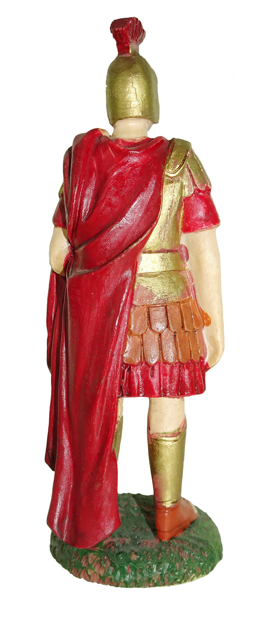 La statuina del soldato romano con gladio, in resina colorata e rifinita a mano, rappresenta un elemento che arricchirà sicuramente il vostro presepe tradizionale. Il soldato è raffigurato in posizione eretta, con il gladio (spada romana corta, a doppio taglio, con lama larga e a punta) nel fodero e l’arto destro allineato a lato del corpo. Veste un manto rosso scuro e un’armatura dorata, completa di elmetto, parastinchi e le tipiche calzature dei soldati romani. La fedeltà di riproduzione dei dettagli vi consentirà di ricreare scene molto realistiche. Questa statuina è adatta a essere usata nel presepe Landi da 10 cm. Il peso della statuina è di 50 gr, mentre il peso con imballo è di 63 gr. Le dimensioni della statuina sono 2,45 cm (larghezza), 10 cm (altezza), 5 cm (profondità), mentre le dimensioni dell'imballo sono di 4 cm (larghezza), 11 cm (altezza), 3,8 cm (profondità). A causa della pittura a mano, le tonalità dei colori potrebbero variare. Il presepe è una tradizione natalizia molto amata in Italia. L'usanza del presepe coinvolge famiglie che, con cura e devozione, allestiscono nel periodo di Natale il presepe con statuine rappresentanti la Natività e le persone che rendono omaggio a Gesù Bambino. Un'emozione unica, che unisce tradizione e spiritualità, si prova ammirando una ricostruzione creativa e simbolica della nascita di Gesù.