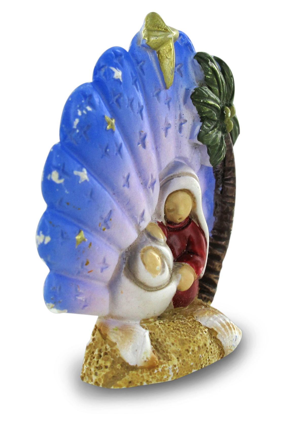 La Madonna – simbolo della tradizione del Natale - a forma di conchiglia ci presenta Maria con Gesù nella culla, i colori sono vivaci ed il materiale è resina.