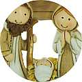 Il soprammobile natalizio, in resina colorata, rappresenta una piccola scena con Giuseppe e Maria con Gesù Bambino nella culla. Madre e padre si rallegrano per la nascita del Bambino. La scena si completa con la capanna con sfondo aperto e la stella cometa. I personaggi risultano in rilievo rispetto alla capanna. La piccola Sacra Famiglia misura solo 7,5 cm d'altezza e 6,5 cm di larghezza. Lo spessore contenuto rende questa graziosa decorazione natalizia perfetta anche per piccoli spazi quali comodini o piccole mensole. Lo stile dei personaggi, caratterizzato da volti paffuti, ricorda un po' le raffigurazioni dei cartoni animati e rende la piccola natività un regalo ideale per bambini o per alunni del catechismo.