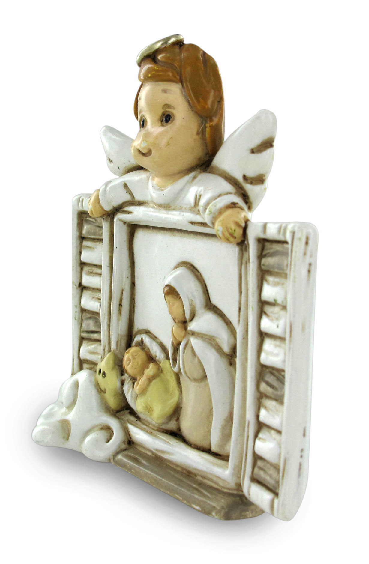Il piccolo quadretto in resina bianca rappresenta un angioletto sopra a una finestra aperta. All'interno, sono raffigurati la Madonna con le mani conserte in segno di preghiera e il Bambino nella culla.