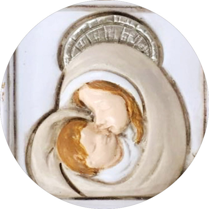 Il piccolo quadretto in resina bianca rappresenta un angioletto sopra a una finestra aperta. All'interno, sono raffigurati la Madonna intenta a baciare il Bambino che tiene in braccio.