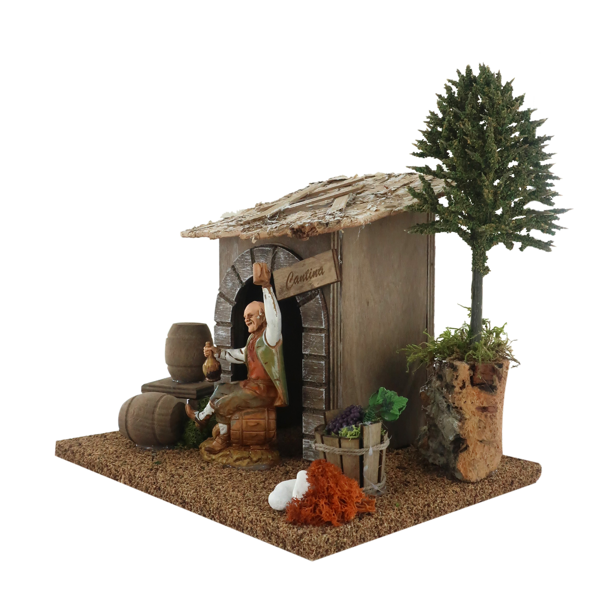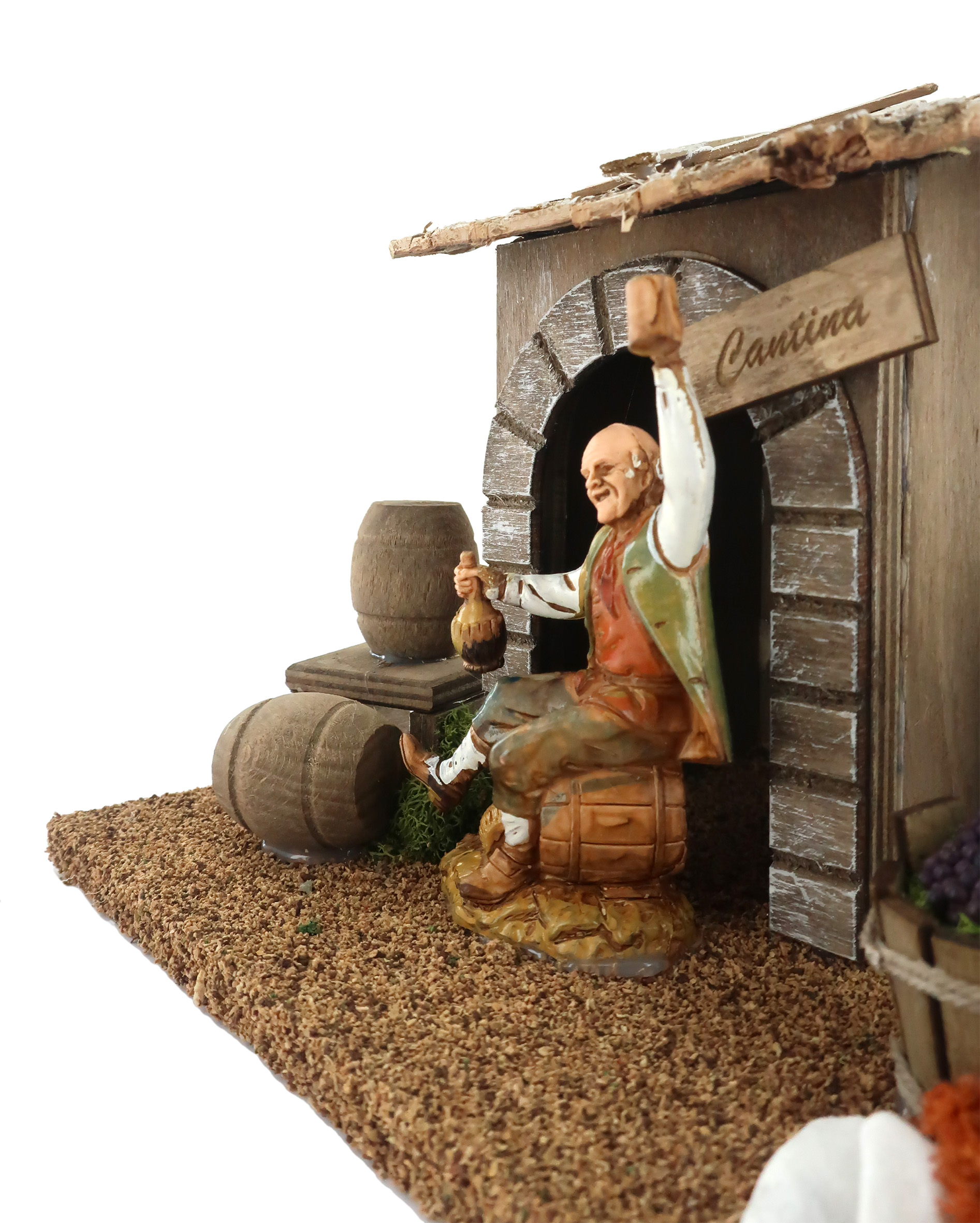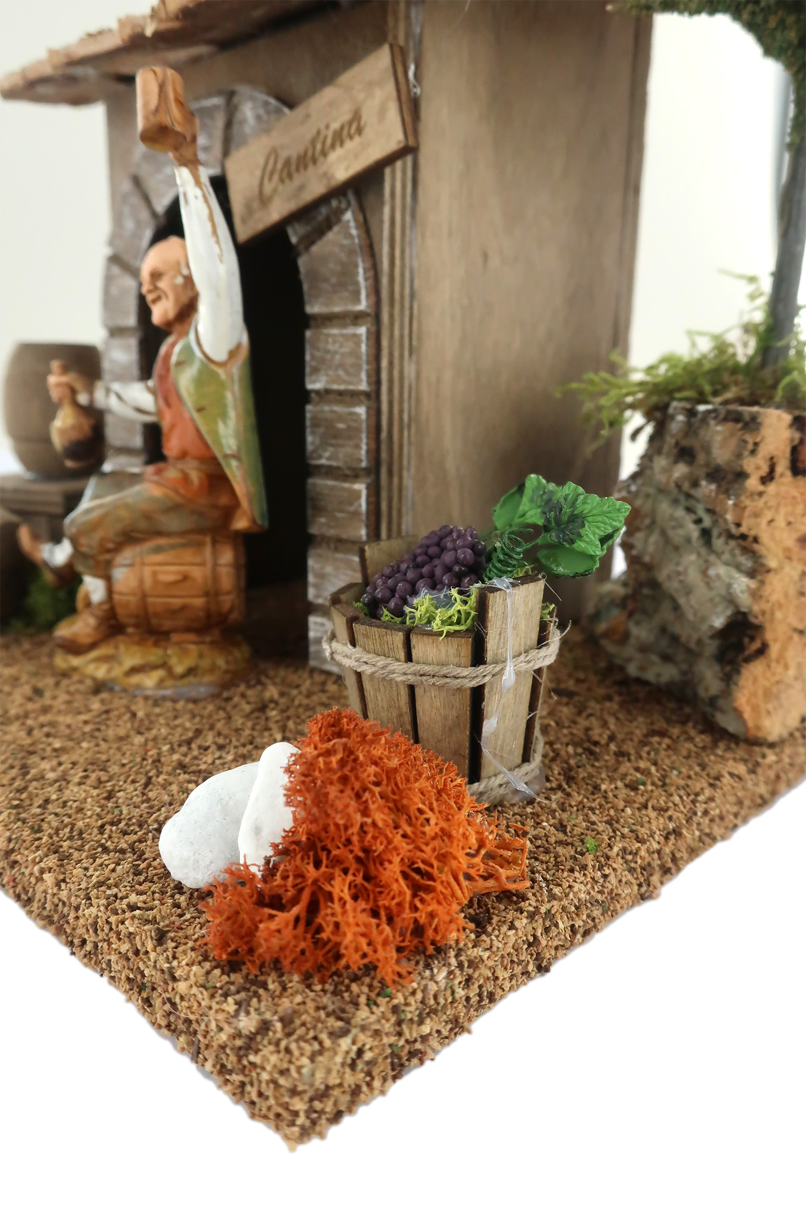 Accessori per presepe: Cantina con bevitore ubriaco. Dimensioni: 19 x 15 x 16 cm. Materiali: plastica, legno, sughero e muschio. Realizzato artigianalmente in Italia.