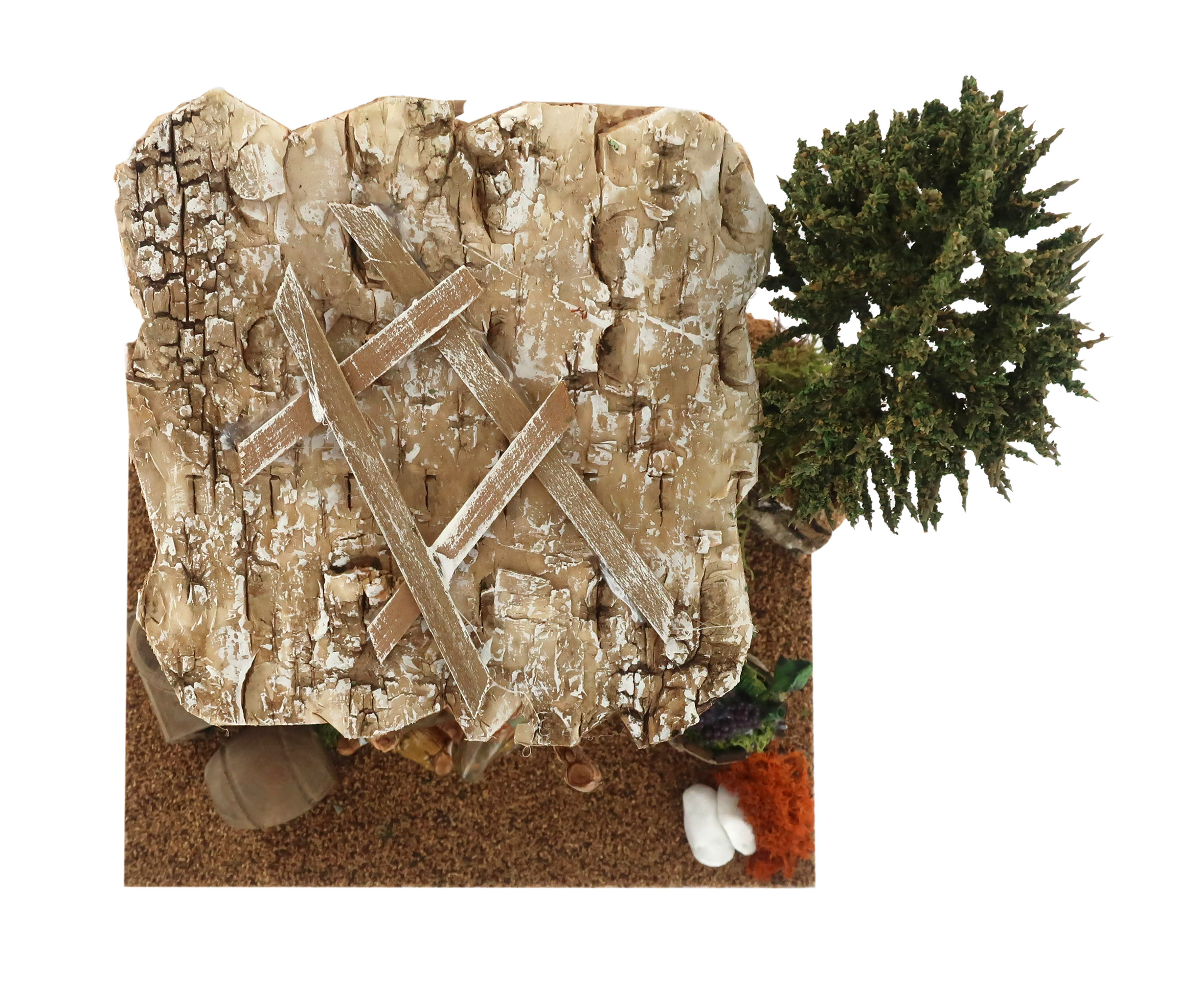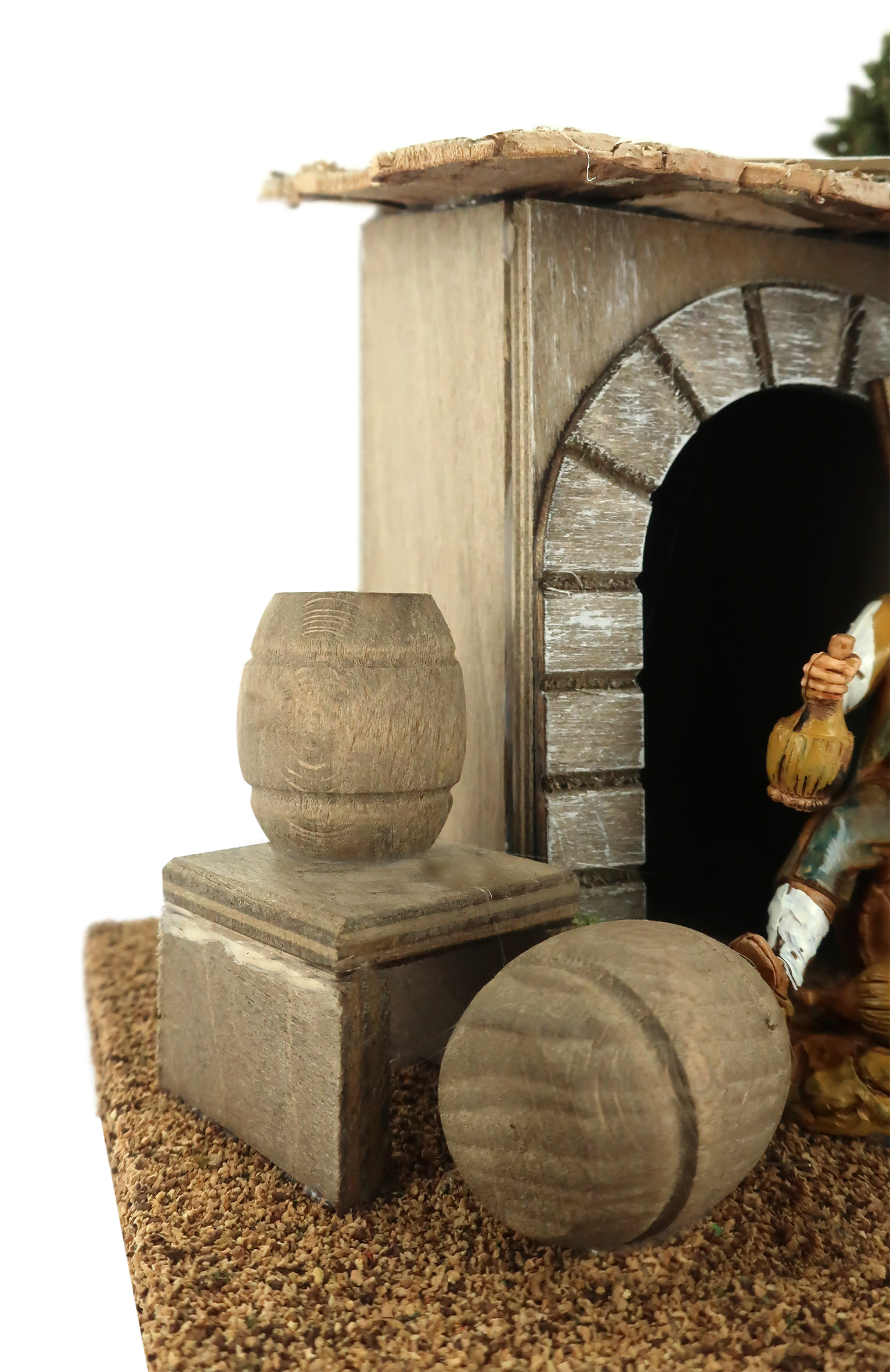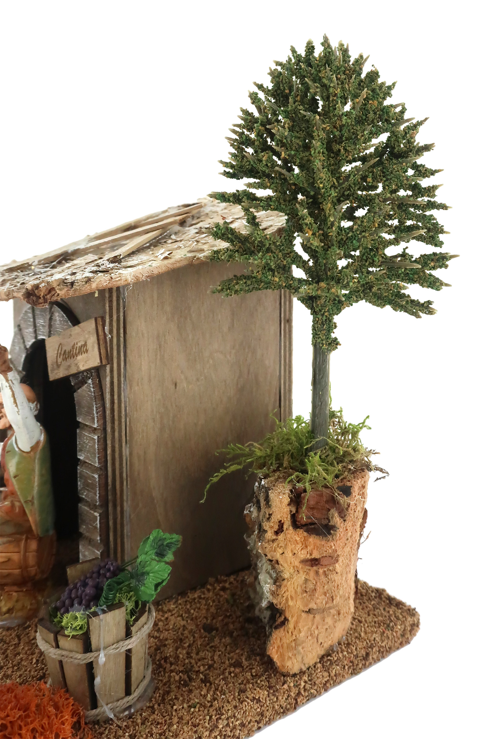 Accessori per presepe: Cantina con bevitore ubriaco. Dimensioni: 19 x 15 x 16 cm. Materiali: plastica, legno, sughero e muschio. Realizzato artigianalmente in Italia.