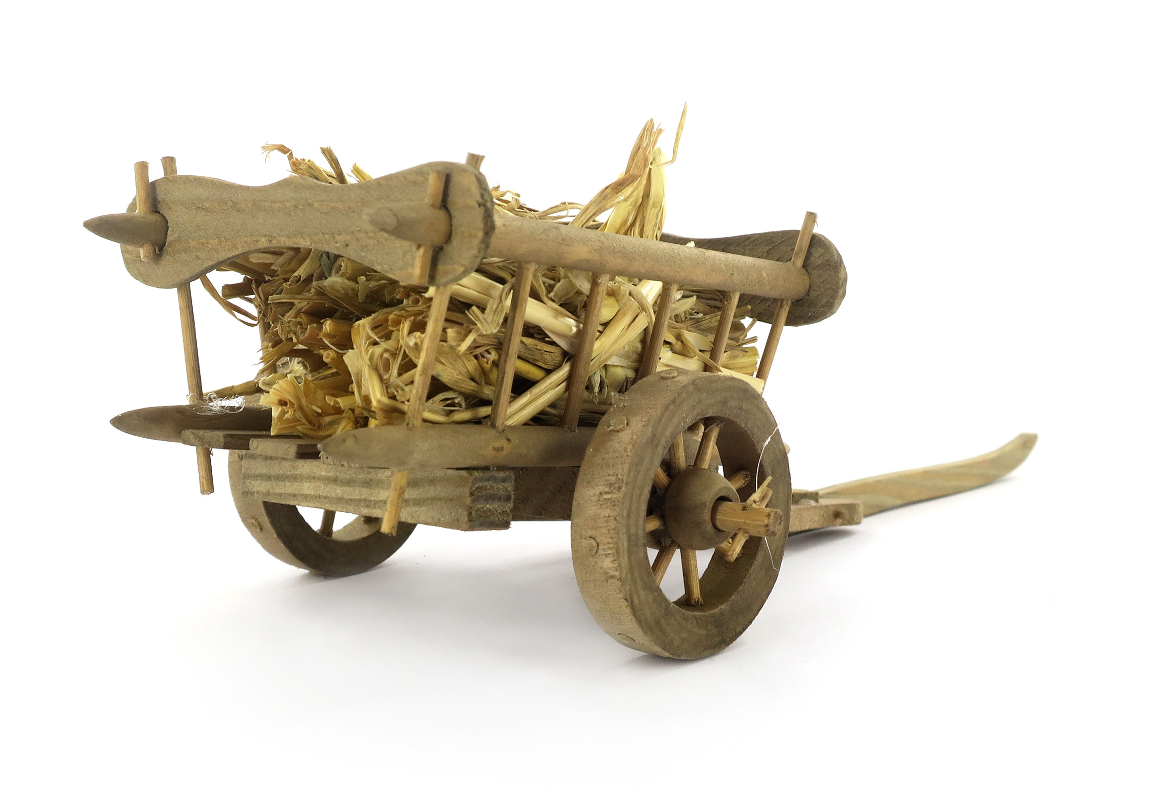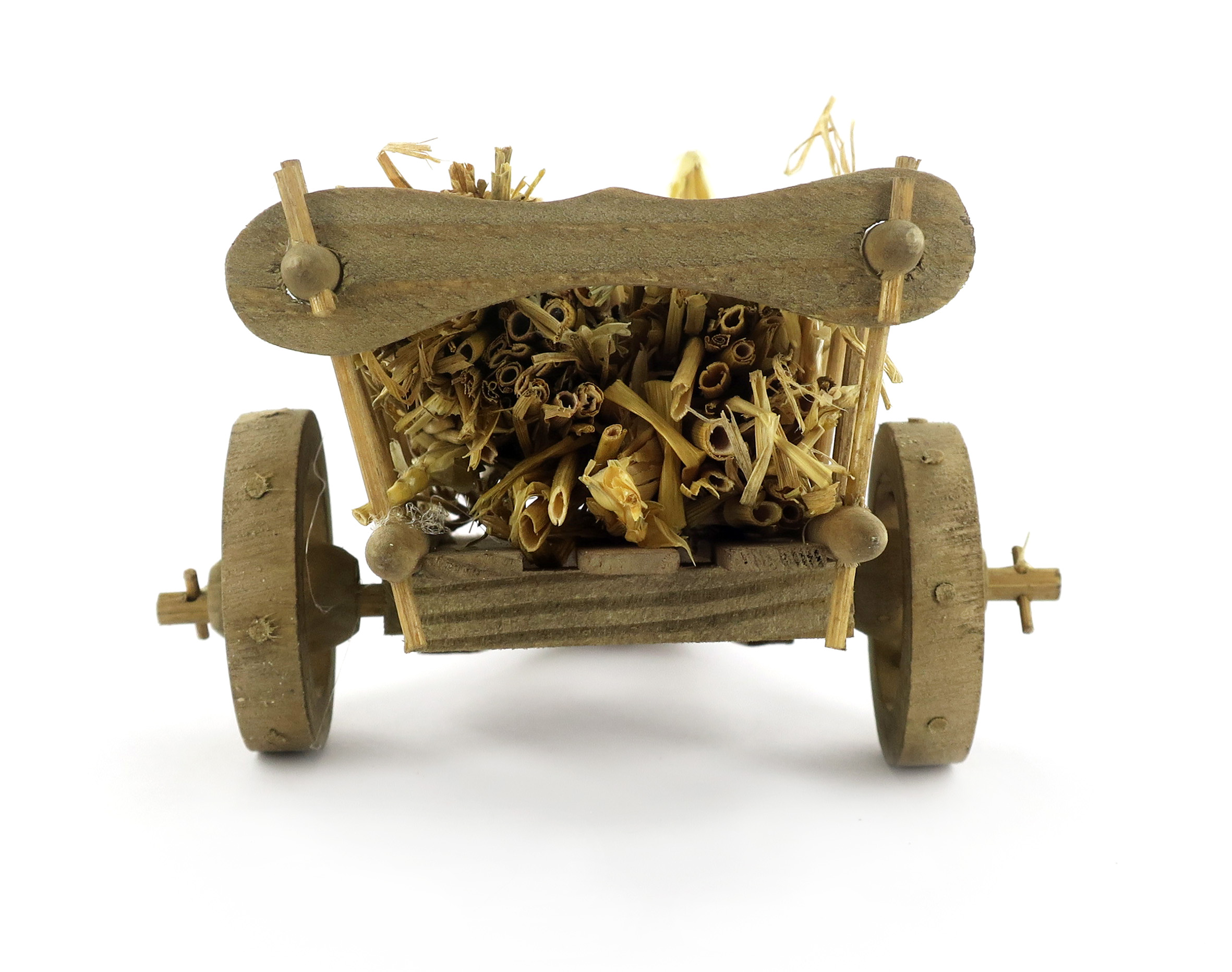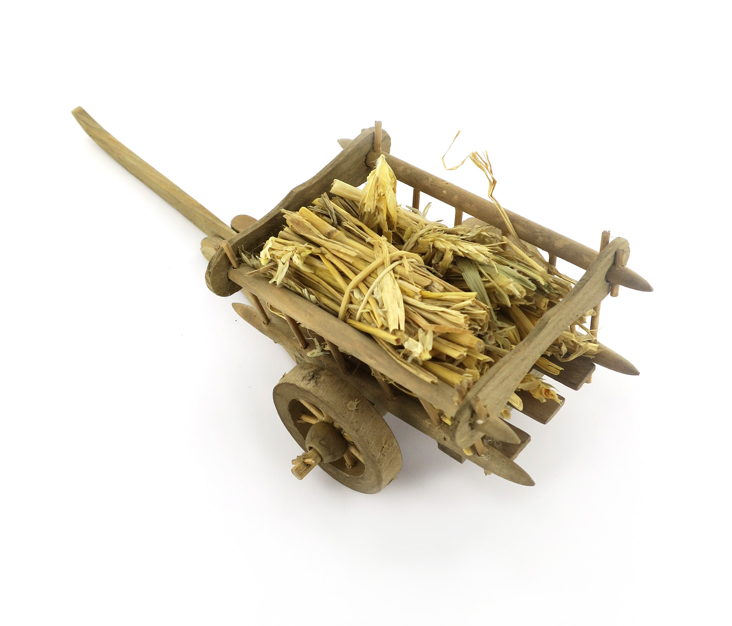 Accessori per presepe: Carretto in legno con carico di paglia. Dimensioni: 10 x 14 x 6 cm. Materiali: legno e paglia. Realizzato artigianalmente in Italia.