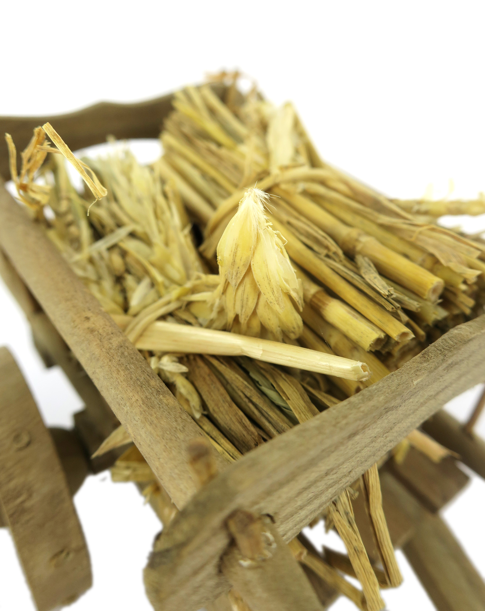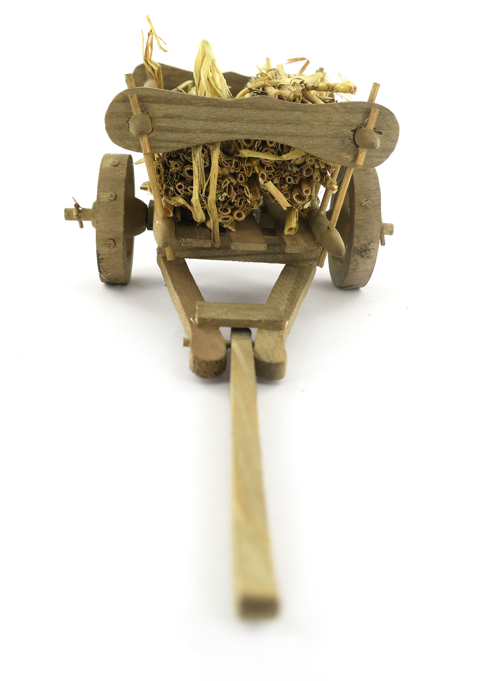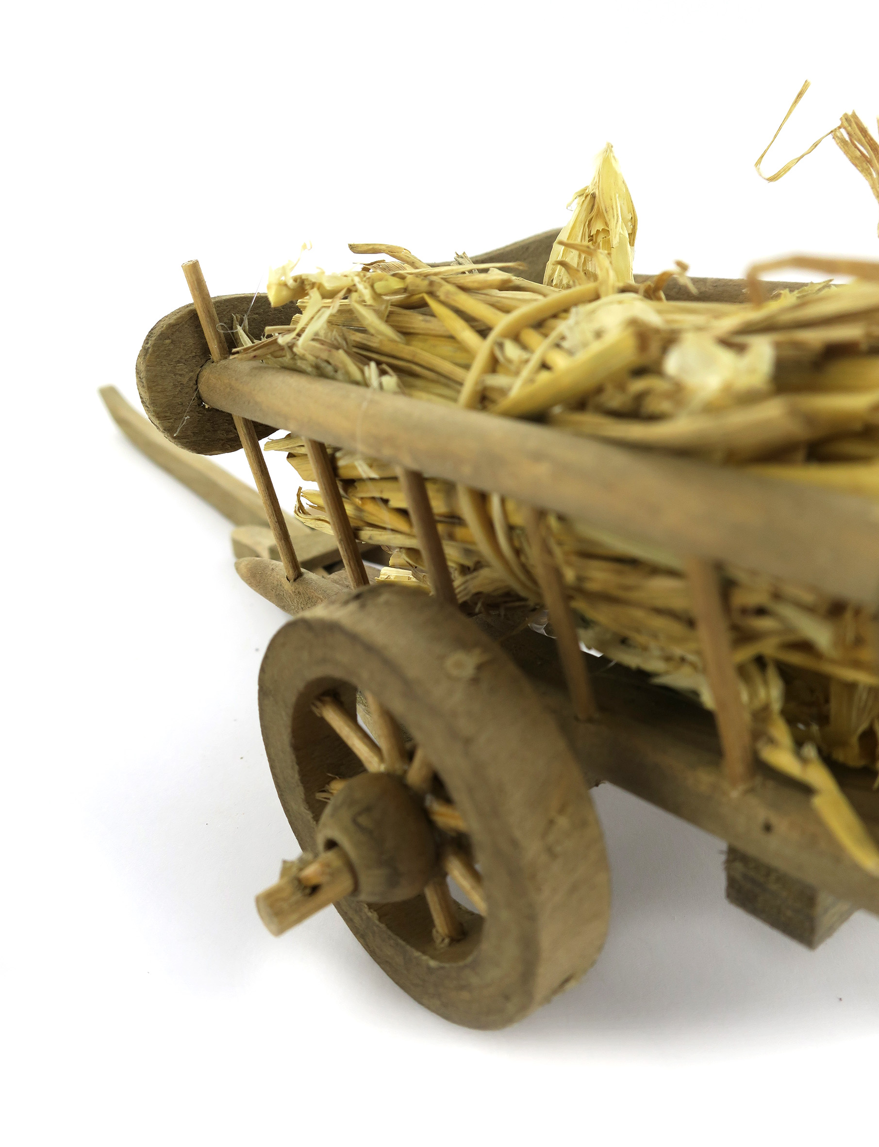 Accessori per presepe: Carretto in legno con carico di paglia. Dimensioni: 10 x 14 x 6 cm. Materiali: legno e paglia. Realizzato artigianalmente in Italia.