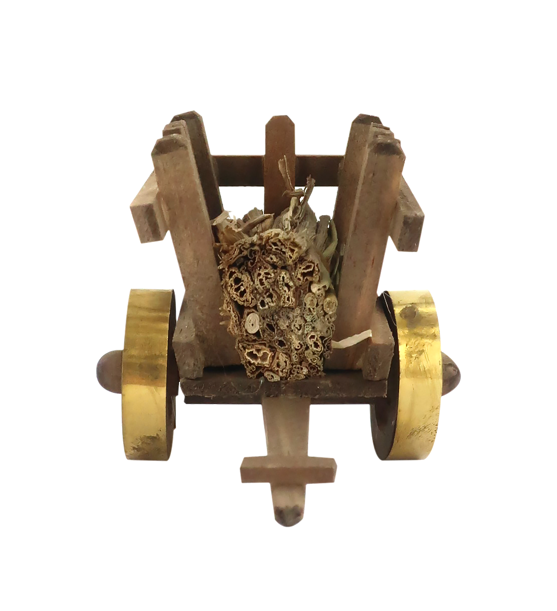 Carretto a singolo asse, per presepe. Dimensioni: 8 x 14 x 8 cm. Materiali: Legno e fieno. Realizzato artigianalmente in Italia.
