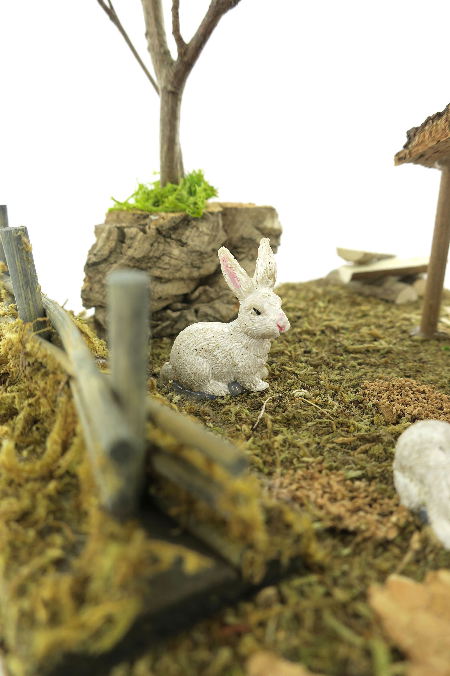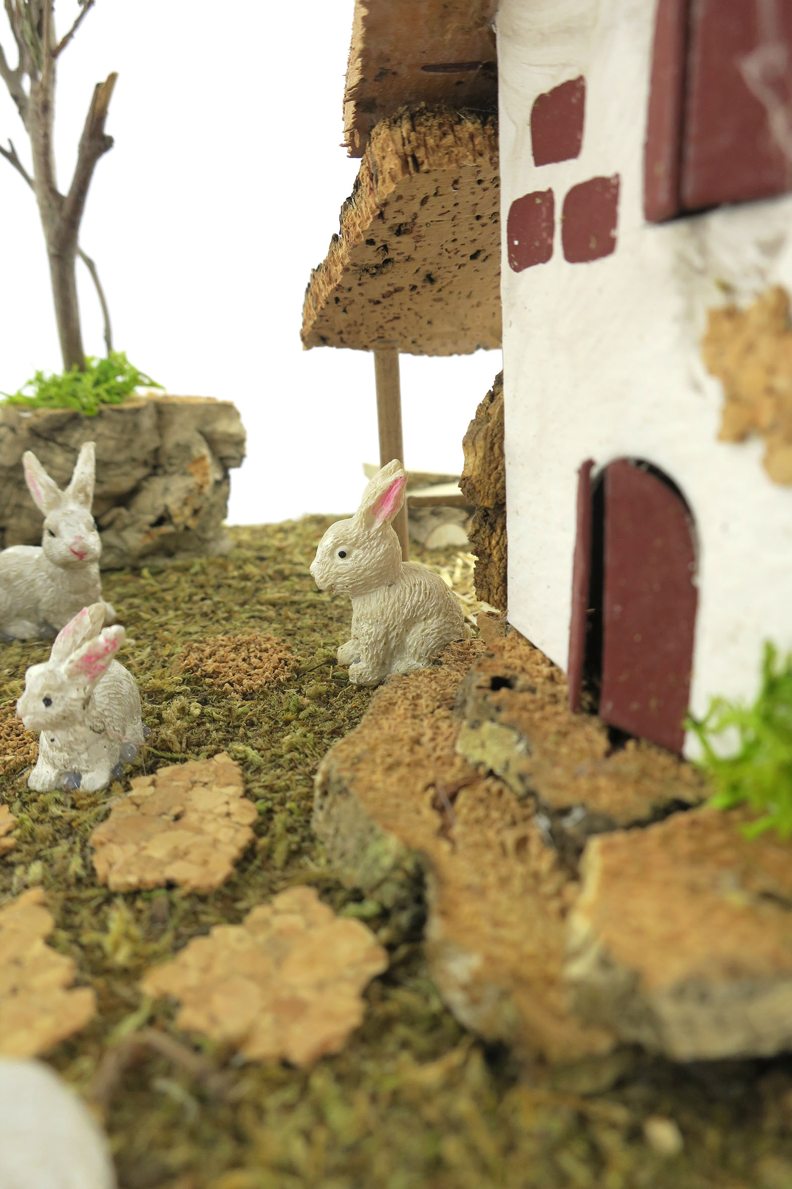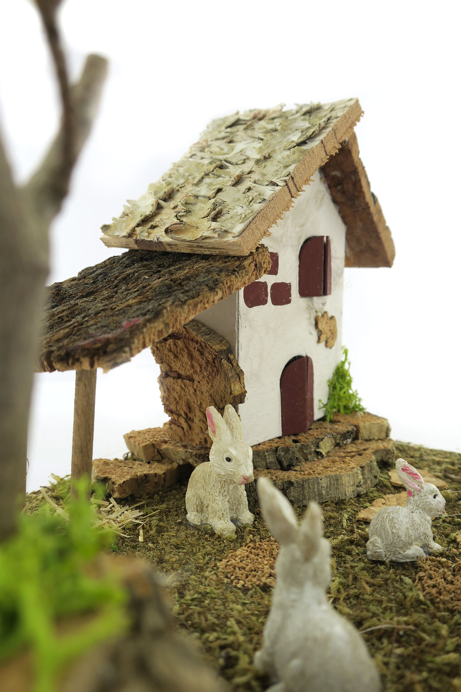 Dimensioni: 19 x 15 x 14 cm. Materiali: Legno, sughero, muschio, lichene e cartone (conigli in resina). Realizzato artigianalmente in Italia.