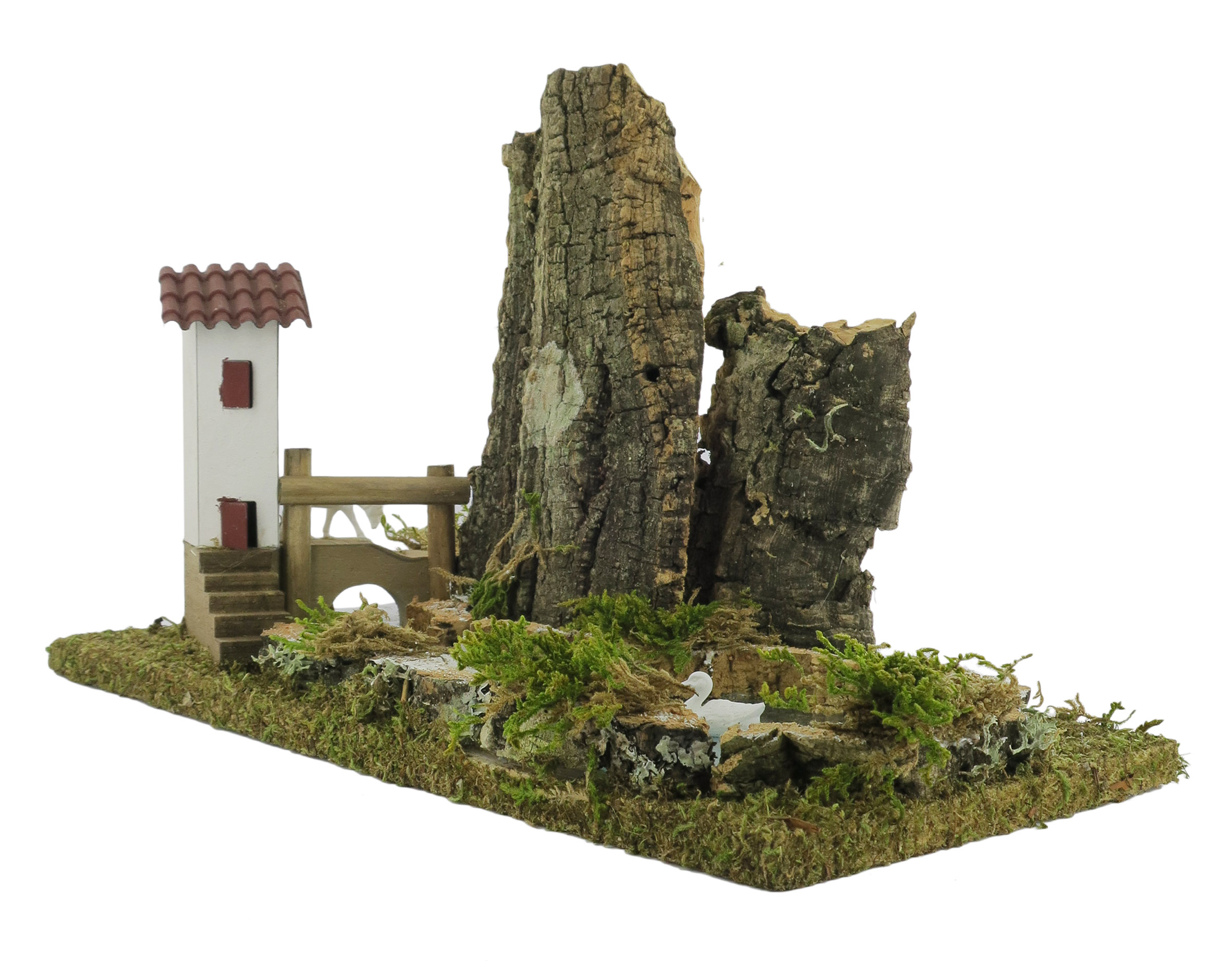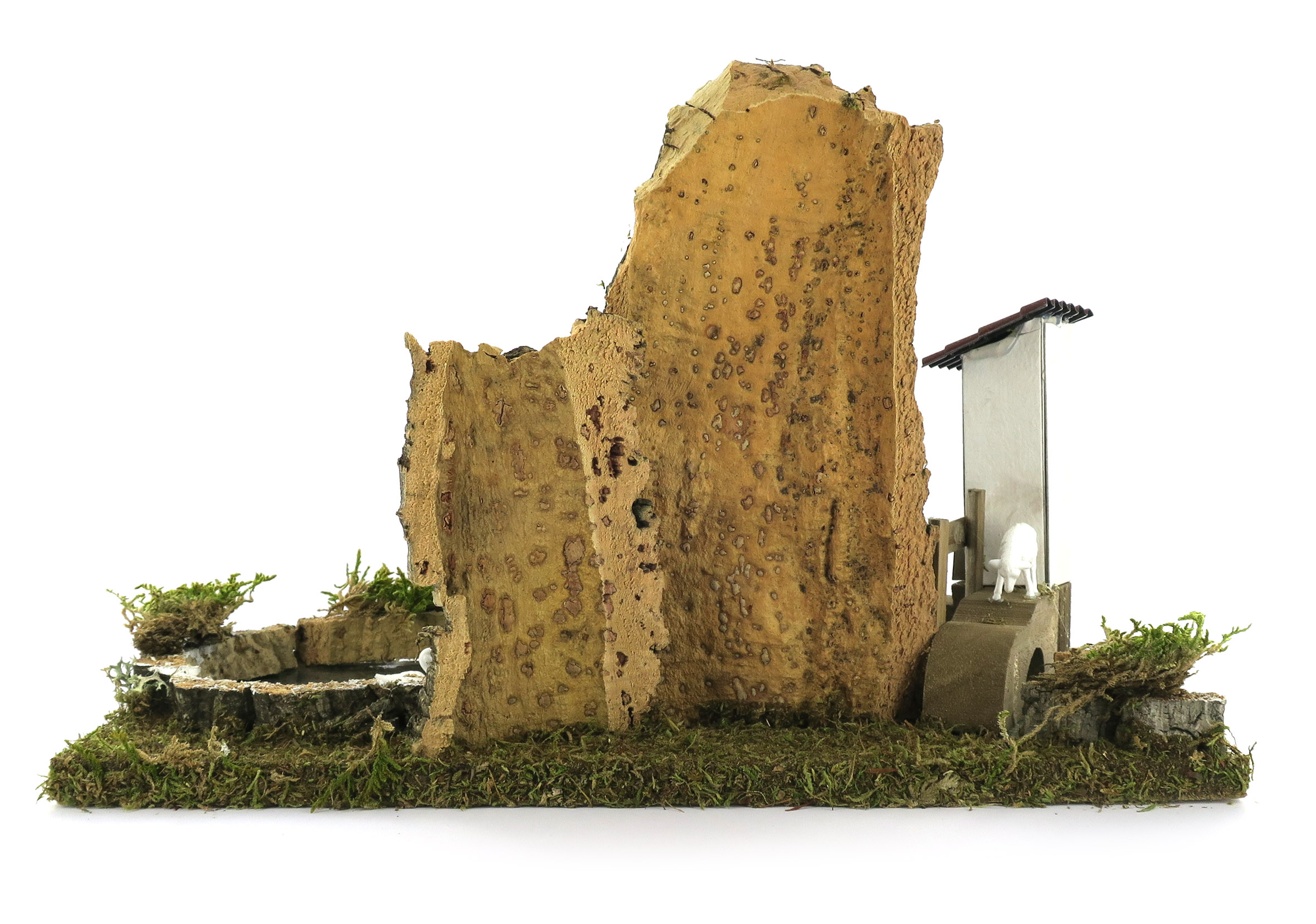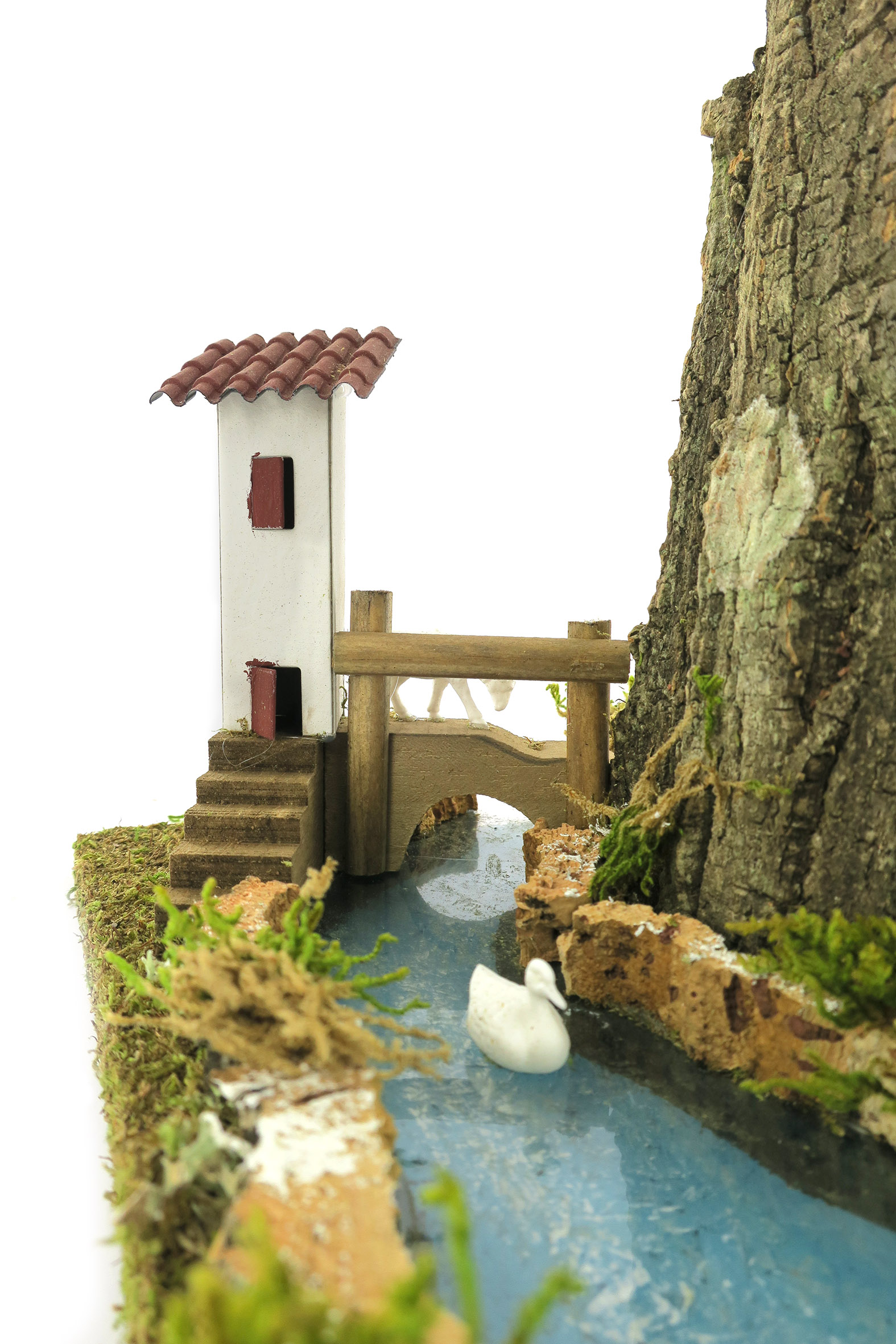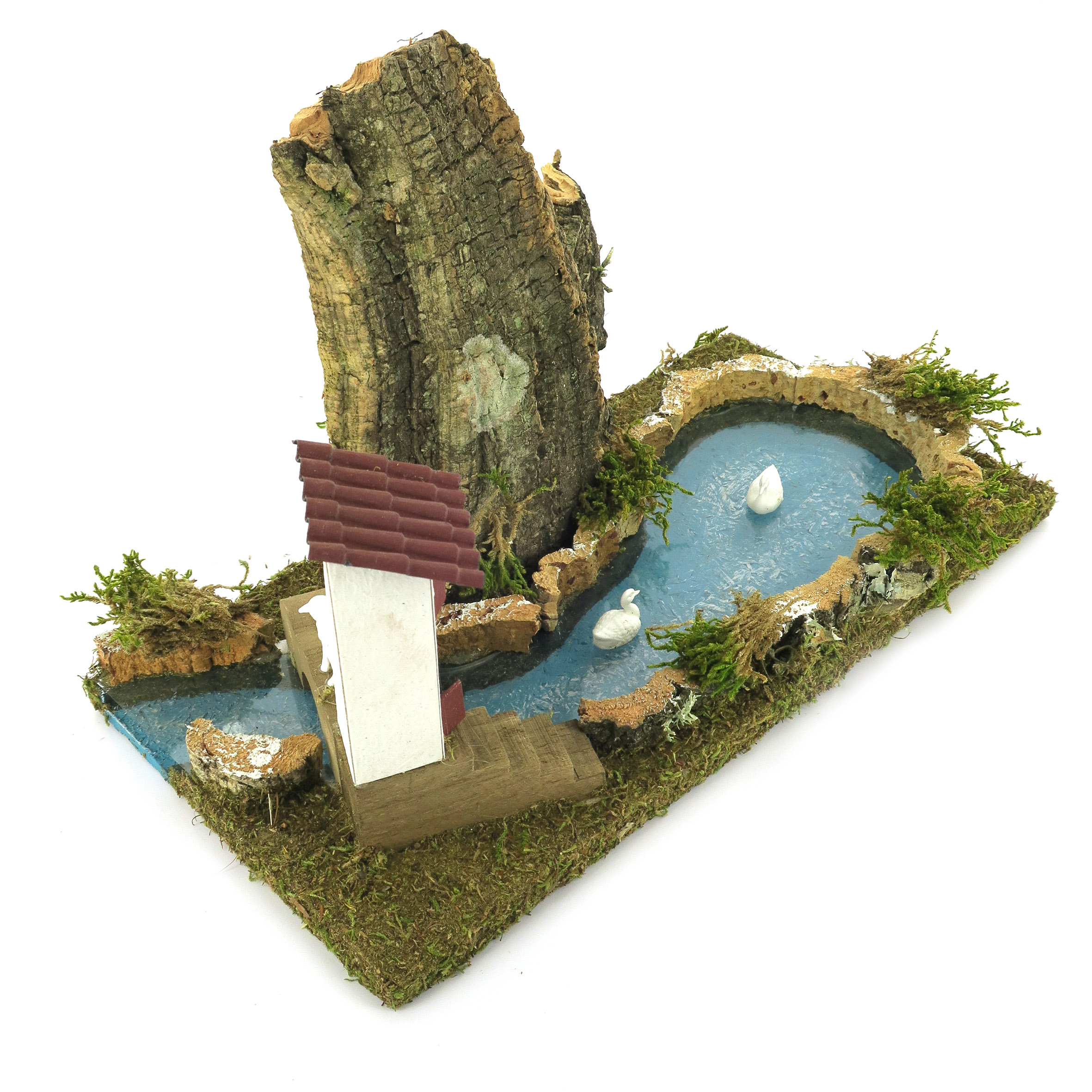 Accessori per presepe: Laghetto con parete rocciosa in sughero, casetta e ponticello.