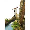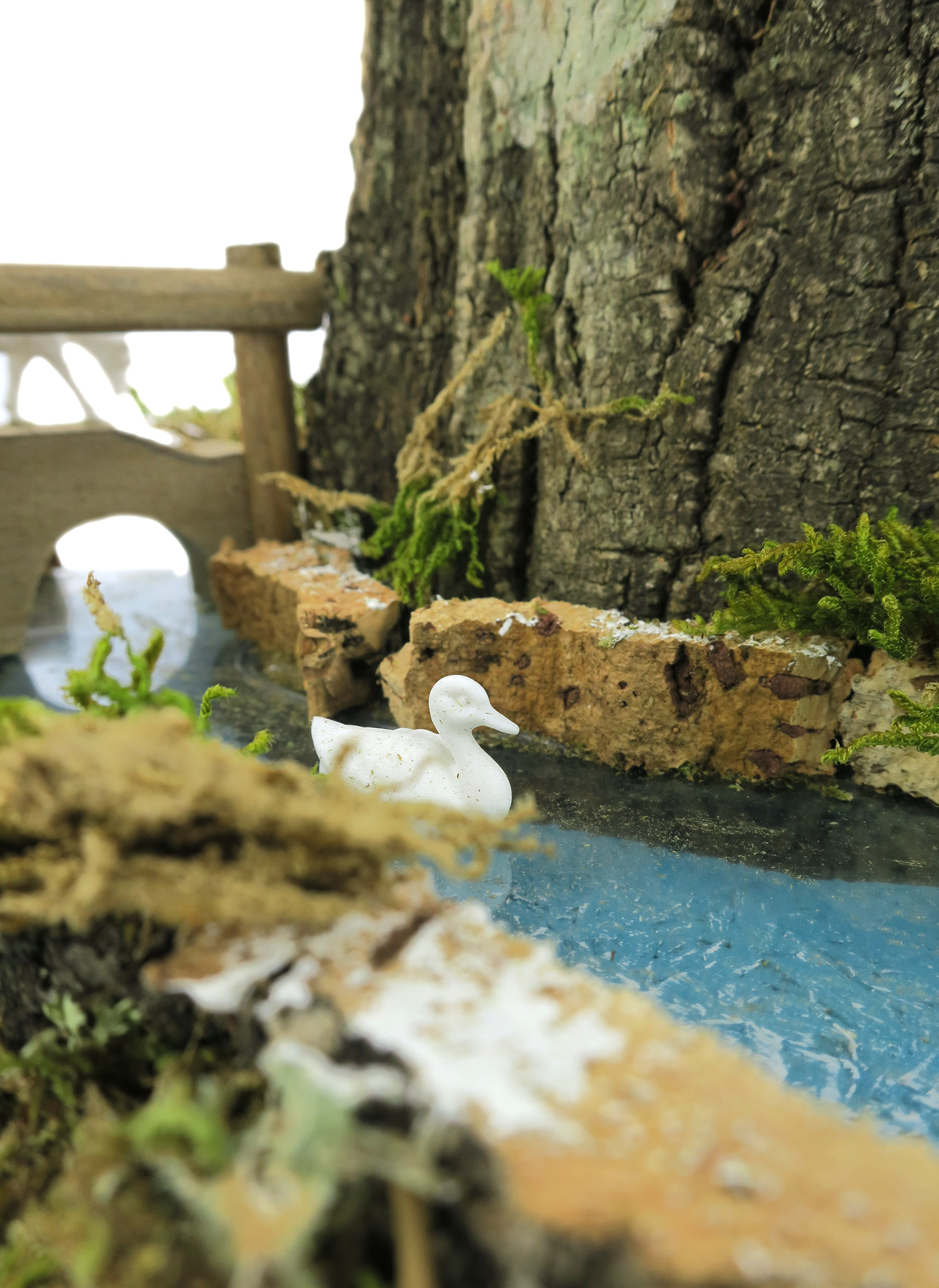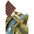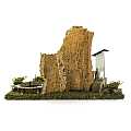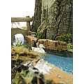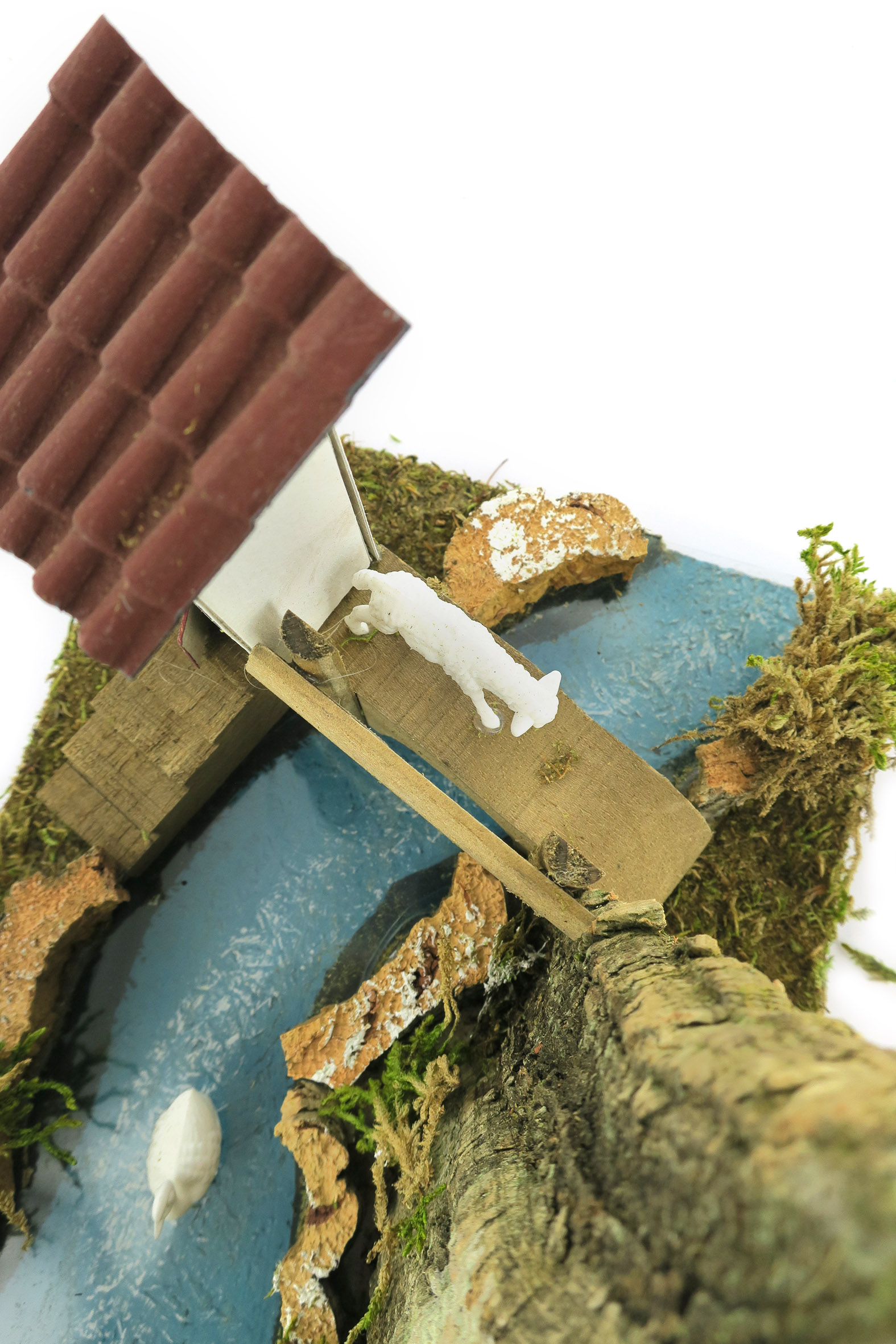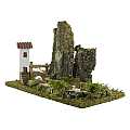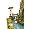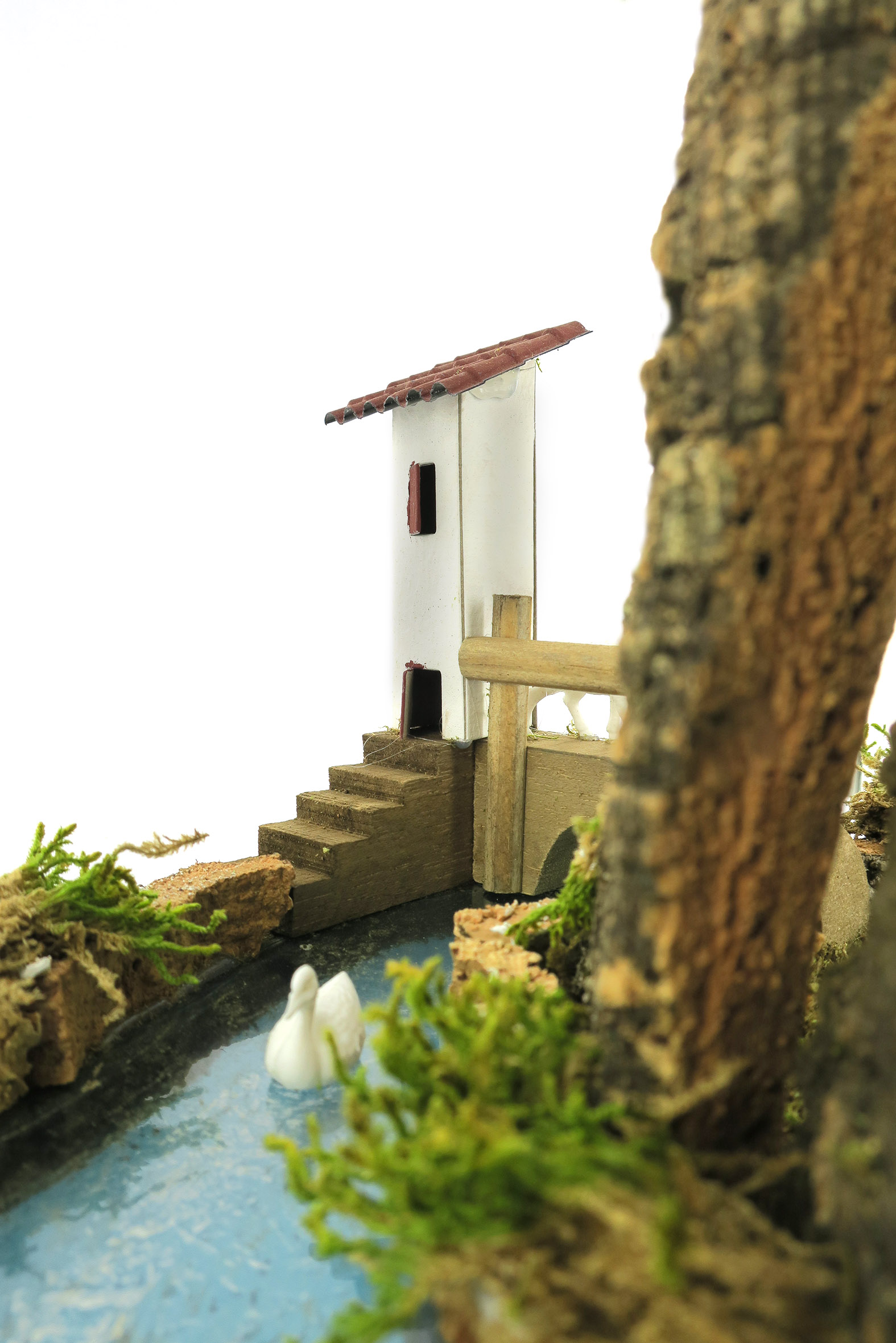Accessori per presepe: Laghetto con parete rocciosa in sughero, casetta e ponticello.