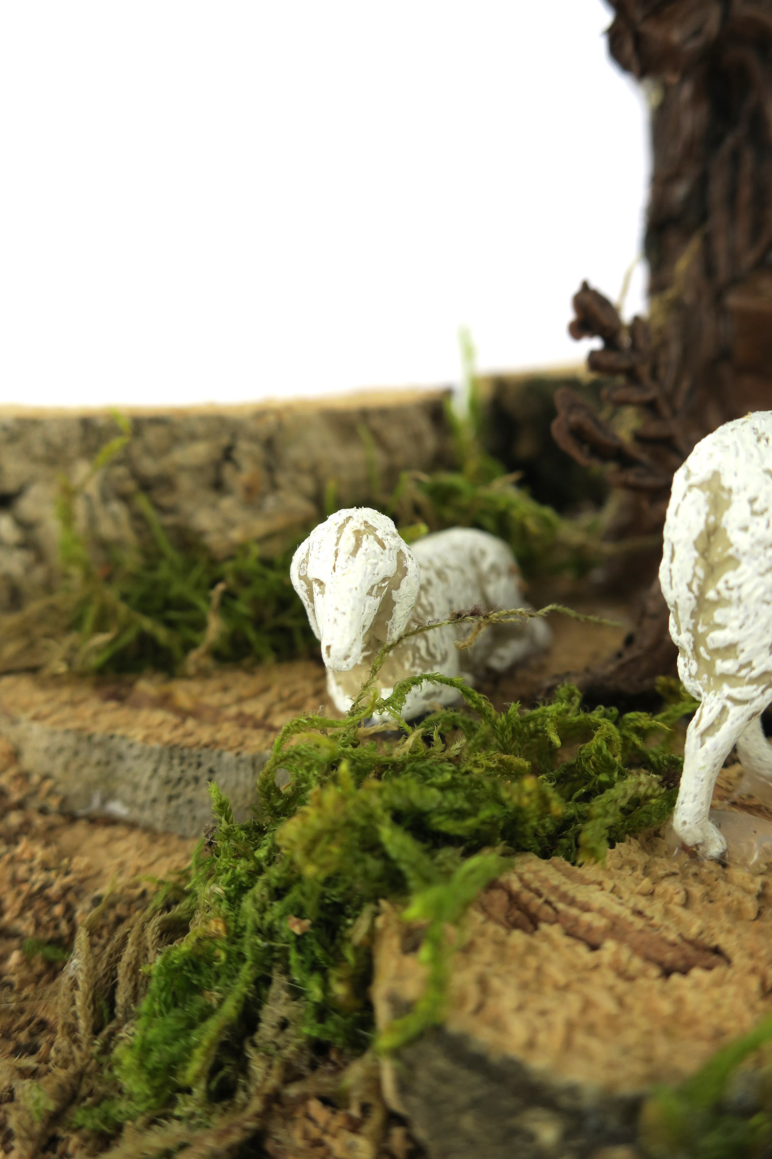 Accessori per presepe: Ulivo Sulla Collina Con Pecore. Materiali: legno, sughero, muschio e plastica. Dimensioni: 16 x 10 x 18 cm. Realizzato artigianalmente in Italia.