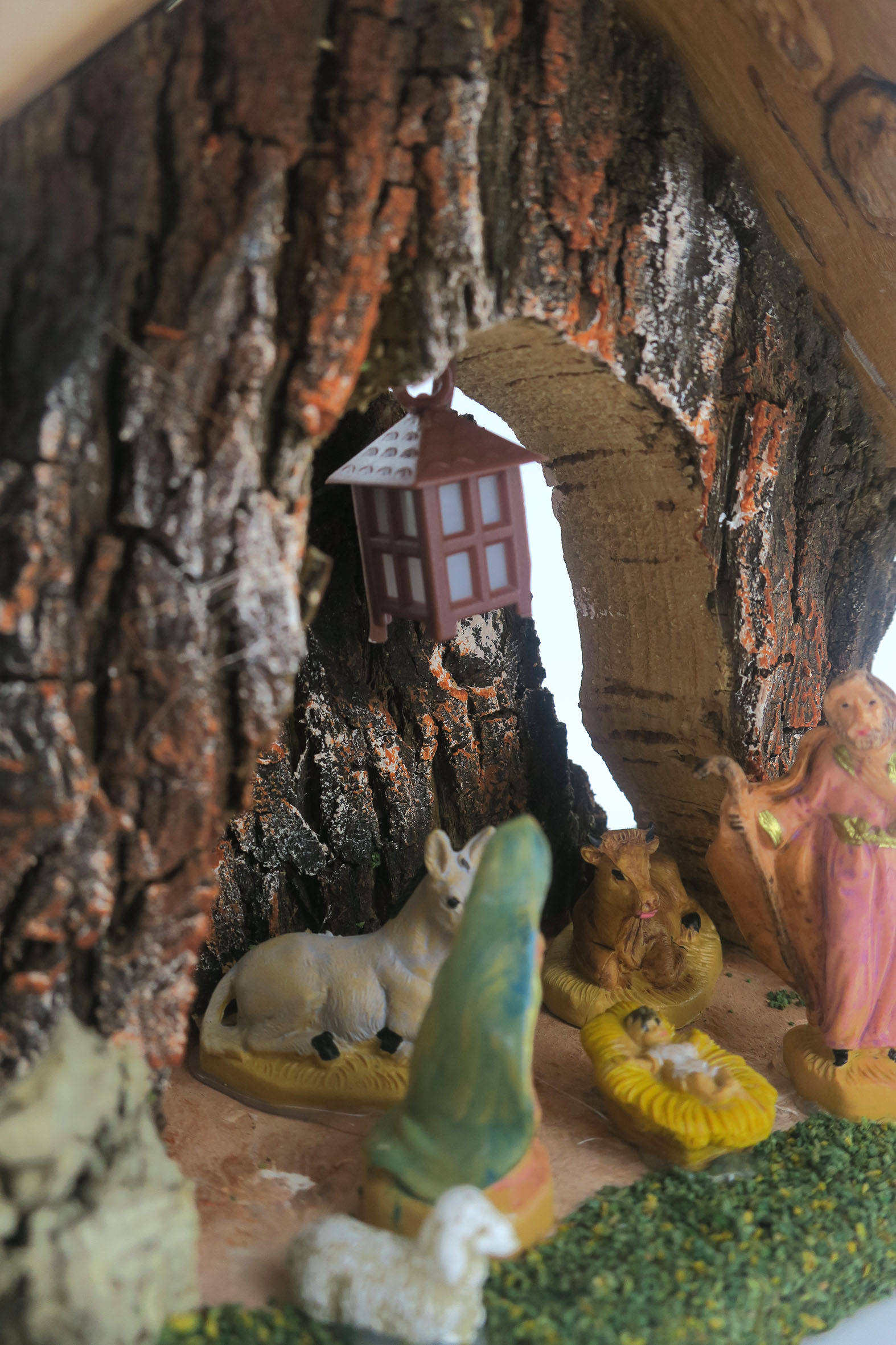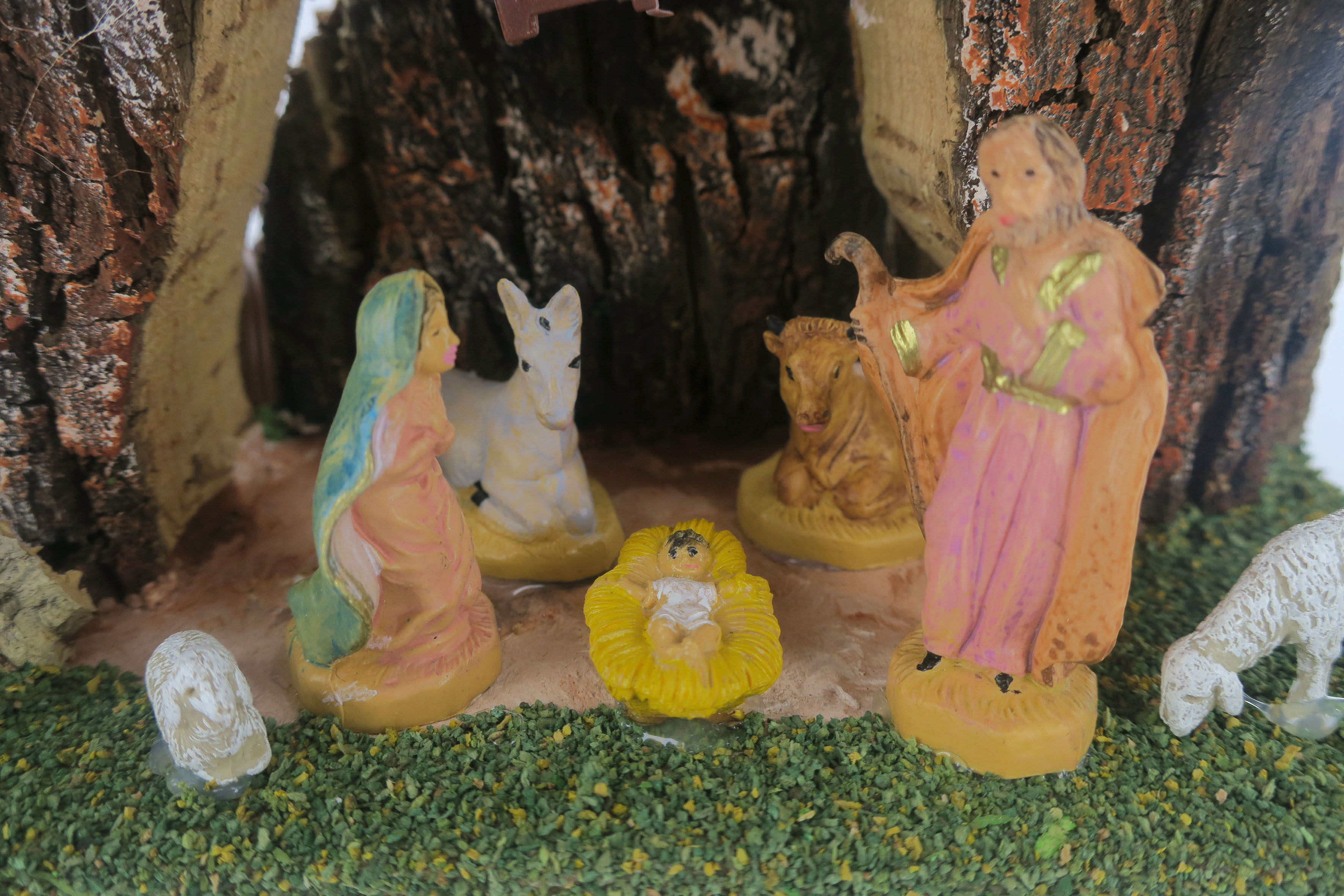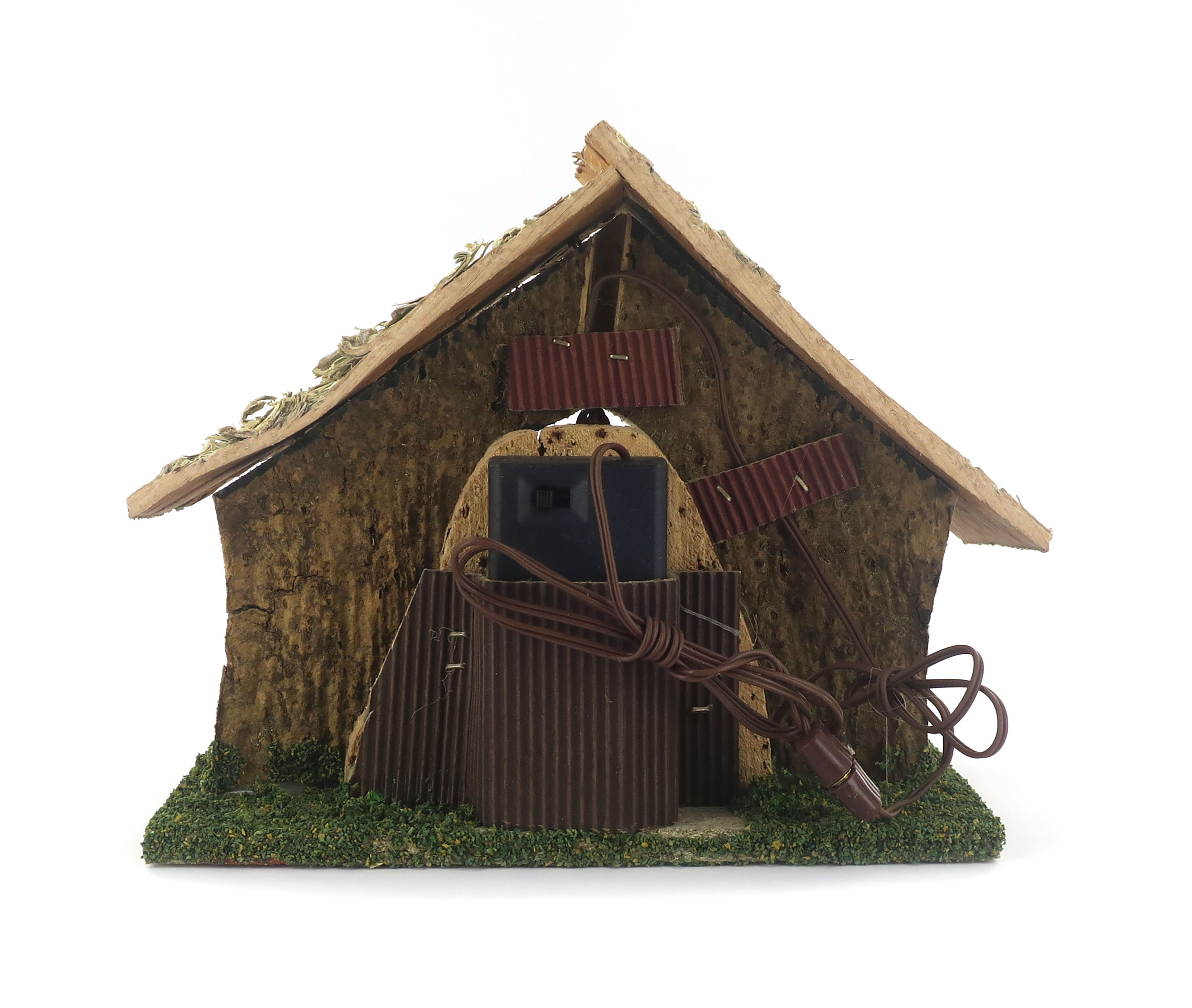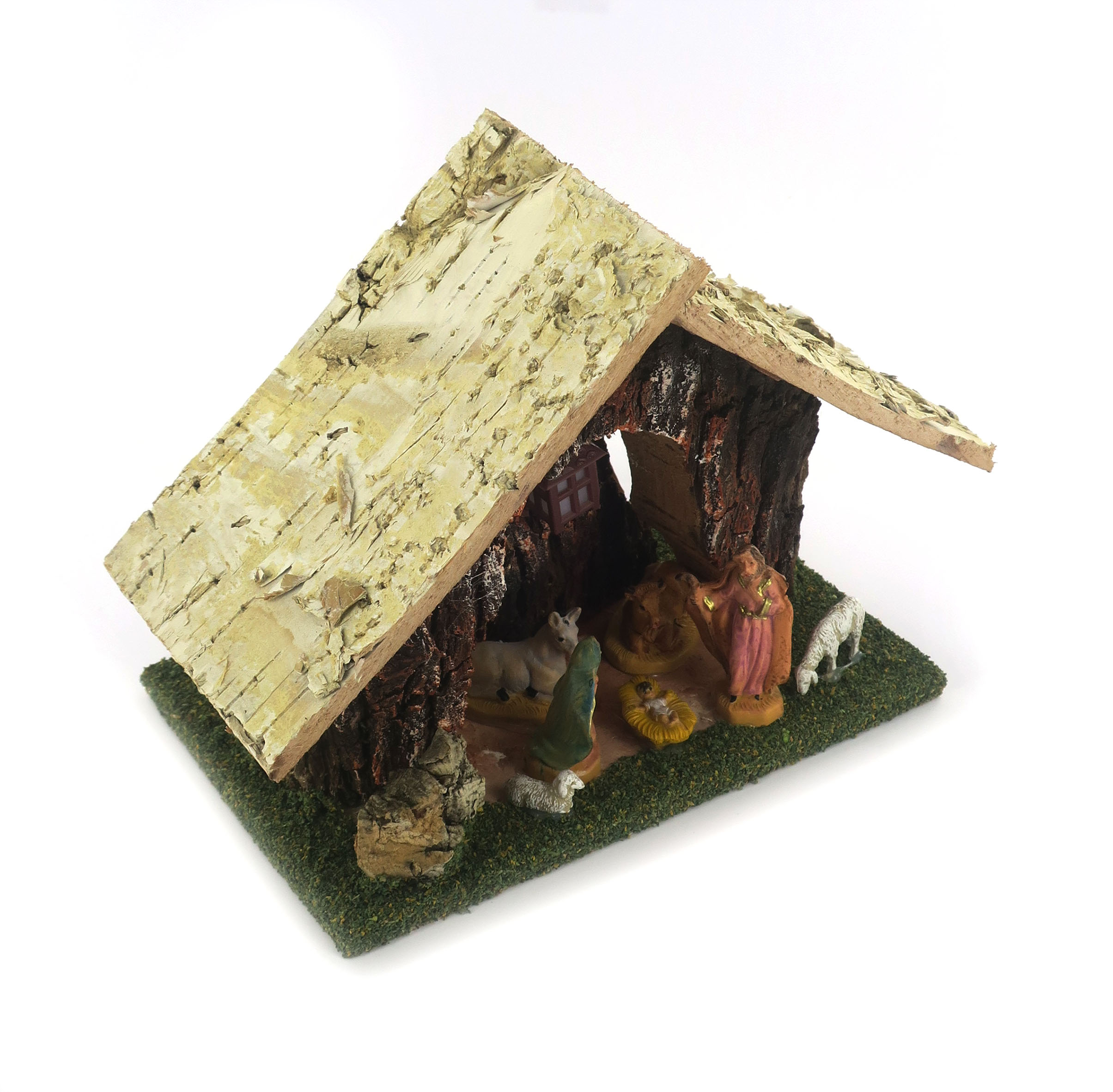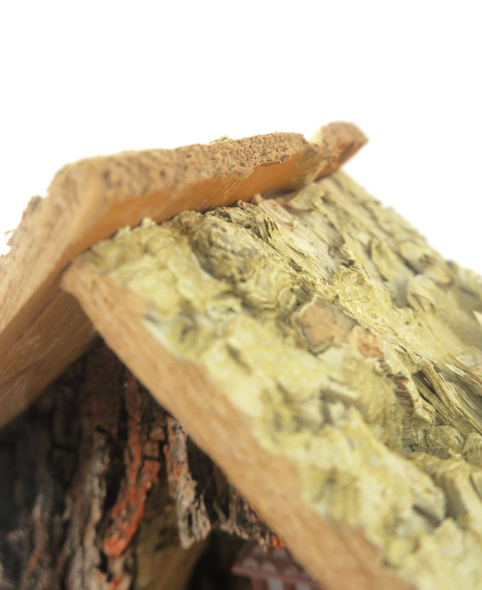 Capanna con lanterna e Natività. Alimentazione a batteria. Dimensioni: 16 x 10 x 14 cm. Materiali: legno, sughero e plastica. Realizzato artigianalmente in Italia.