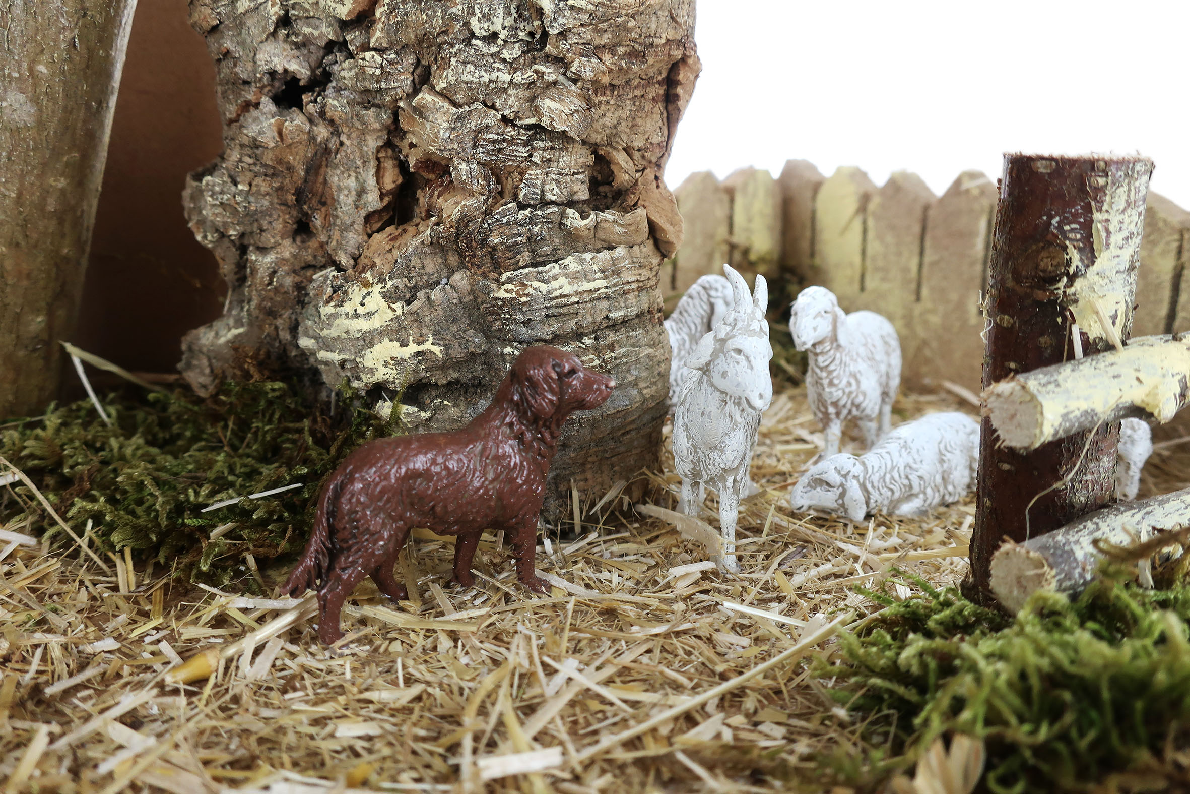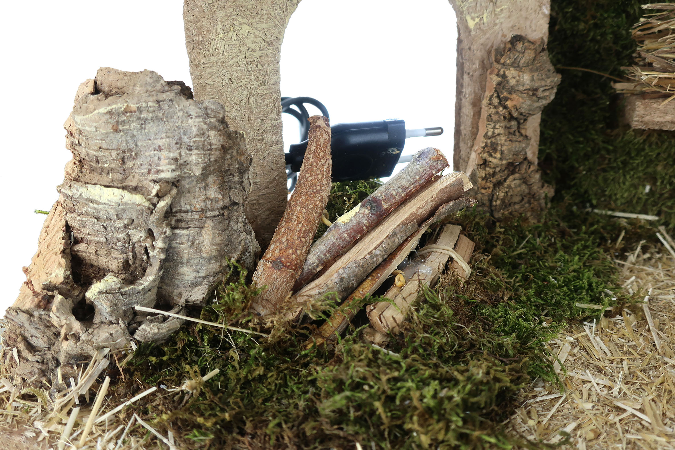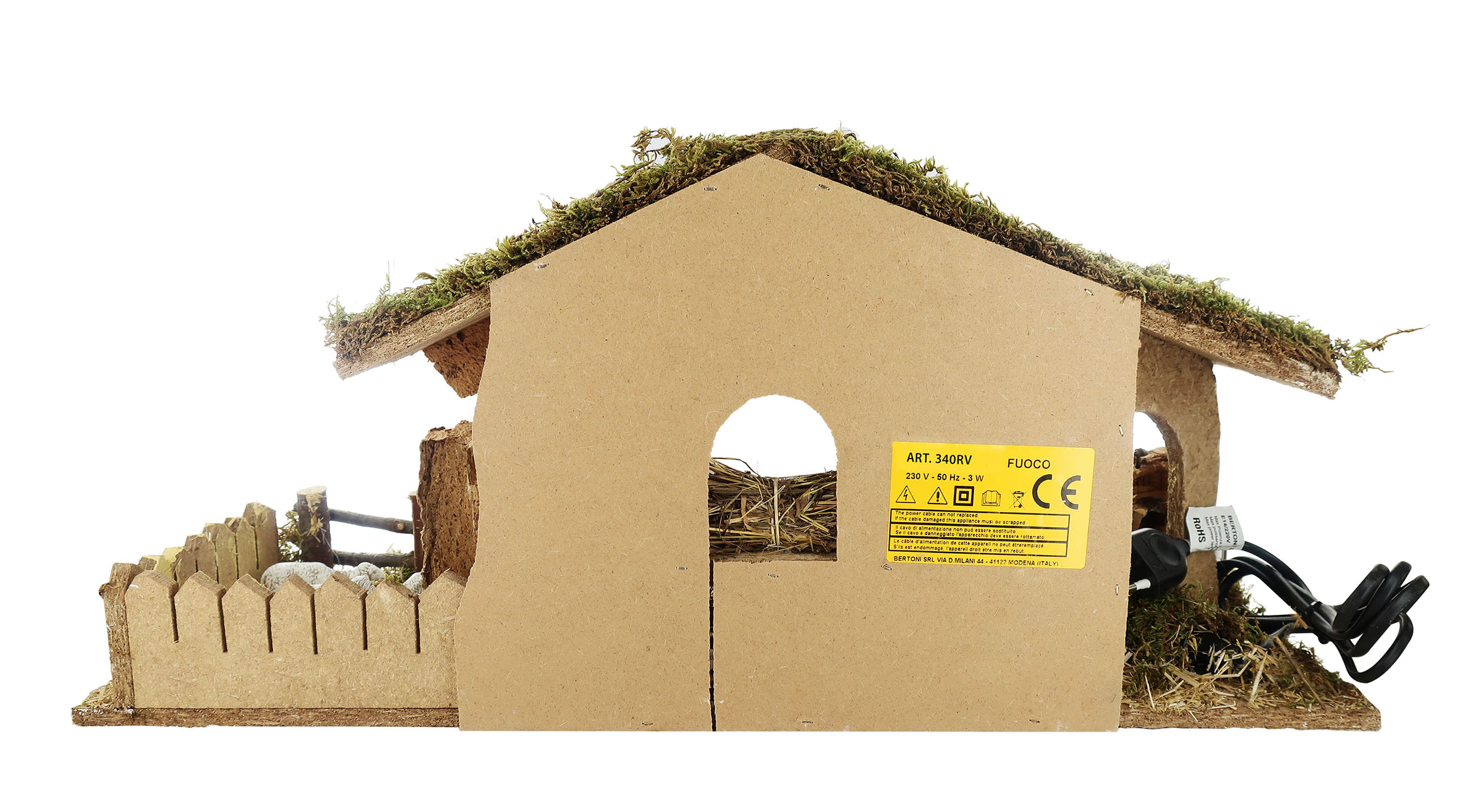 Capanna con fuoco elettrico (simulato tramite lampadina effetto fuoco alimentata a 200V). Ideale per statuine da 10/12 cm. Altre caratteristiche: recinto per animali. Dimensioni: 56 x 21 x 25 cm. Materiali: Legno, Sughero, Muschio e Paglia. Realizzato artigianalmente in Italia.
