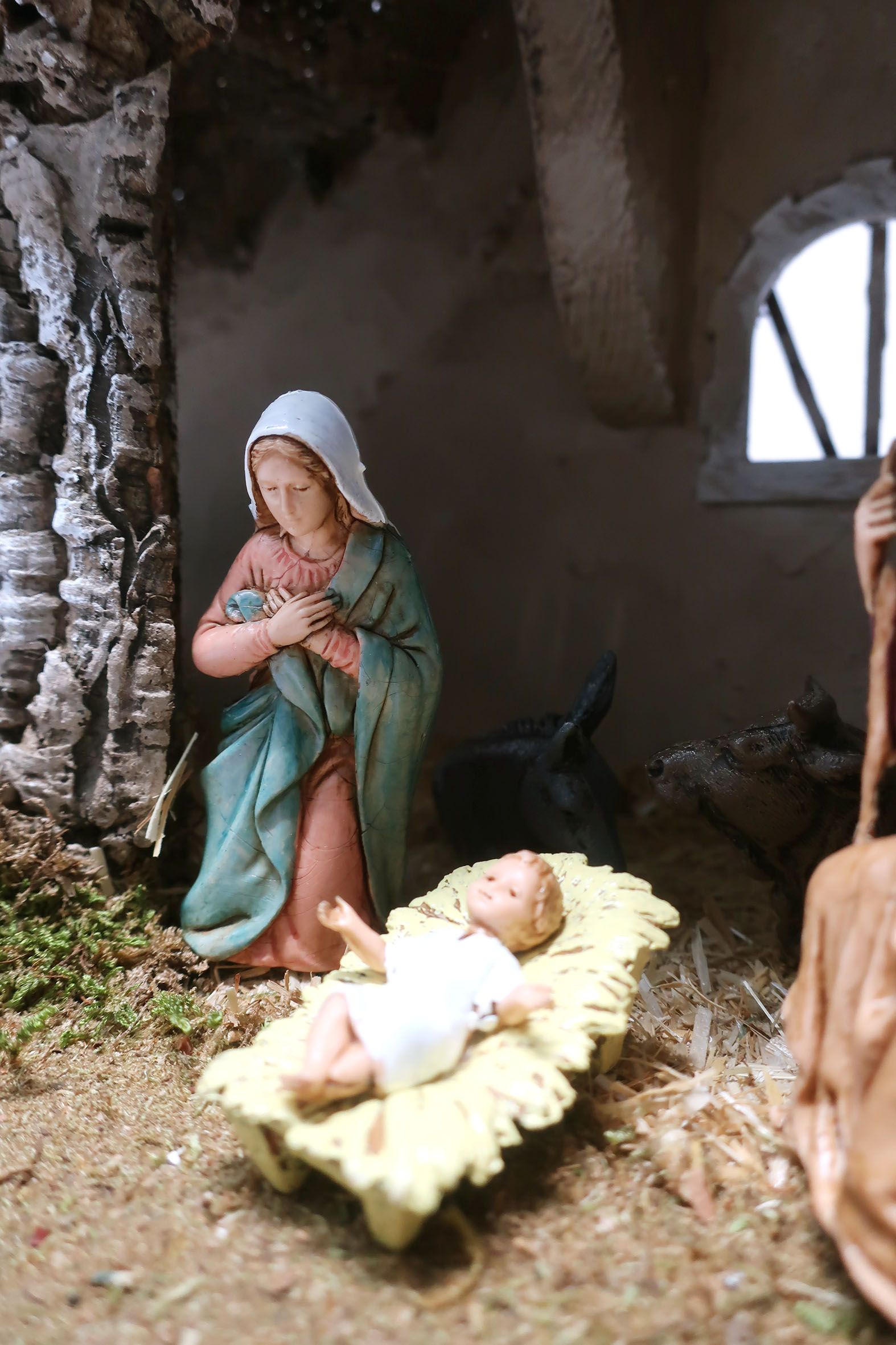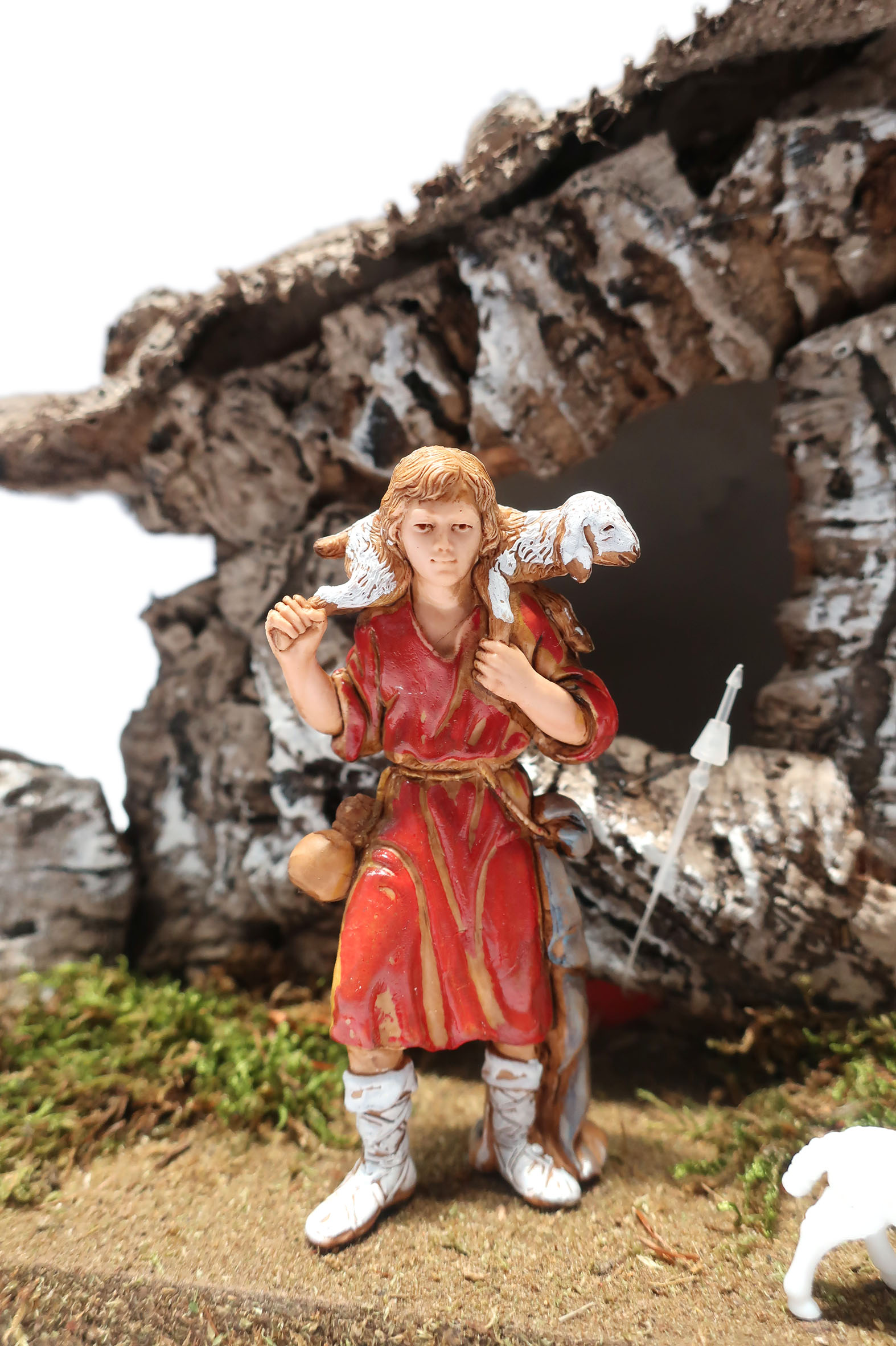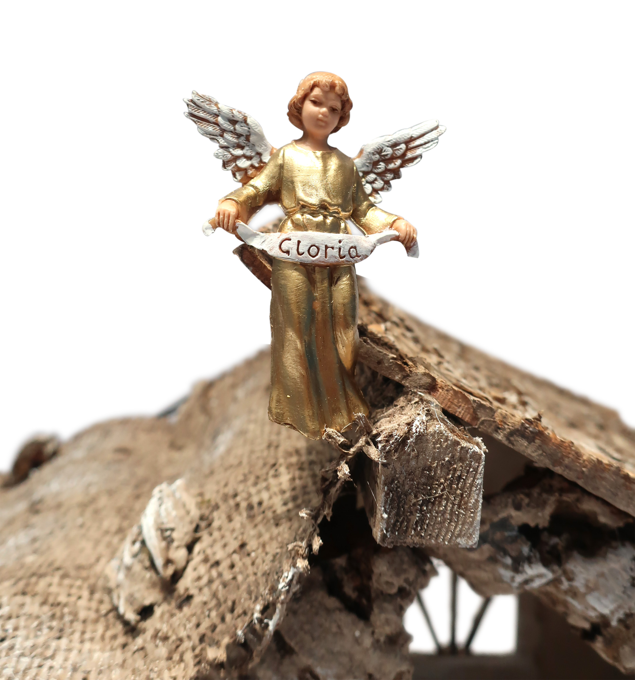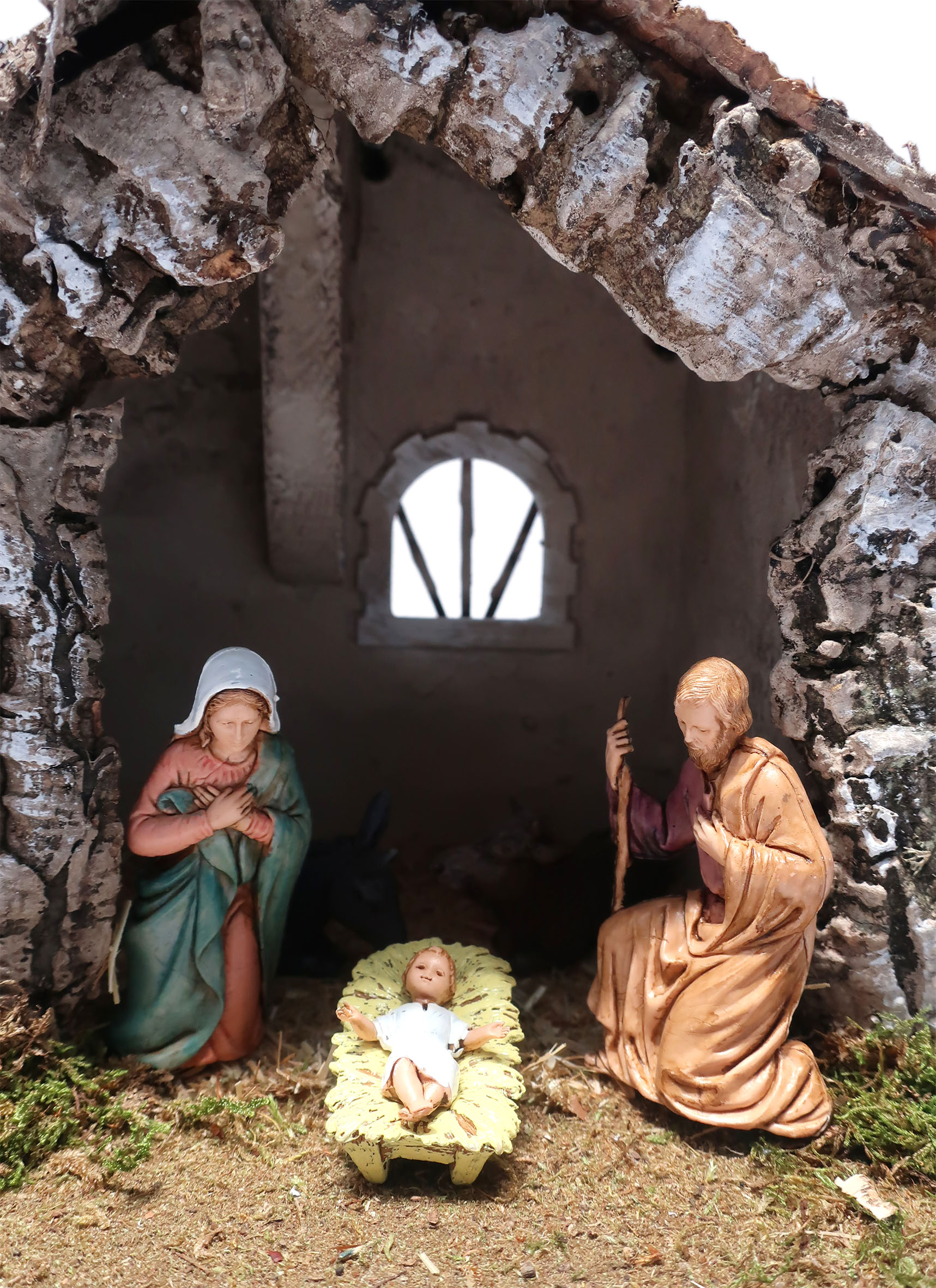 Capanna con luci a LED (Alimentazione a batteria). Completo di 7 personaggi da 8 cm e 3 pecore. Dimensioni: 36 x 16 x 21 cm. Materiali: Legno, Sughero, Paglia e Muschio. Realizzato artigianalmente in Italia.