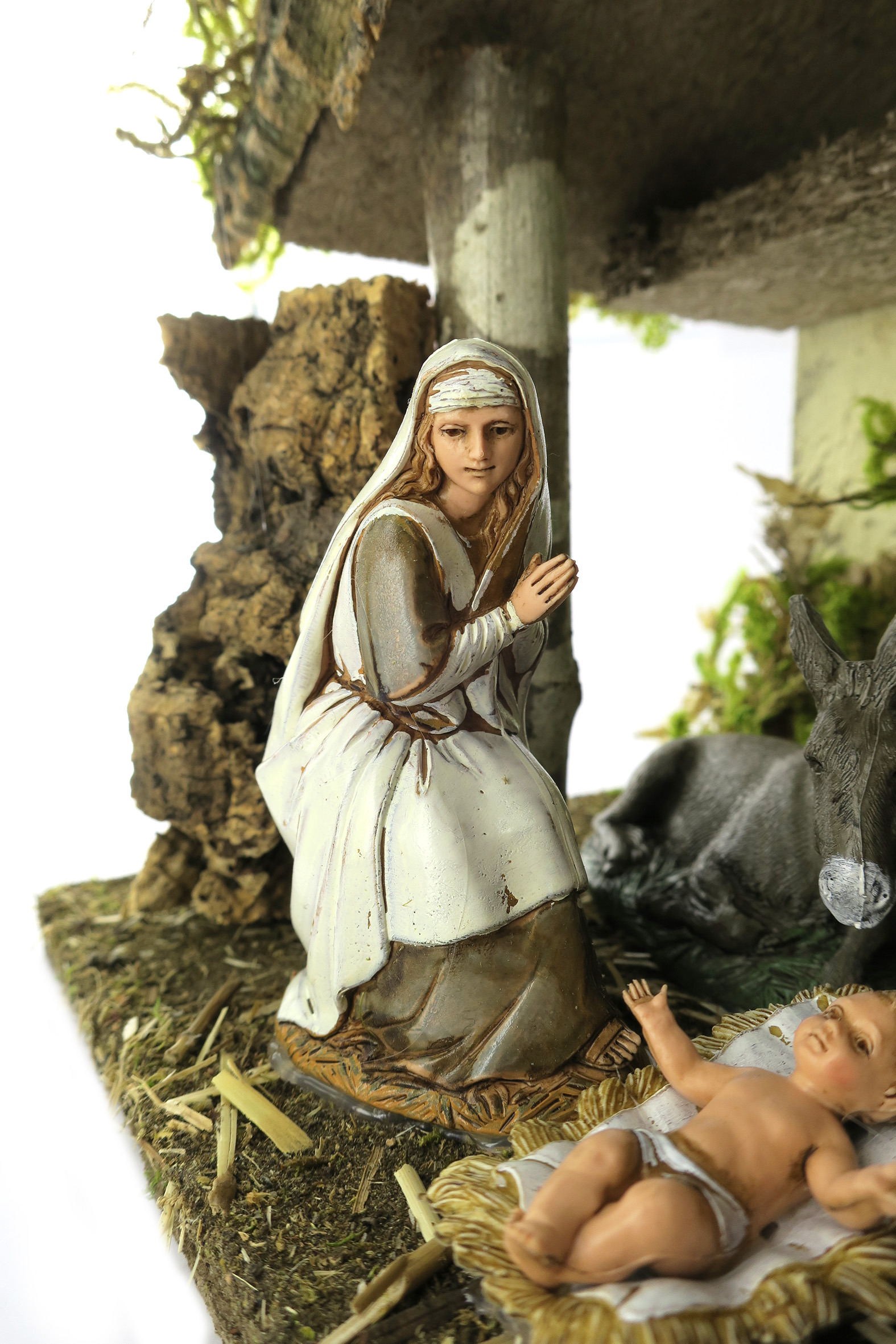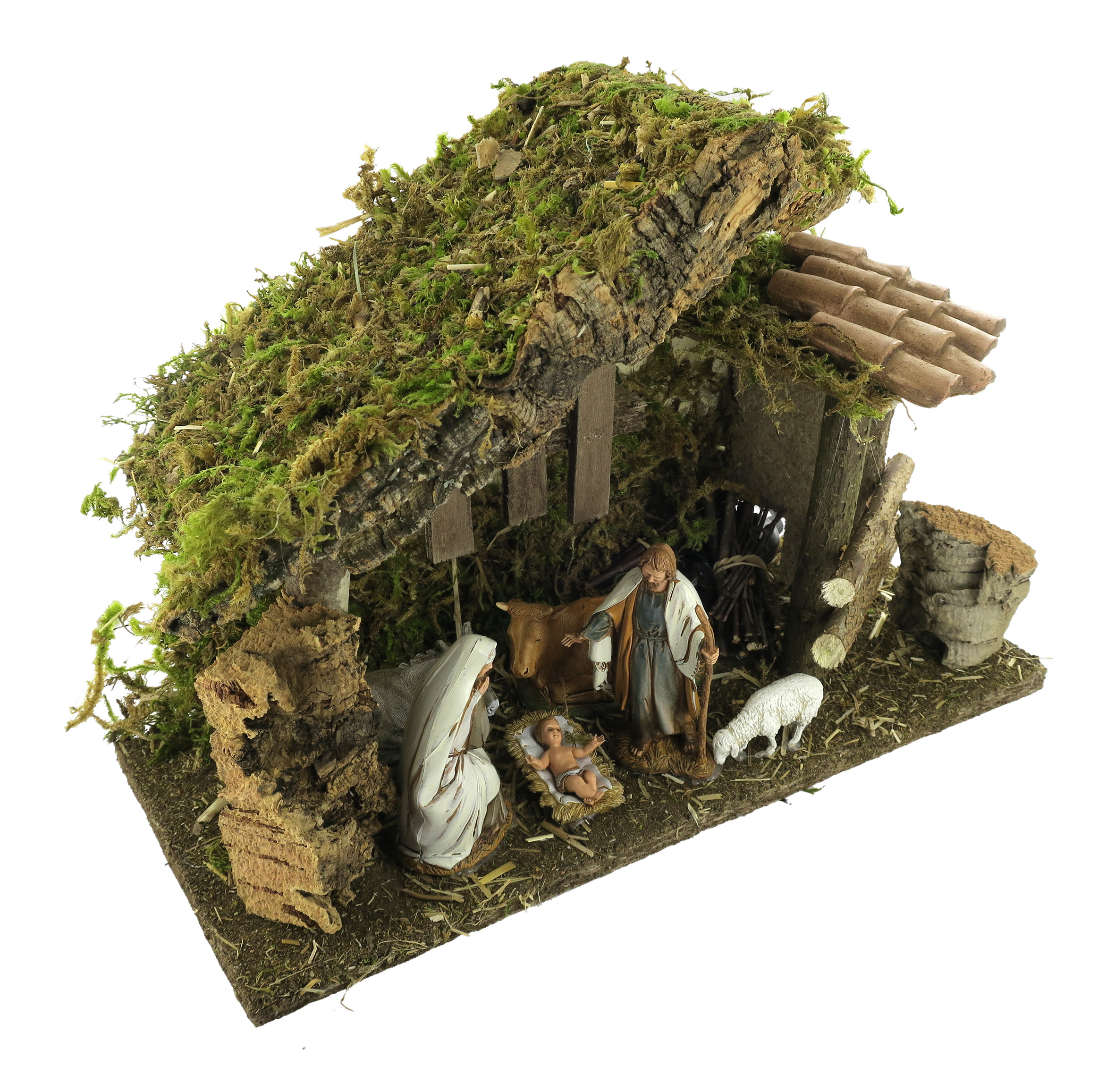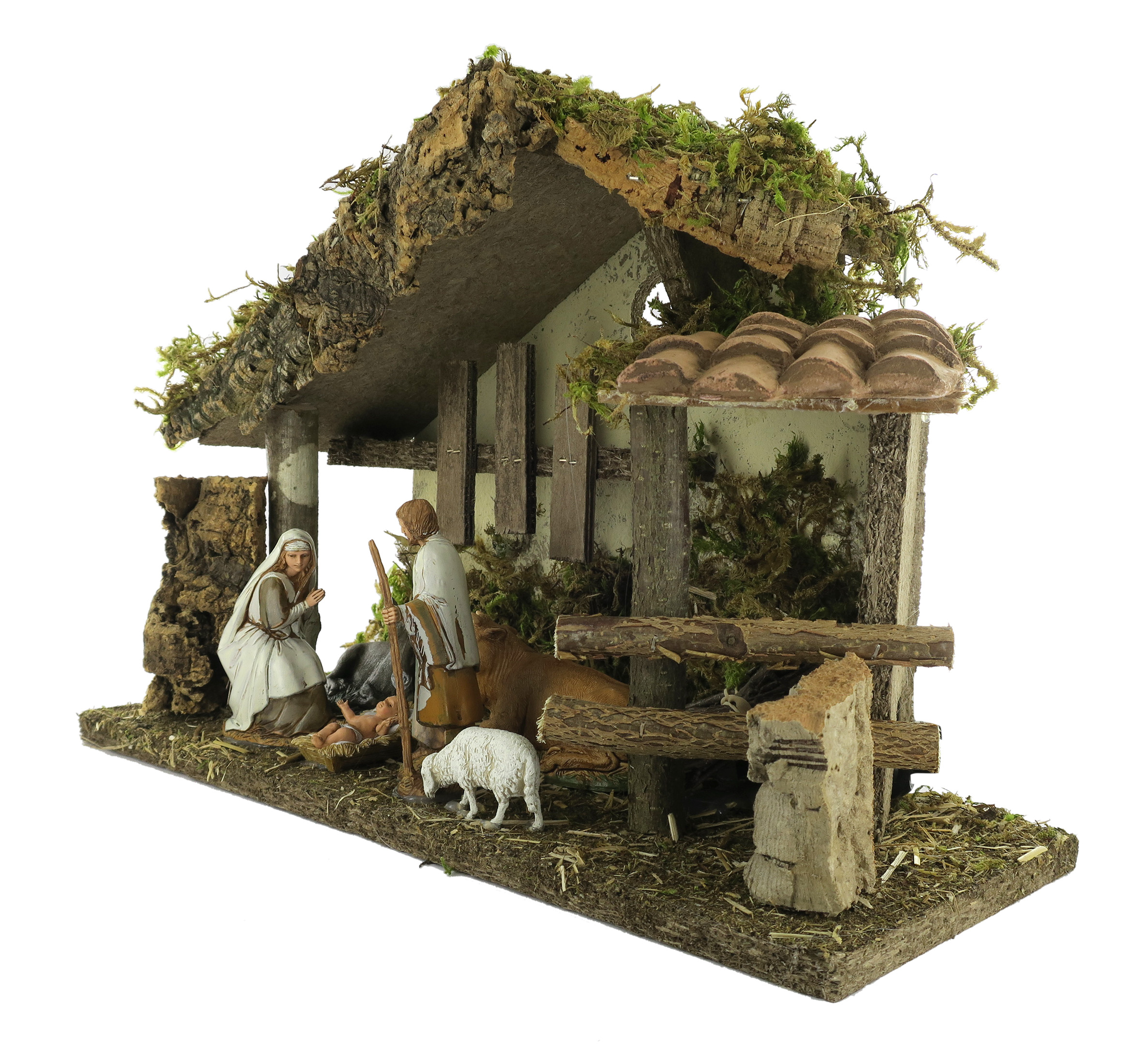 Capanna con statuine in resina da 10 cm e una pecora. Alimentazione elettrica 220V (fuoco). Altre caratteristiche: tegole in terracotta. Dimensioni: 36 x 15 x 24 cm. Materiali: Legno, Sughero, Paglia e Muschio. Realizzato artigianalmente in Italia.
