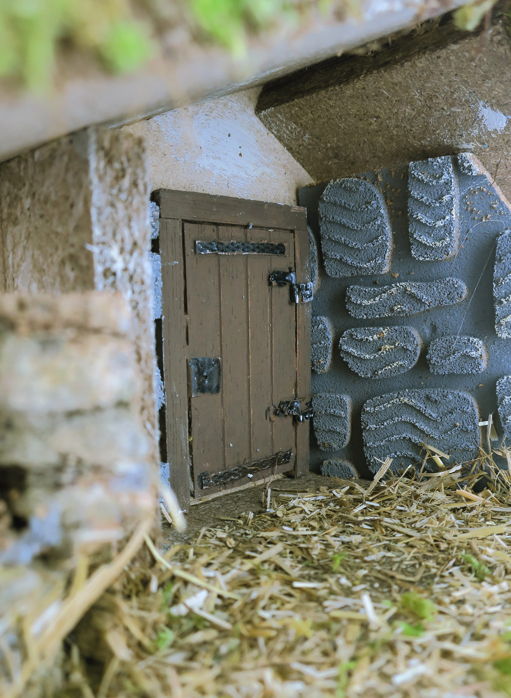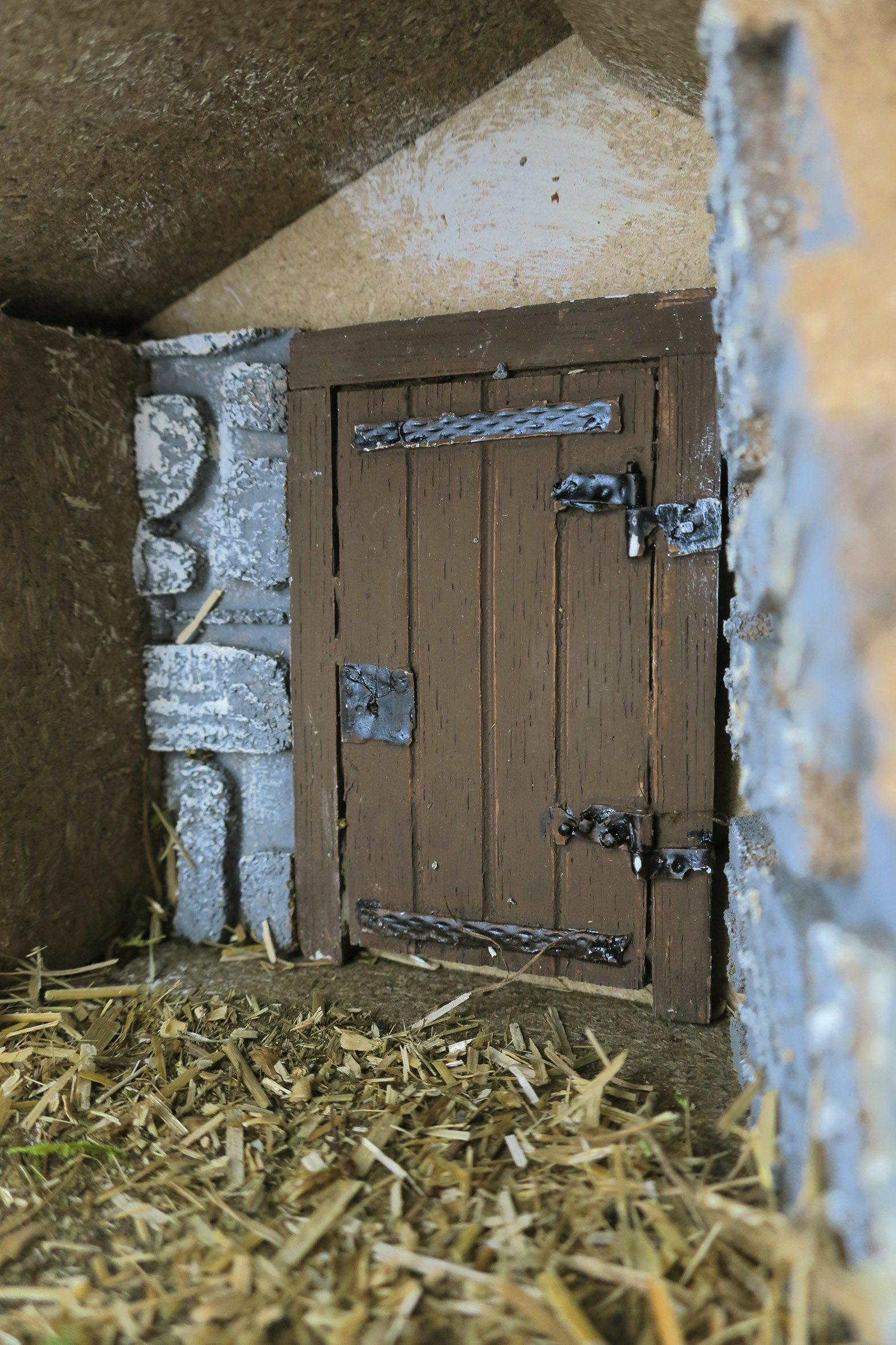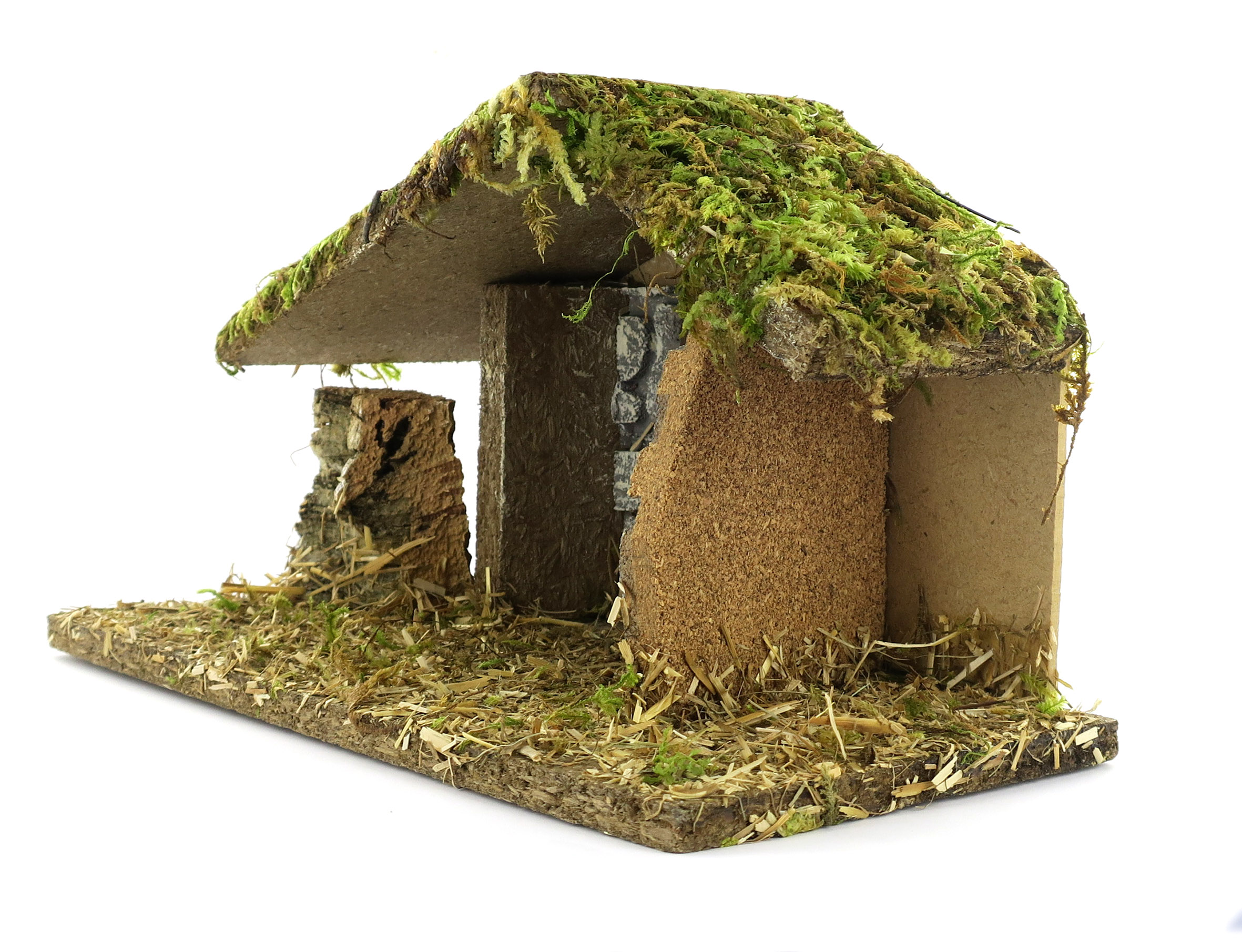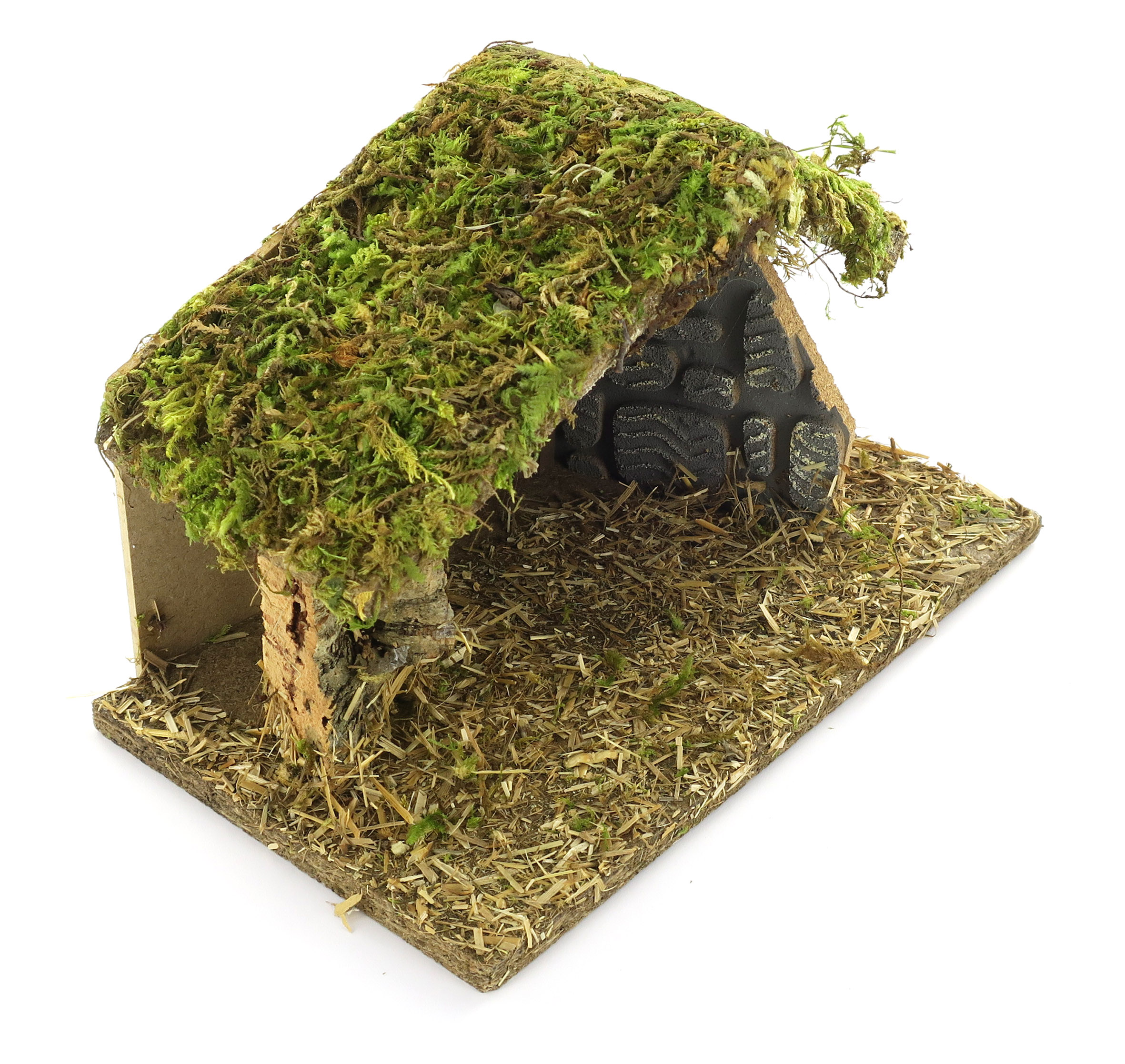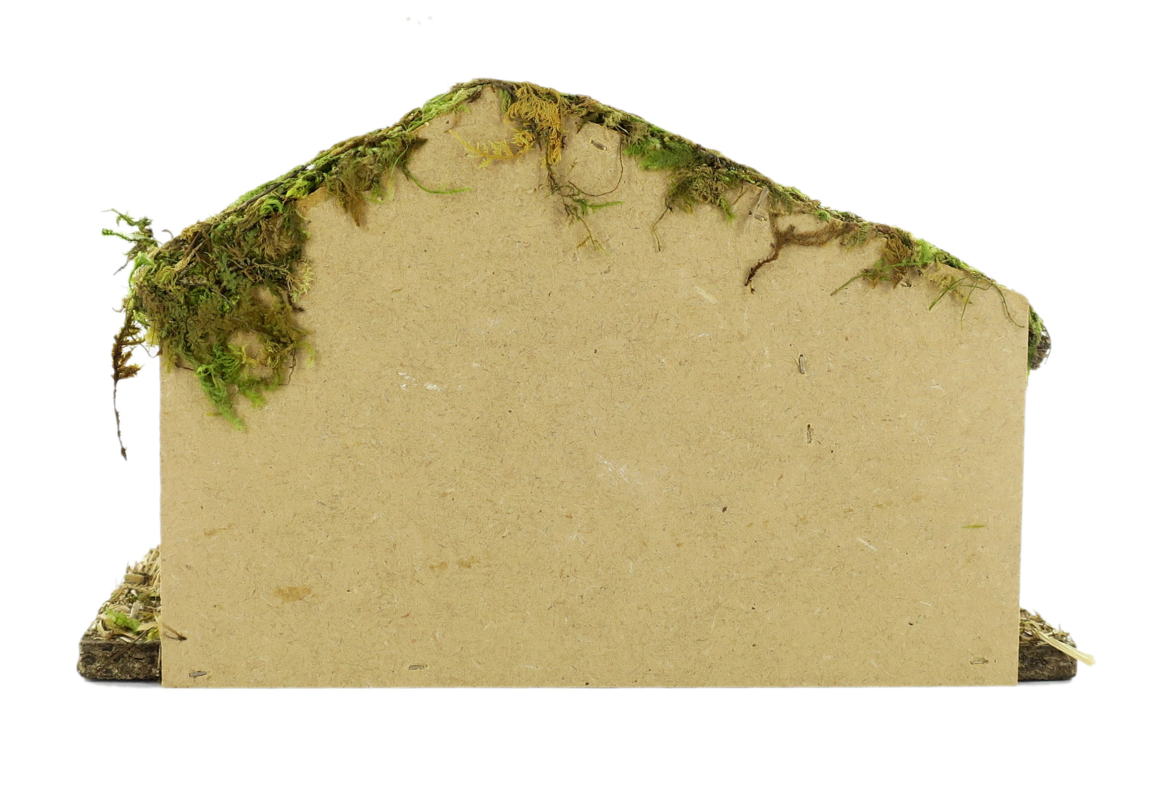Capanna vuota con muro a sassi e porta in resina, ideale per statuine da 6/7 cm. Dimensioni: 24 x 13 x 15 cm. Materiali: Muschio, Sughero, Paglia e Legno. Realizzato artigianalmente in Italia.