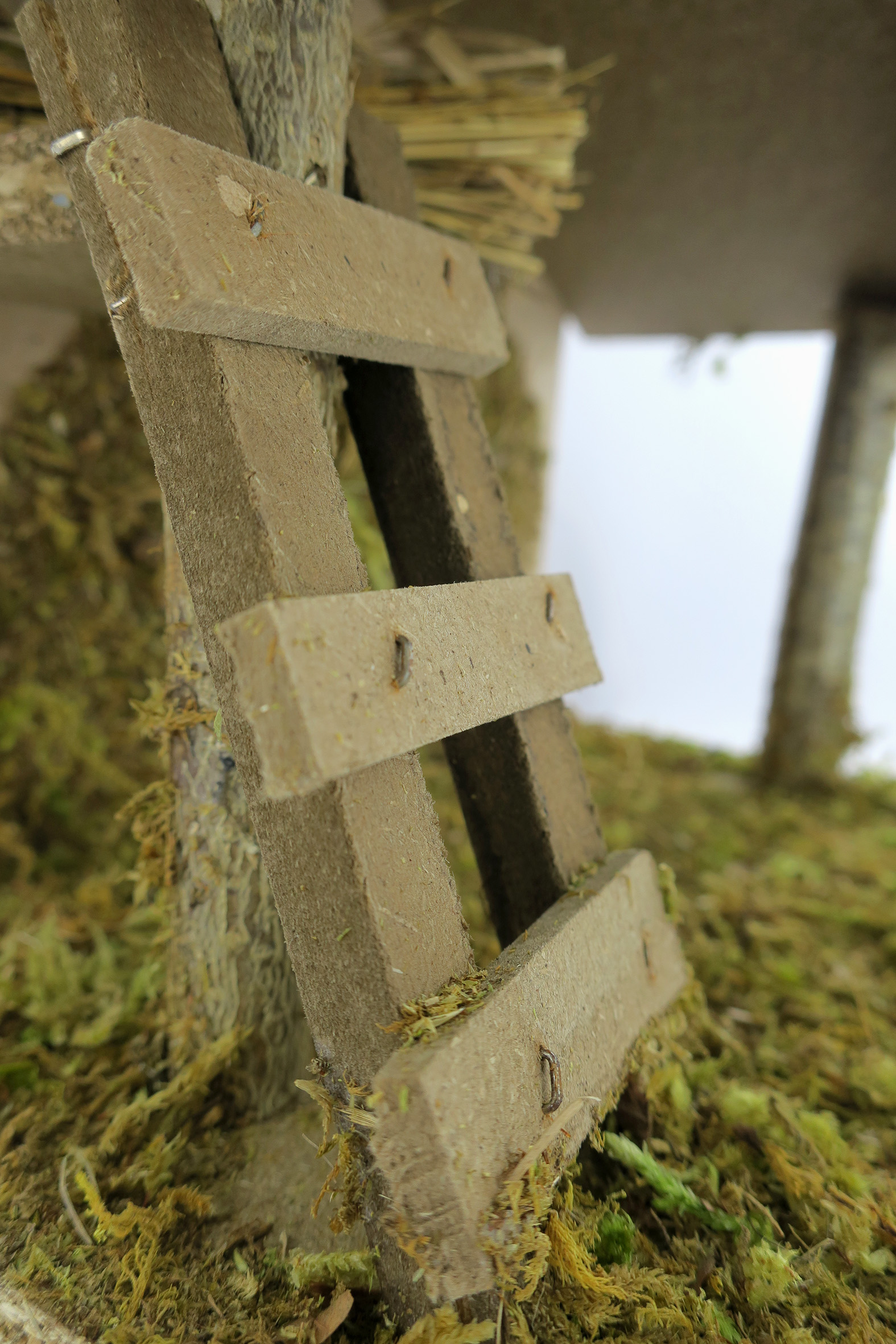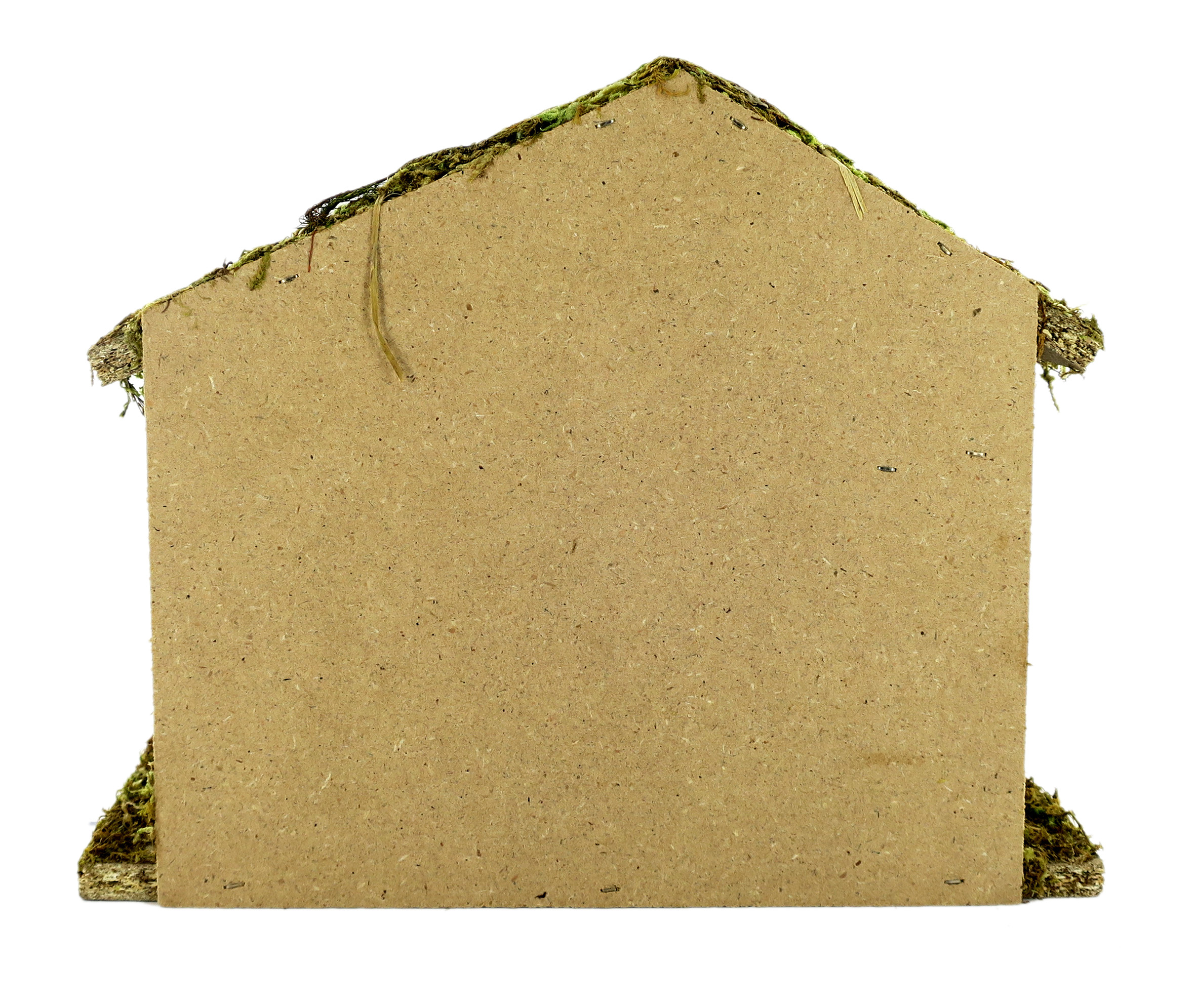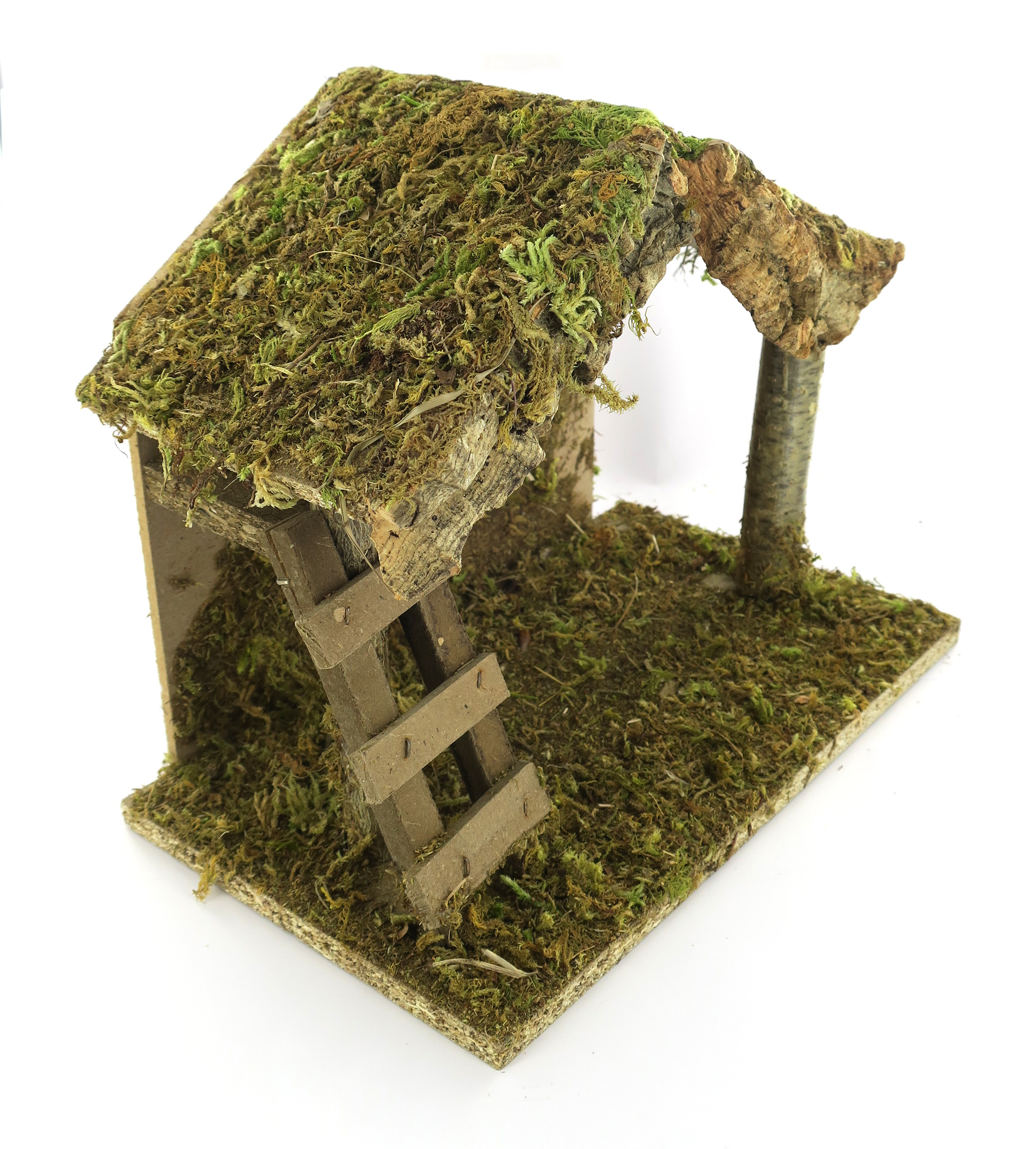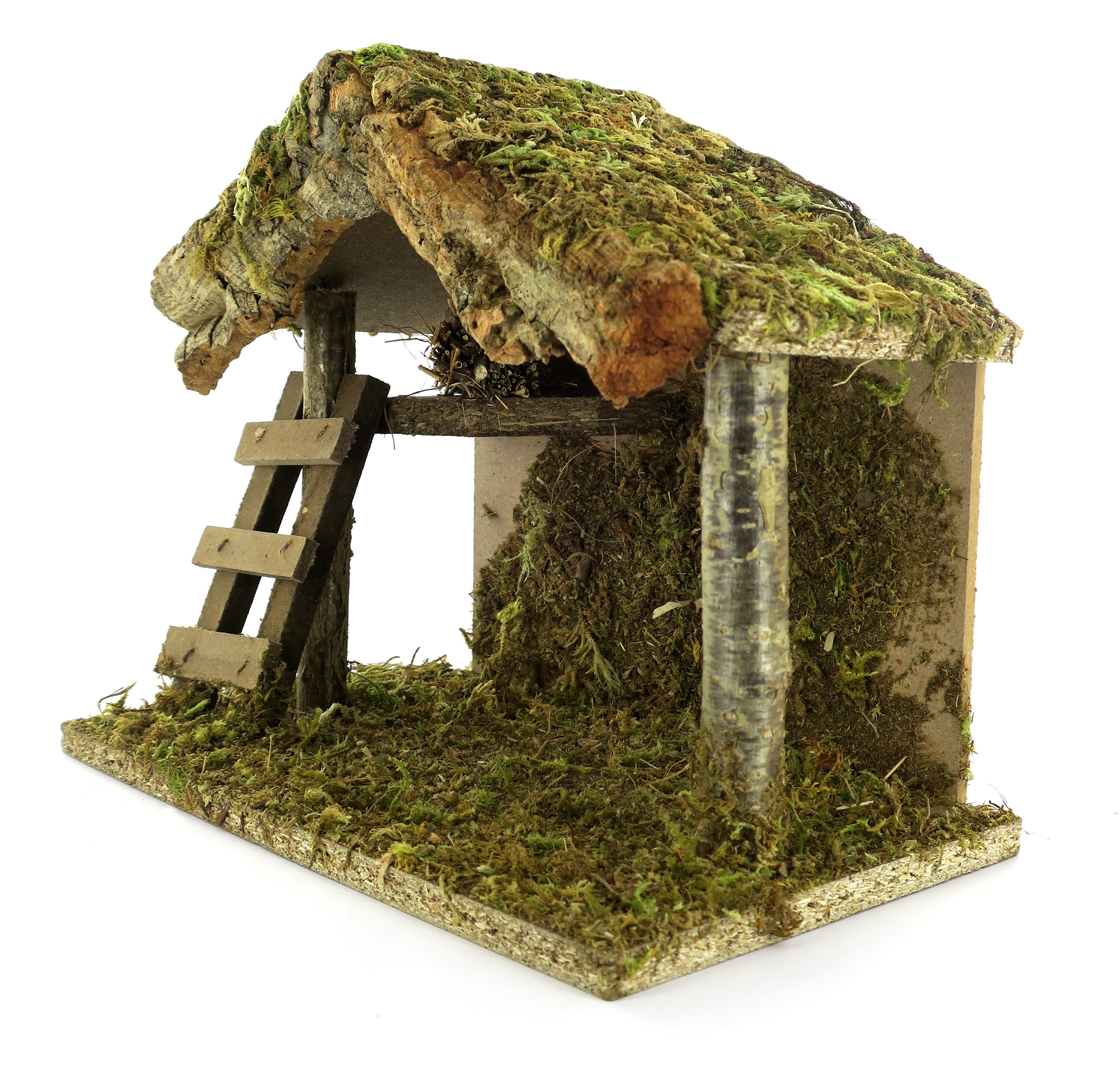 Capanna vuota, ideale per statuine da 6/7 cm. Vanta una scala a pioli che porta a un piccolo fienile nel sottotetto. Dimensioni: 24 x 14 x 20 cm. Materiale: Legno, Sughero e Muschio. Realizzato artigianalmente in Italia.
