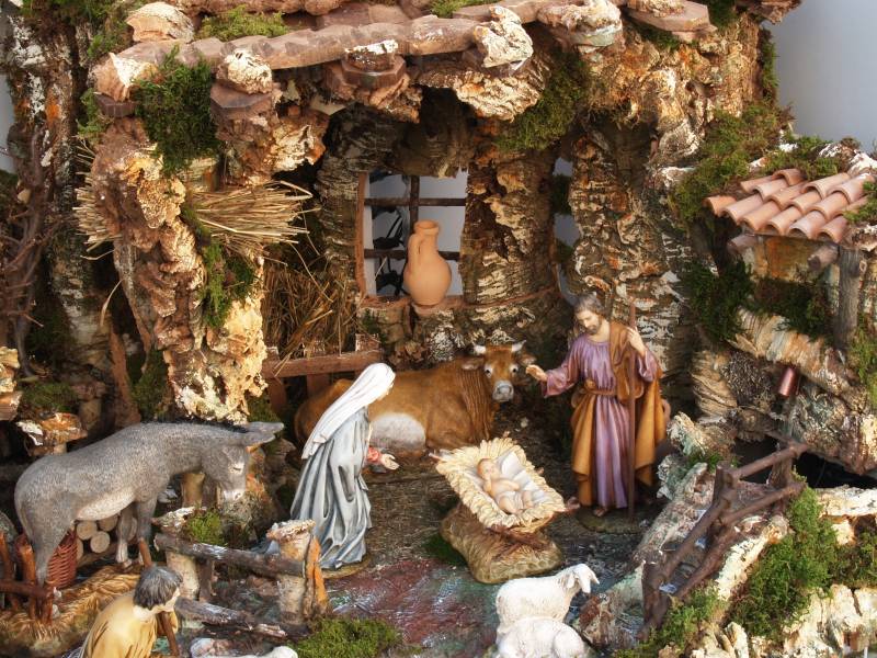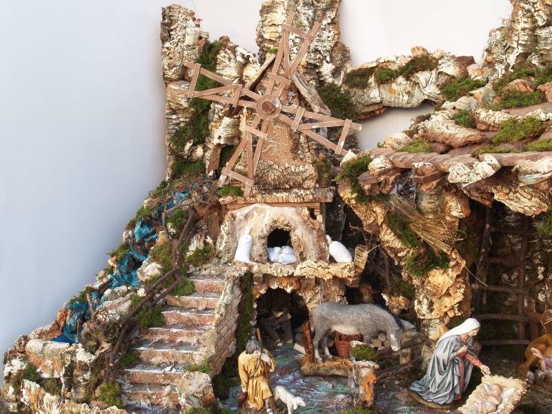 Villaggio agricolo di grandi dimensioni - cm 110 di base x cm 70 x cm 73 di altezza. Interamente realizzato a mano, dall'assemblaggio dei vari pezzi alla stesura della pittura. Il Villaggio rappresenta un piccolo paesino rustico di campagna. Osservando questo articolo partendo da sinistra, possiamo notare che è stata realizzata una cascata dinamica funzionante ad acqua che sembra nascere da quel frammento di sughero. Proseguendo troviamo una scalinata che porta a un mulino a vento alimentato elettricamente; mentre alla base è stato costruito un piccolo fuoco da campo. A destra invece troviamo la parte principale di questo villaggio: la Grotta con la nascita di Gesù Bambino e infine una fontana ad acqua coperta con un tetto in coppi di terracotta. Questo articolo viene arricchito e impreziosito da 7 statuine in resina da 18 cm dello scultore "Martino Landi" (Maria, Giuseppe, Bambino nella culla, bue, asino, un pastore con pecora e una coppia di pecore). Prodotto in Italia.