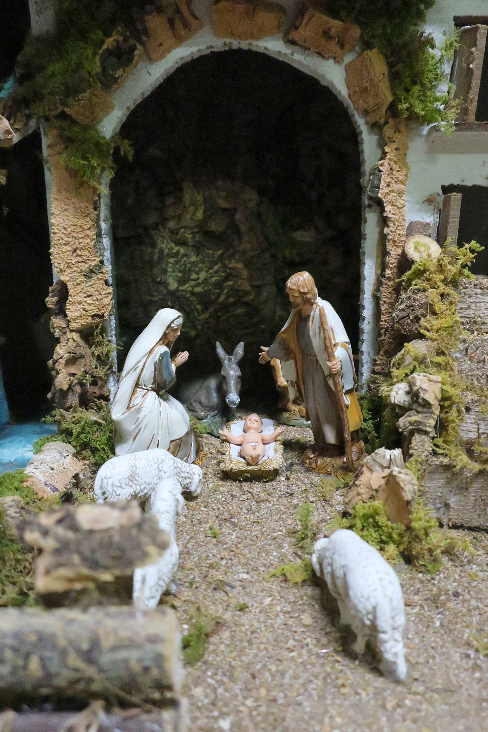 Paese per Presepe con Statuine Natività , Lucine, Mulino Che Si Muove e Cascata con Acqua Che Scorre, 220V, 56x37x42 Cm