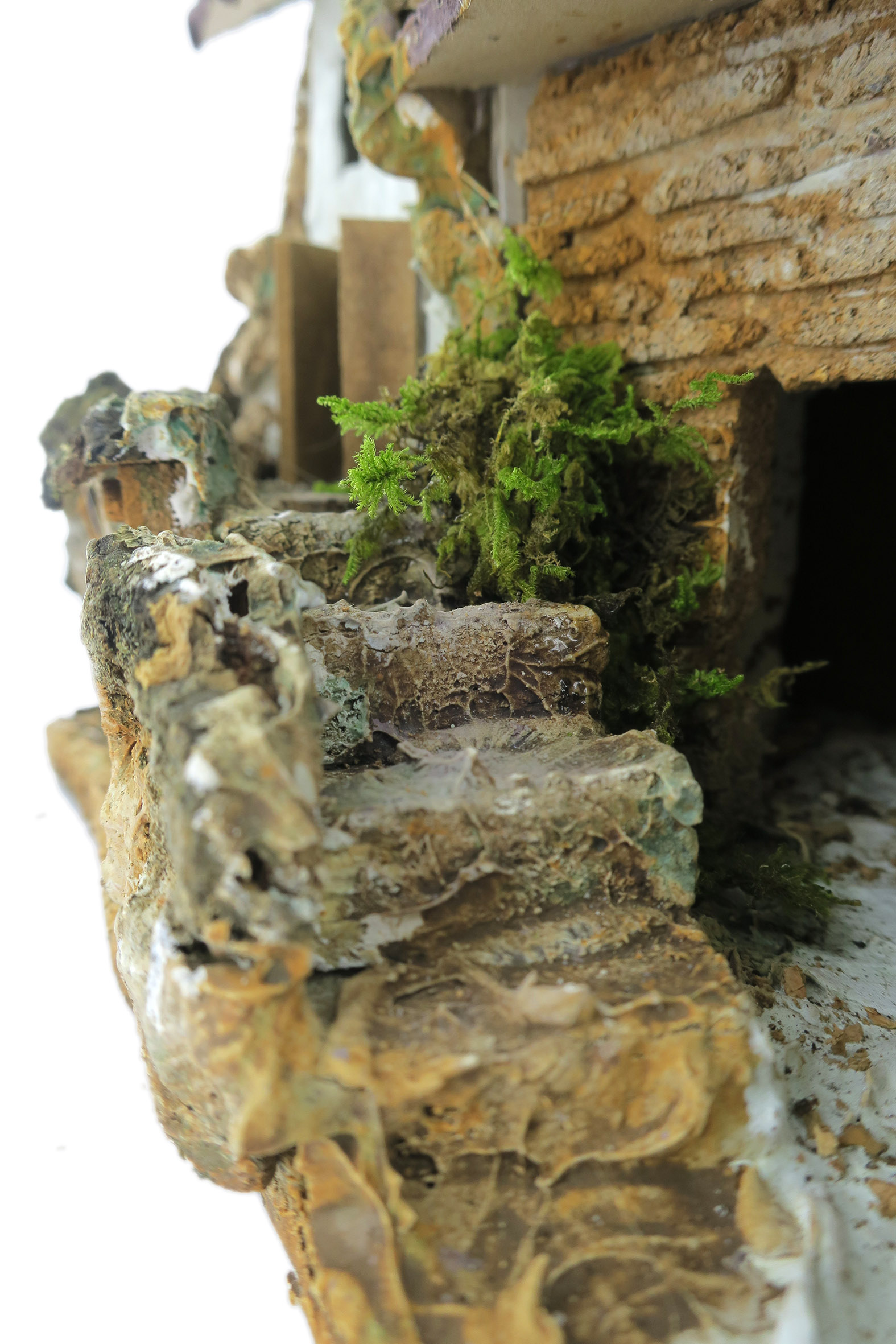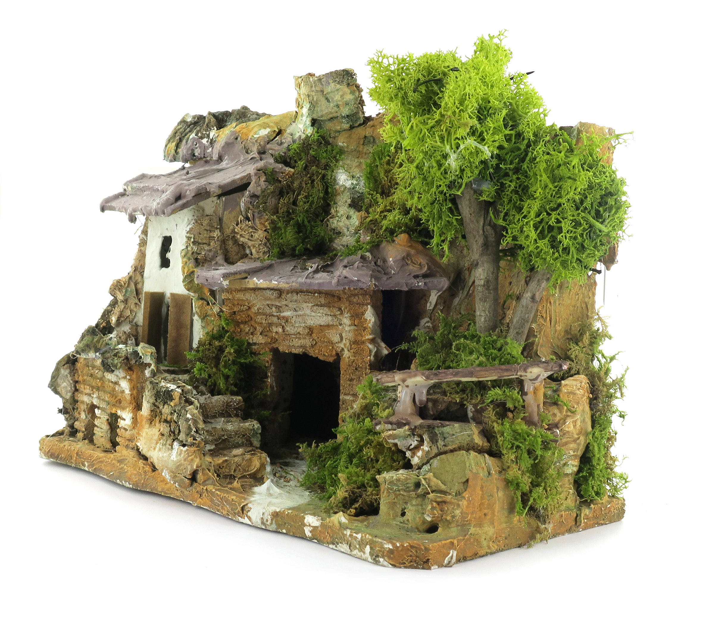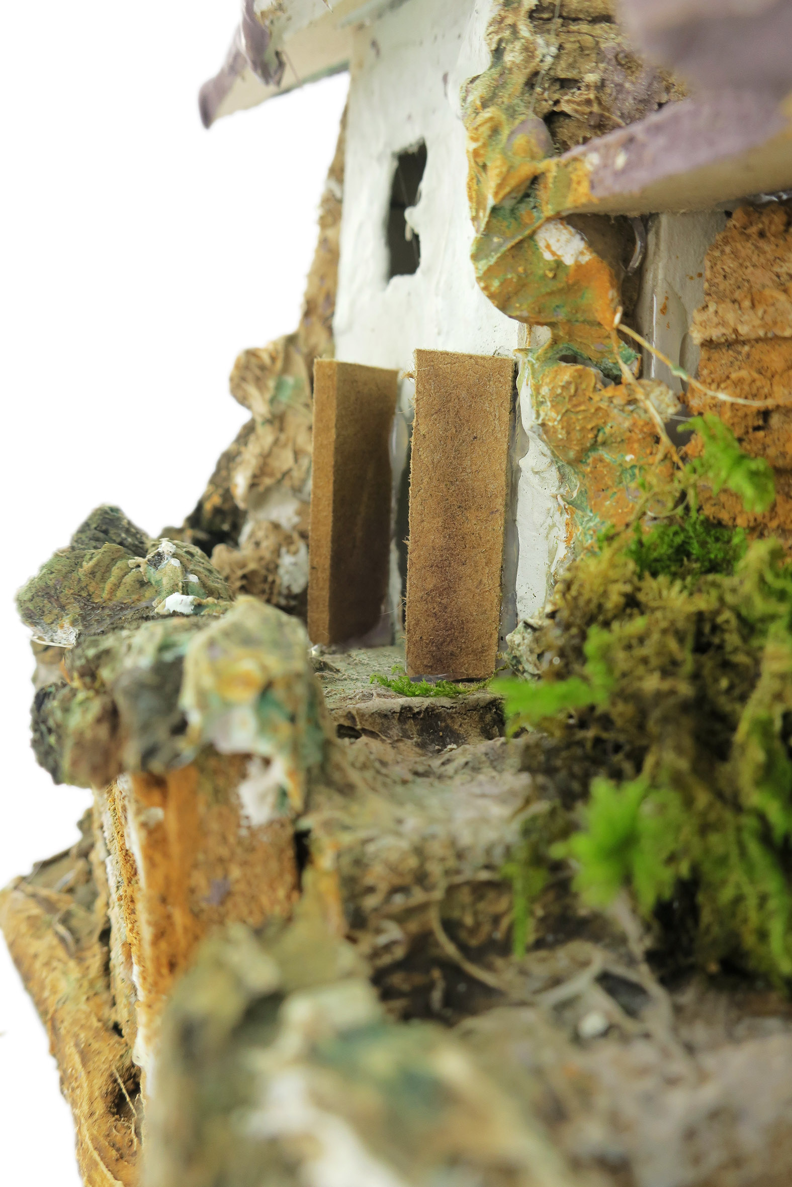 Accessori per presepe: Casa In Stucco Con Rimessa di Legna. Dimensioni: 13 x 25 x 19 cm. Materiali: legno, muschio, sughero, stucco e lichene. Realizzato artigianalmente in Italia.