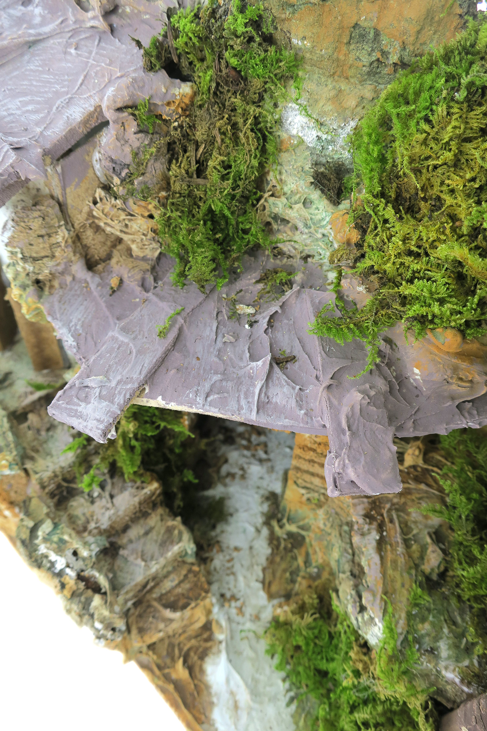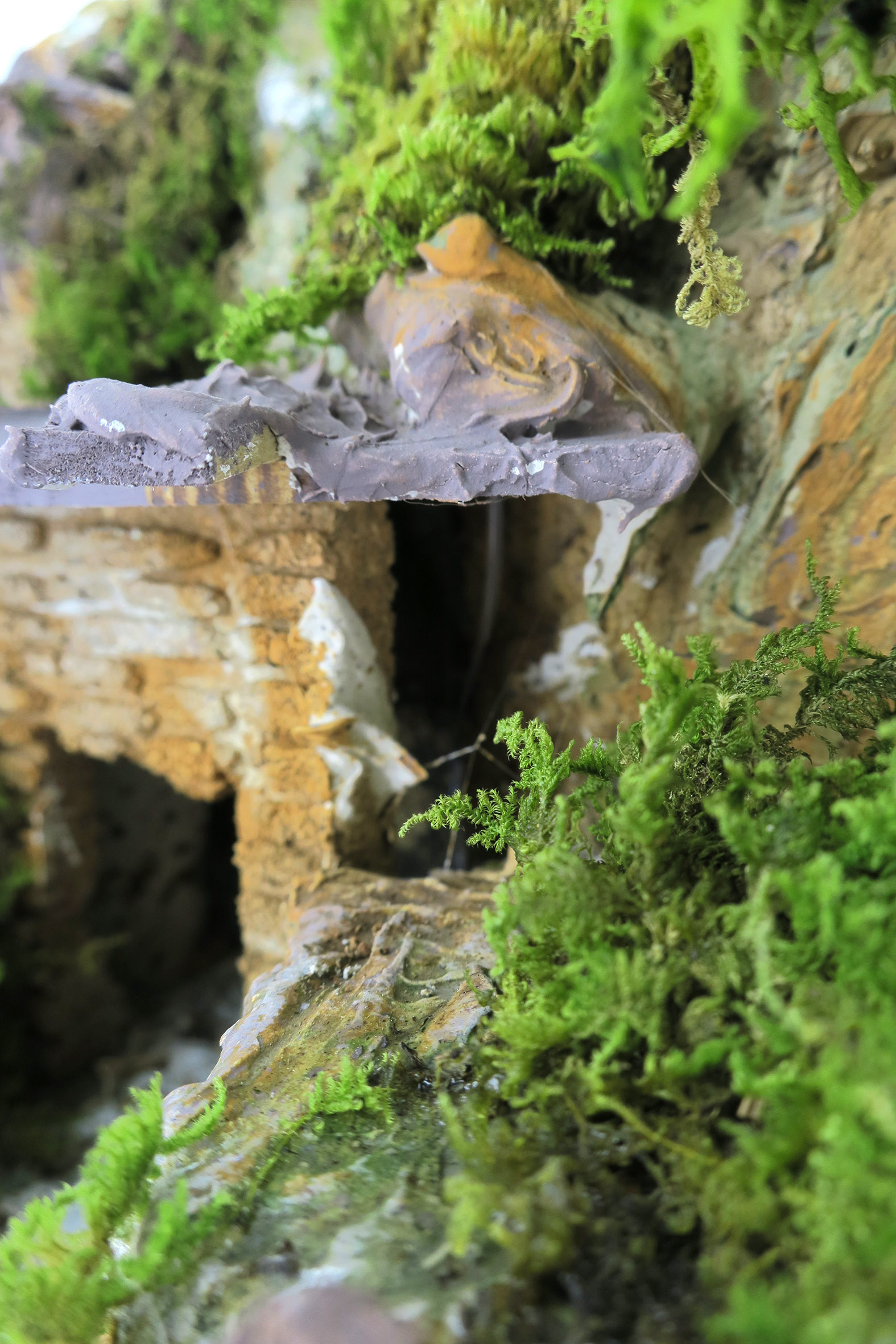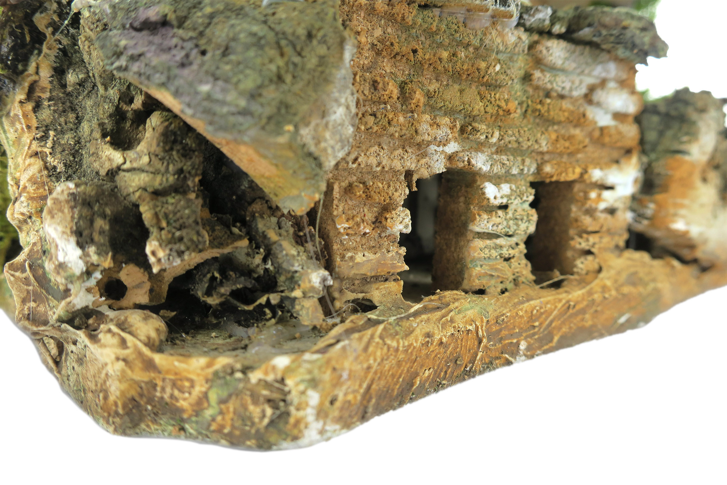 Accessori per presepe: Casa In Stucco Con Rimessa di Legna. Dimensioni: 13 x 25 x 19 cm. Materiali: legno, muschio, sughero, stucco e lichene. Realizzato artigianalmente in Italia.
