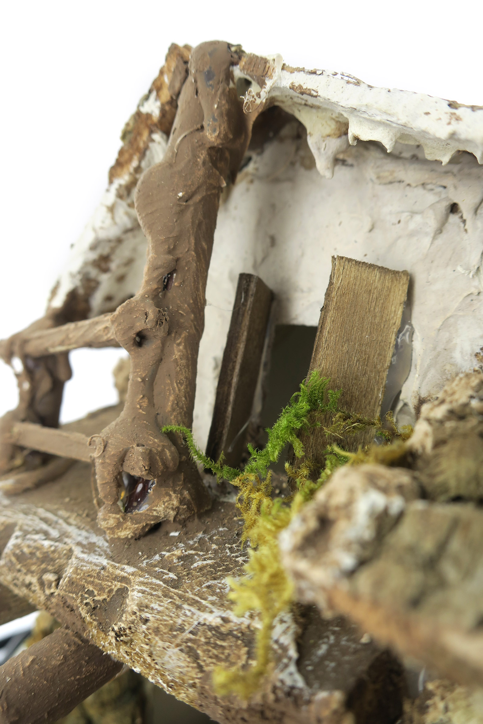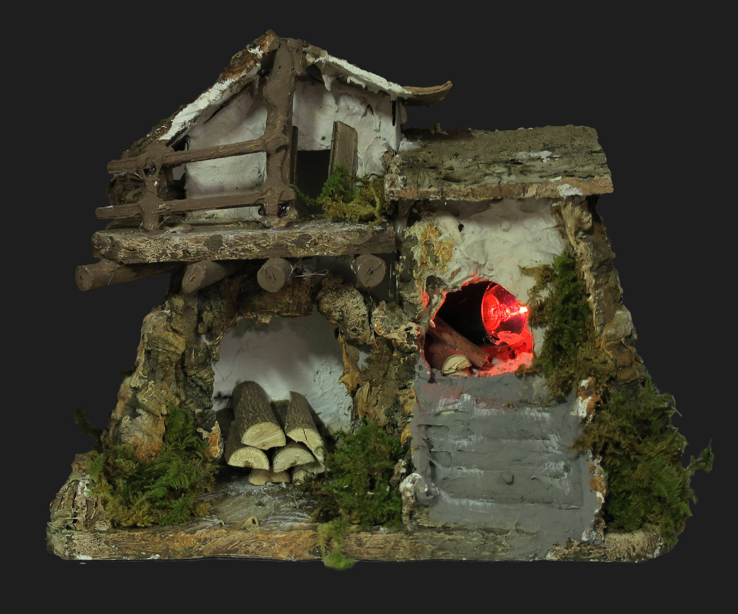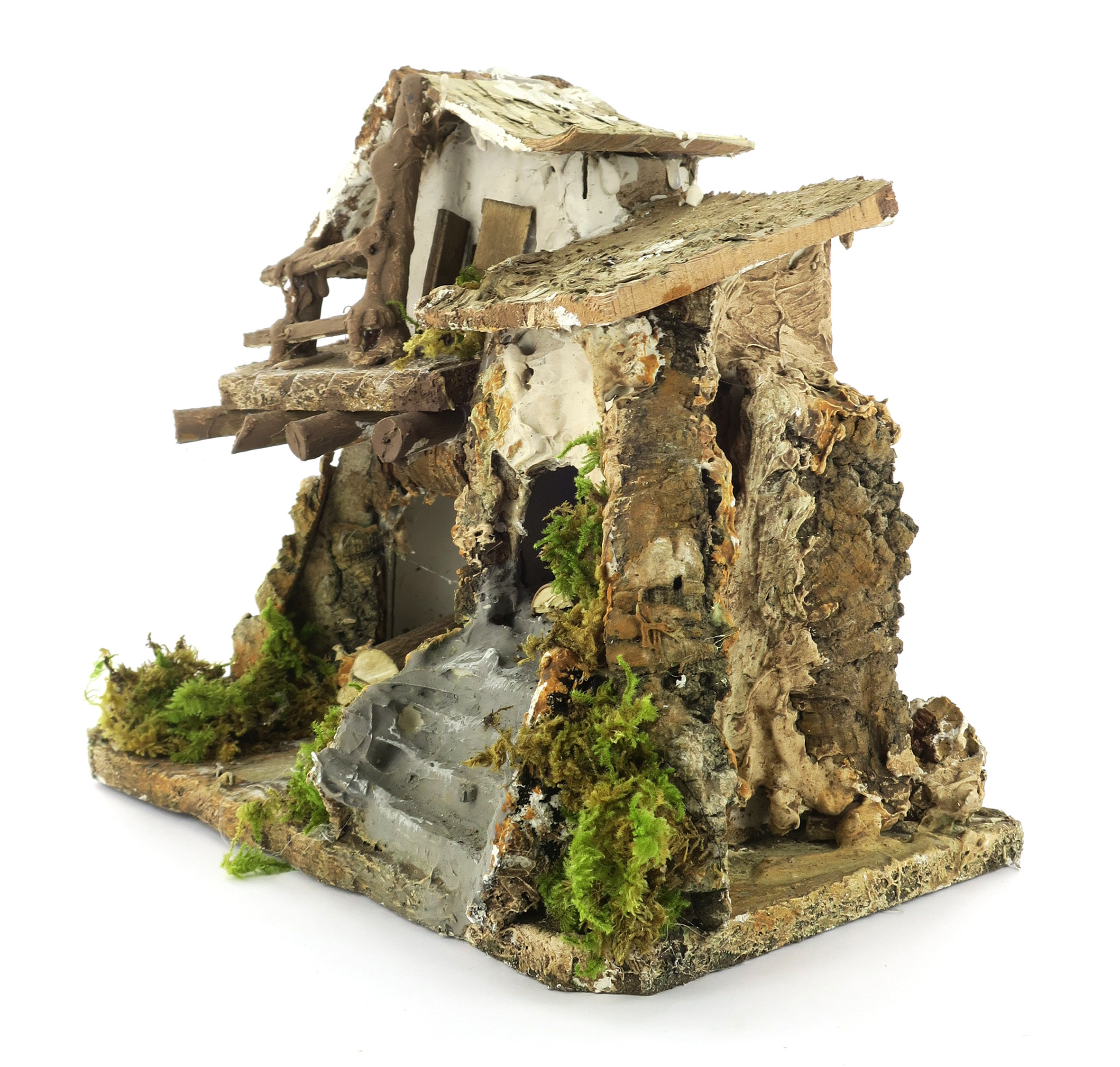 Accessori per presepe: Casa di campagna con fuoco elettrico (alimentazione elettrica 220 V). Dimensioni: 16 x 22 x 18 cm. Materiali: legno, stucco, sughero, cartone e muschio. Realizzato artigianalmente in Italia.