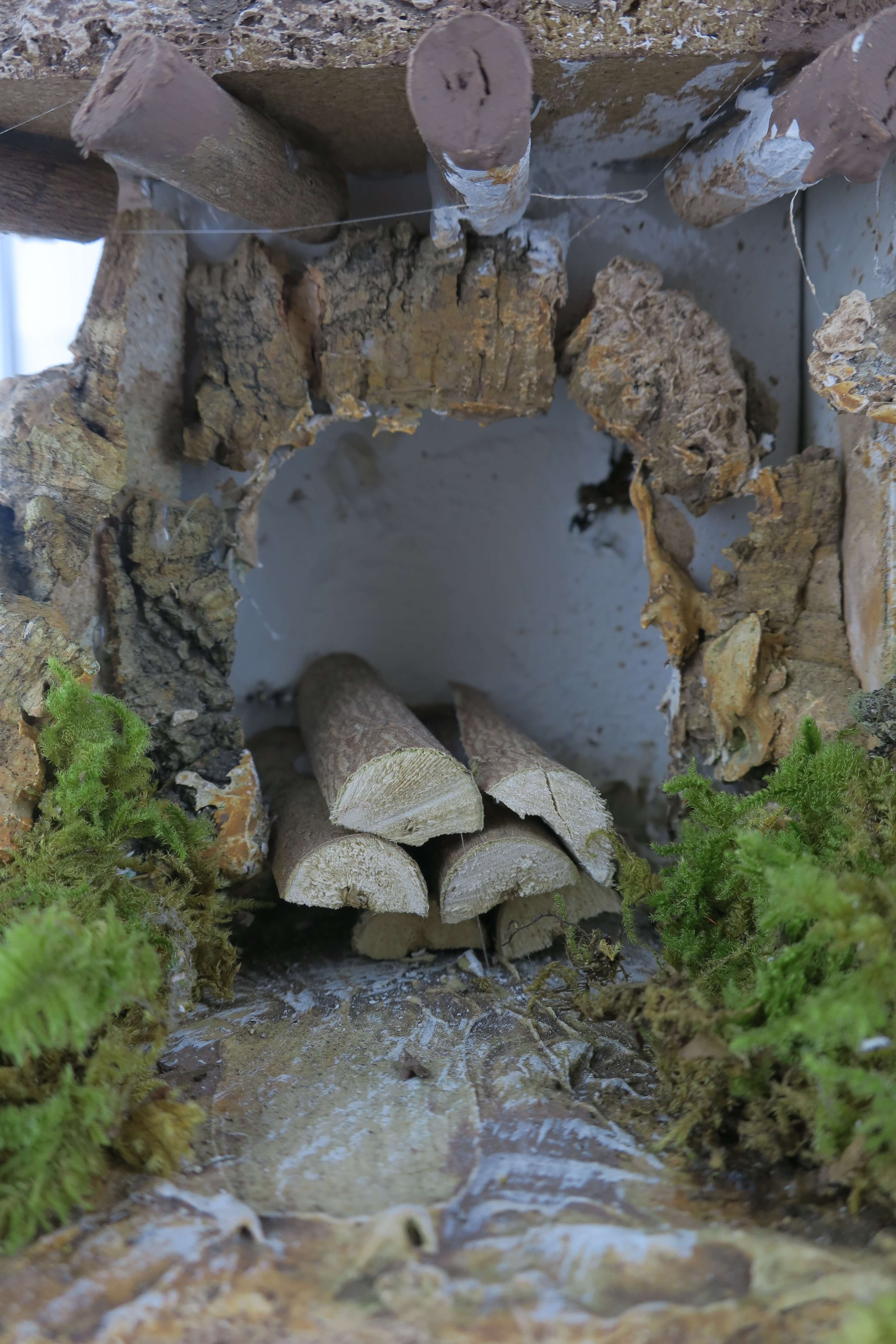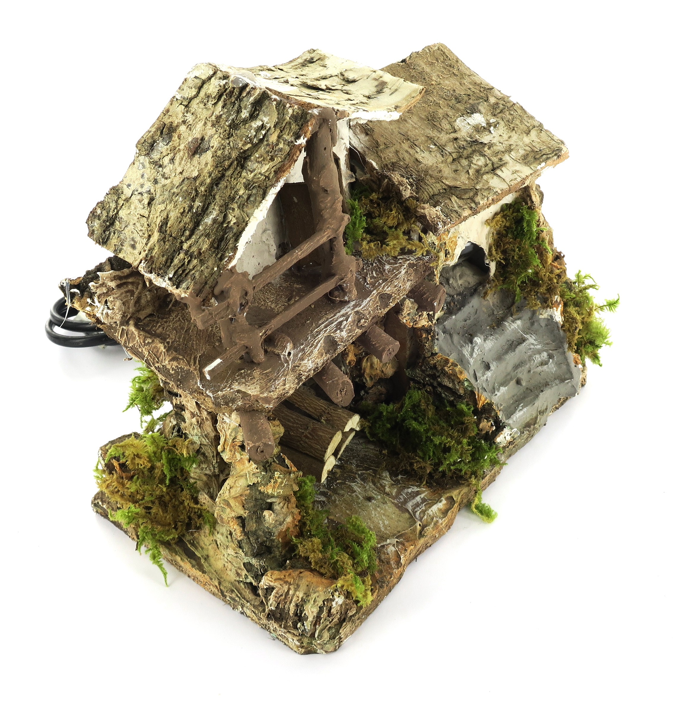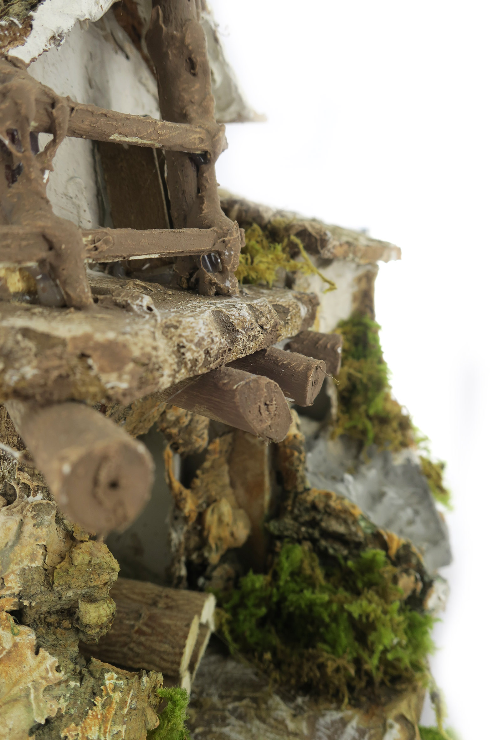 Accessori per presepe: Casa di campagna con fuoco elettrico (alimentazione elettrica 220 V). Dimensioni: 16 x 22 x 18 cm. Materiali: legno, stucco, sughero, cartone e muschio. Realizzato artigianalmente in Italia.