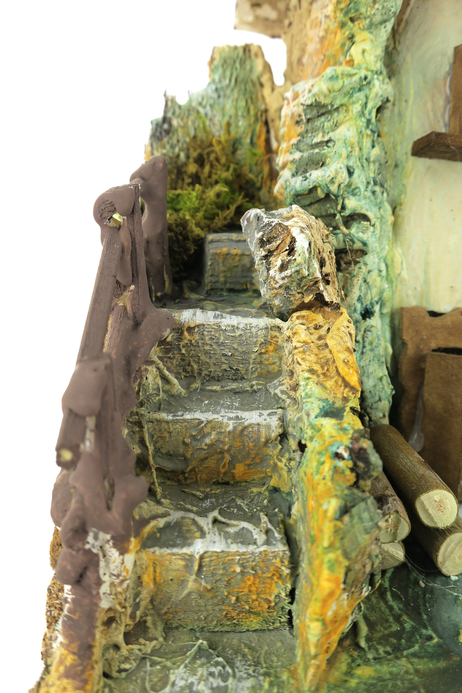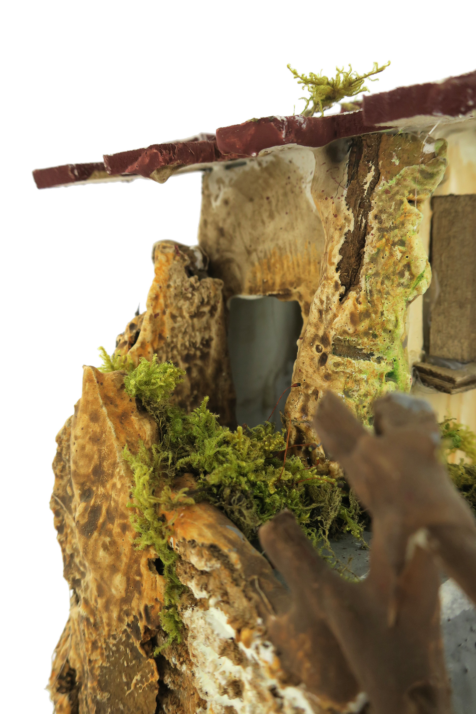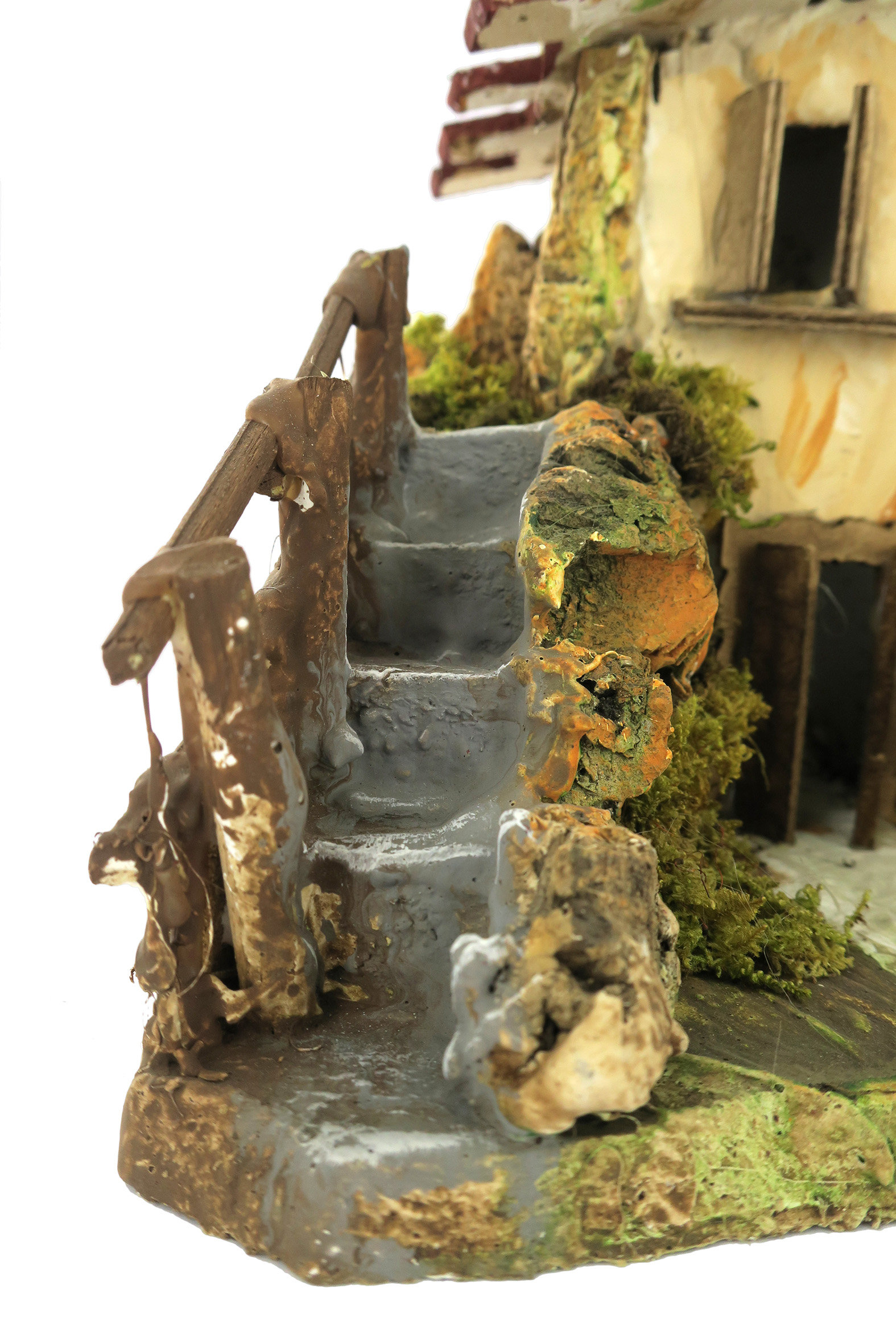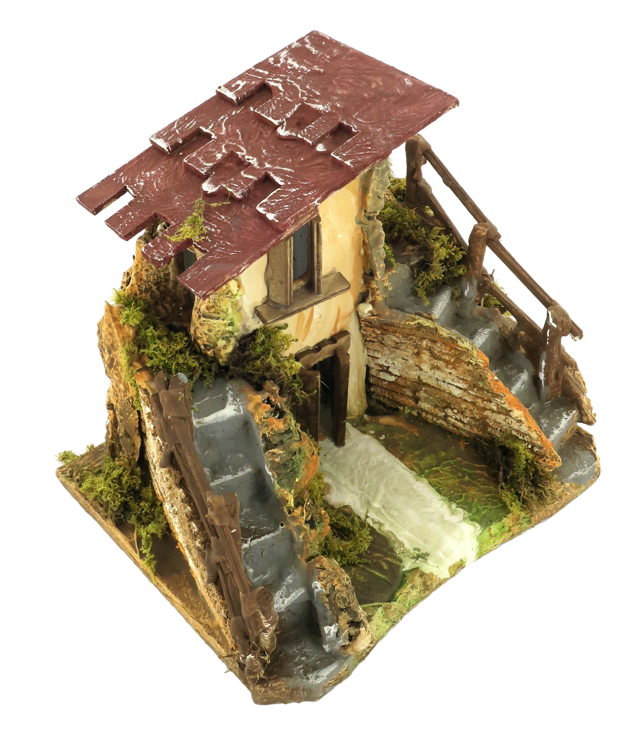 Accessori per presepe: Casetta rustica con doppia scalinata. Questo elemento di arte presepiaria rappresenta un bellissimo accessorio per il vostro presepe natalizio. Consta di una casa a di forma allungata, a mo' di torretta, con tetto spiovente, ingresso centrale, una finestrella al piano superiore e due piccole scalinate ai lati dell'edificio. A completare questo articolo per presepe, dettagli come superfici di muro con mattonelle e elementi vegetali ricreati grazie al sapiente utilizzo di muschio, atto a ricreare l'effetto erba spontanea che cresce lungo i muri delle case. I dettagli, tra cui i passamani delle scalinate, rendono questo oggetto molto caratteristico e decorativo. Se ne consiglia l'uso insieme ad altri edifici della medesima linea, in modo da ricreare Dimensioni: 20 x 15 x 17 cm. Realizzato artigianalmente in Italia.