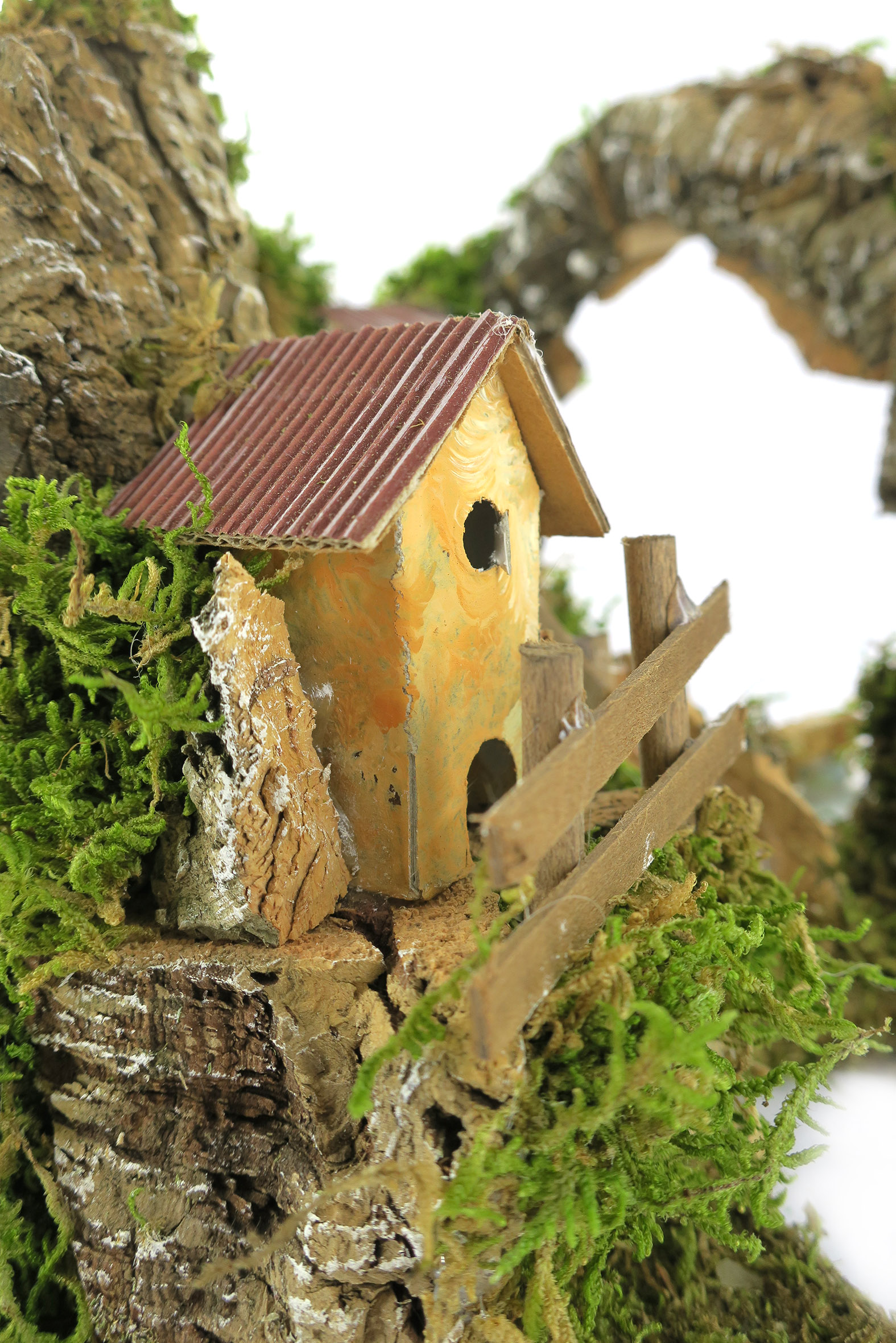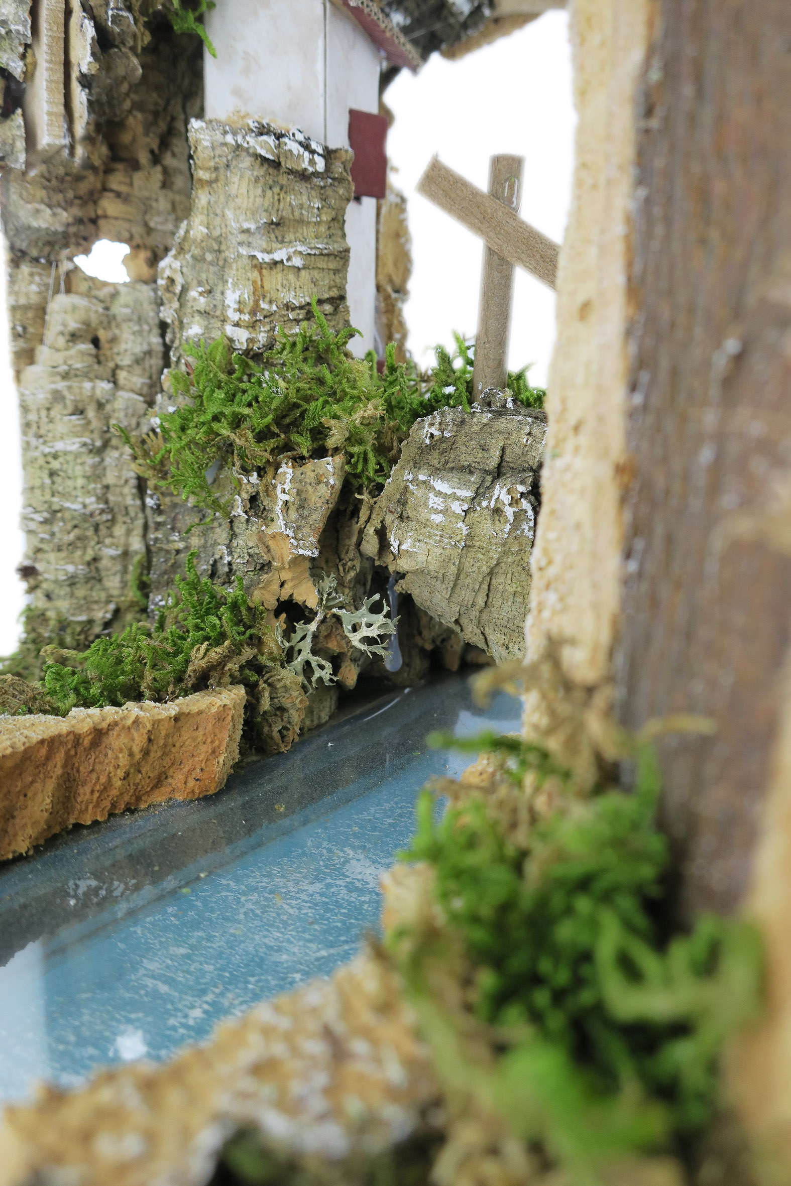 Accessori per presepe: Gruppo di case su roccia, con tratto di fiume componibile. Materiali: legno, sughero, muschio e stucco. Dimensioni: 22 x 25 x 20 cm. Realizzato artigianalmente in Italia.