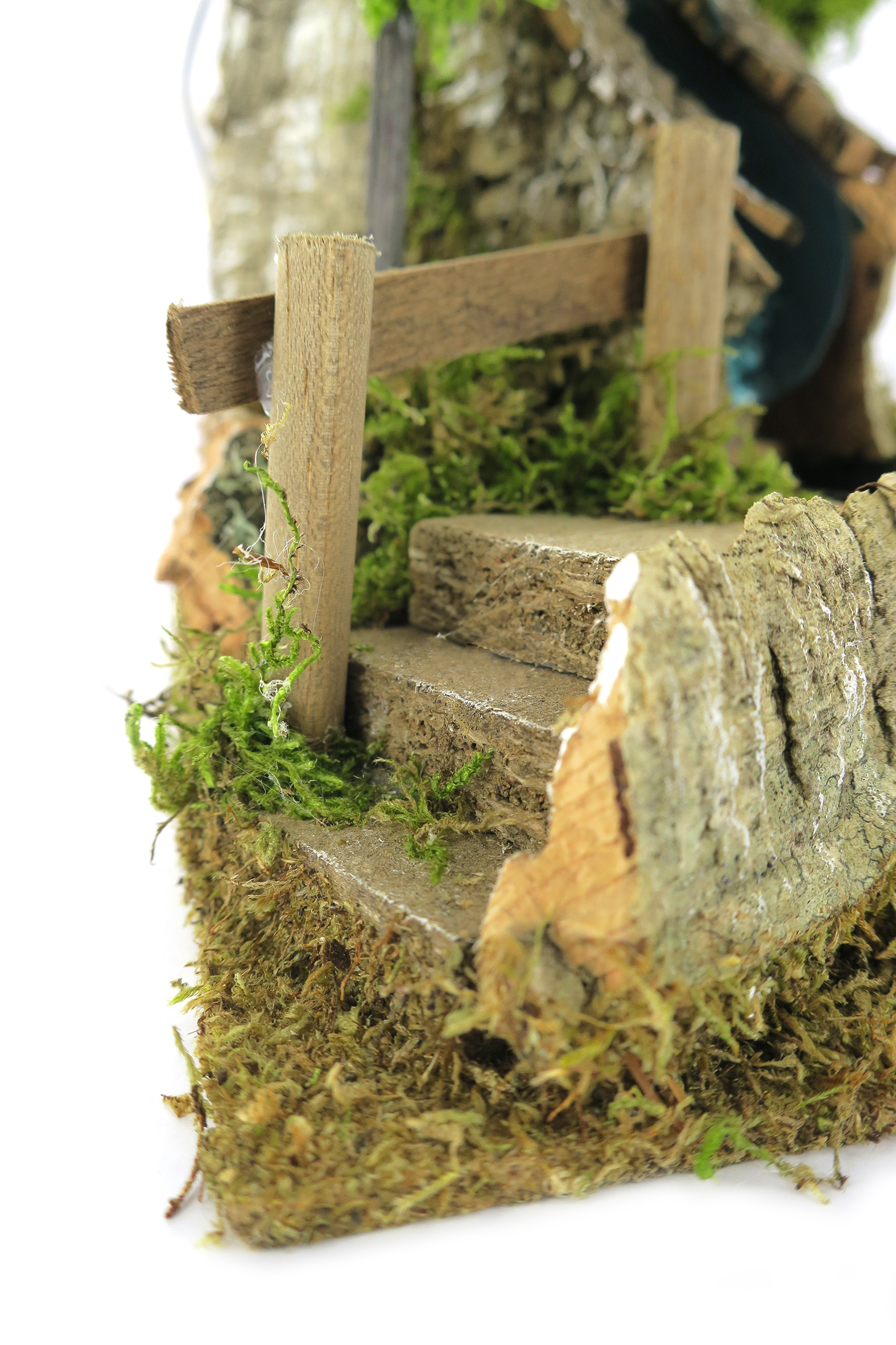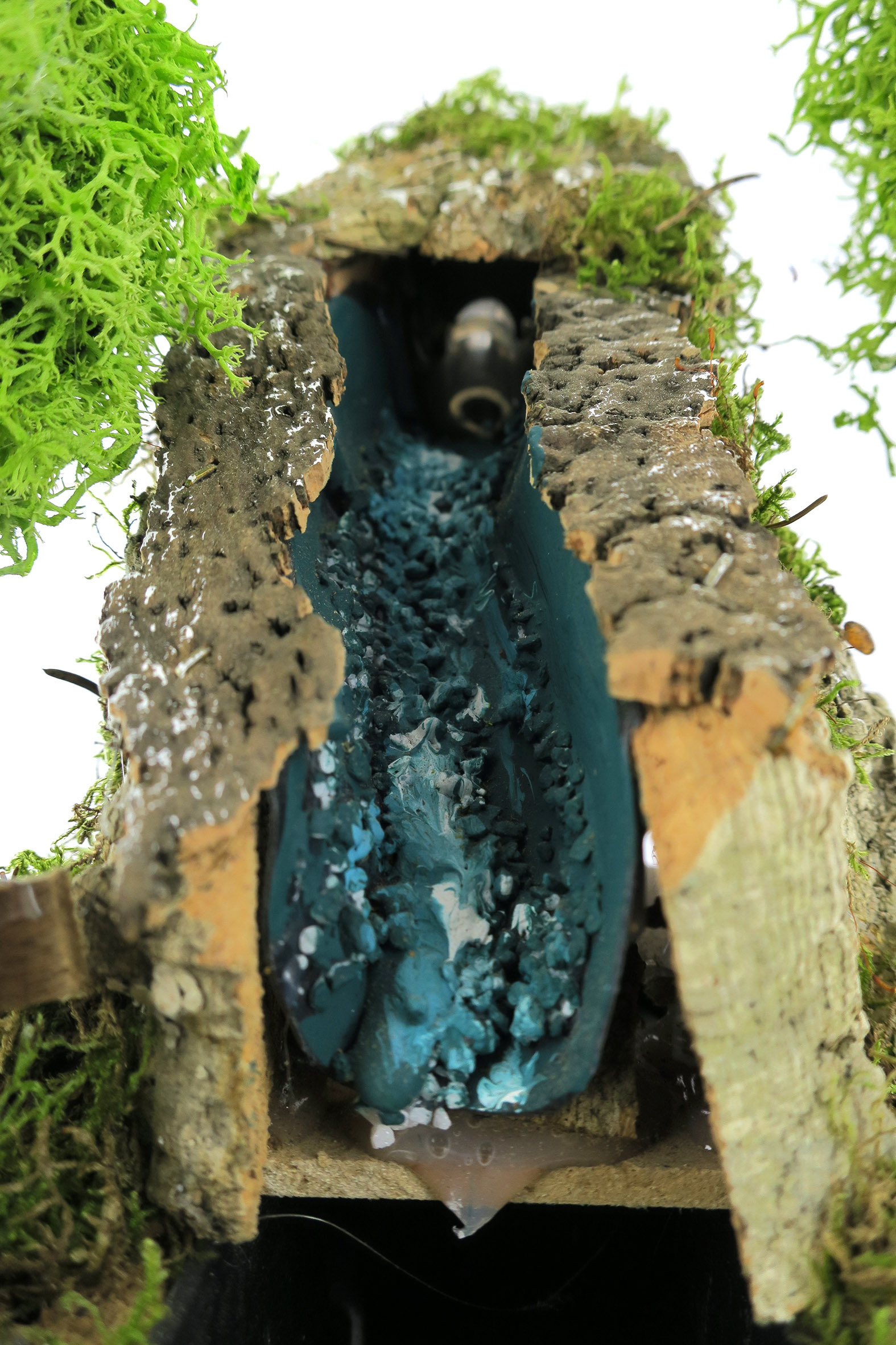 Accessori per presepe: Cascata ad acqua con albero (alimentazione elettrica 220 V). Dimensioni: 20 x 21 x 15 cm. Materiali: legno, sughero, muschio e lichene. Realizzato artigianalmente in Italia.