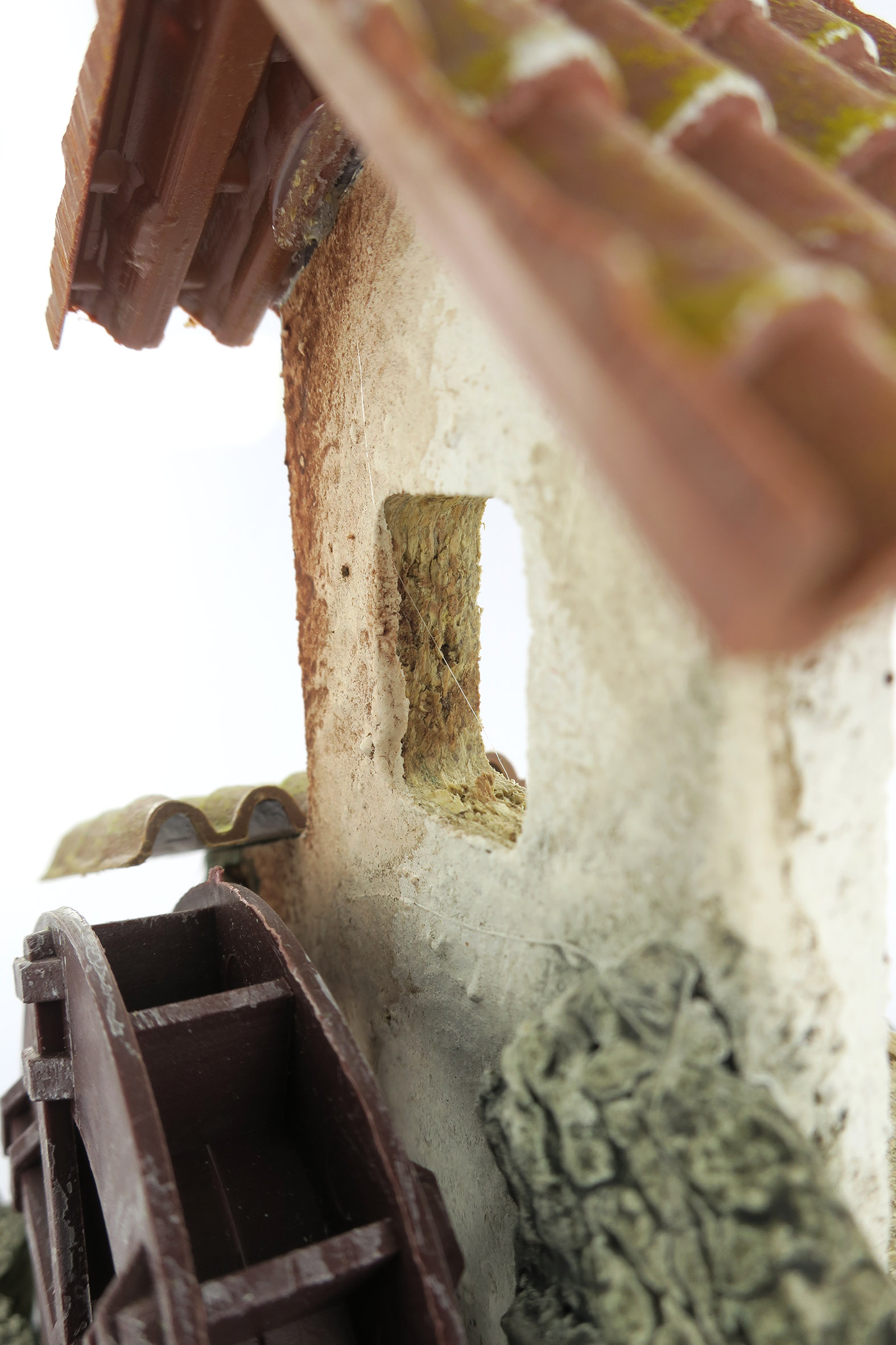 Accessori per presepe: Mulino con ruota che gira, alimentazione elettrica 220V. Il mulino è su un tratto di fiume.