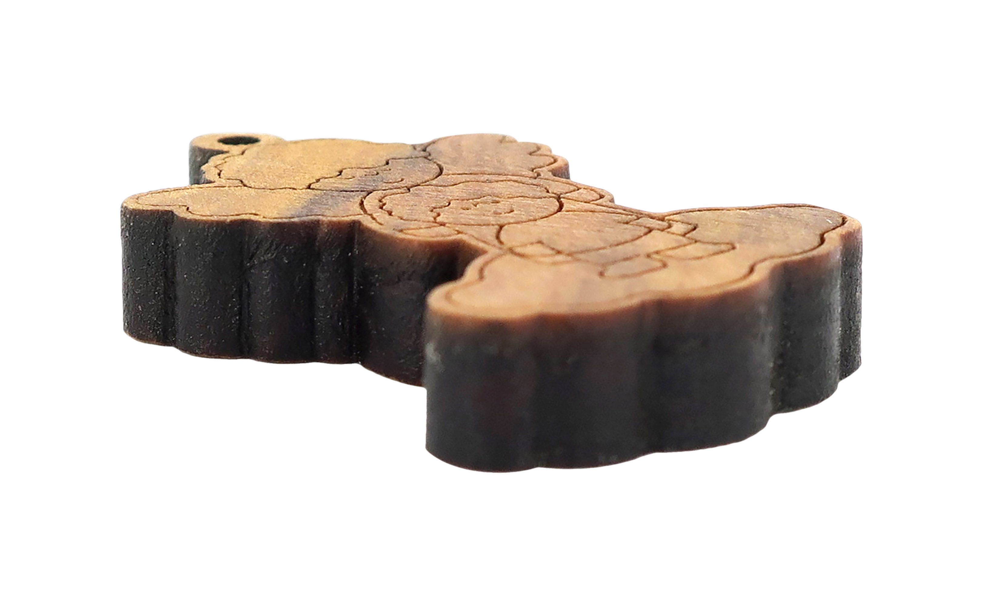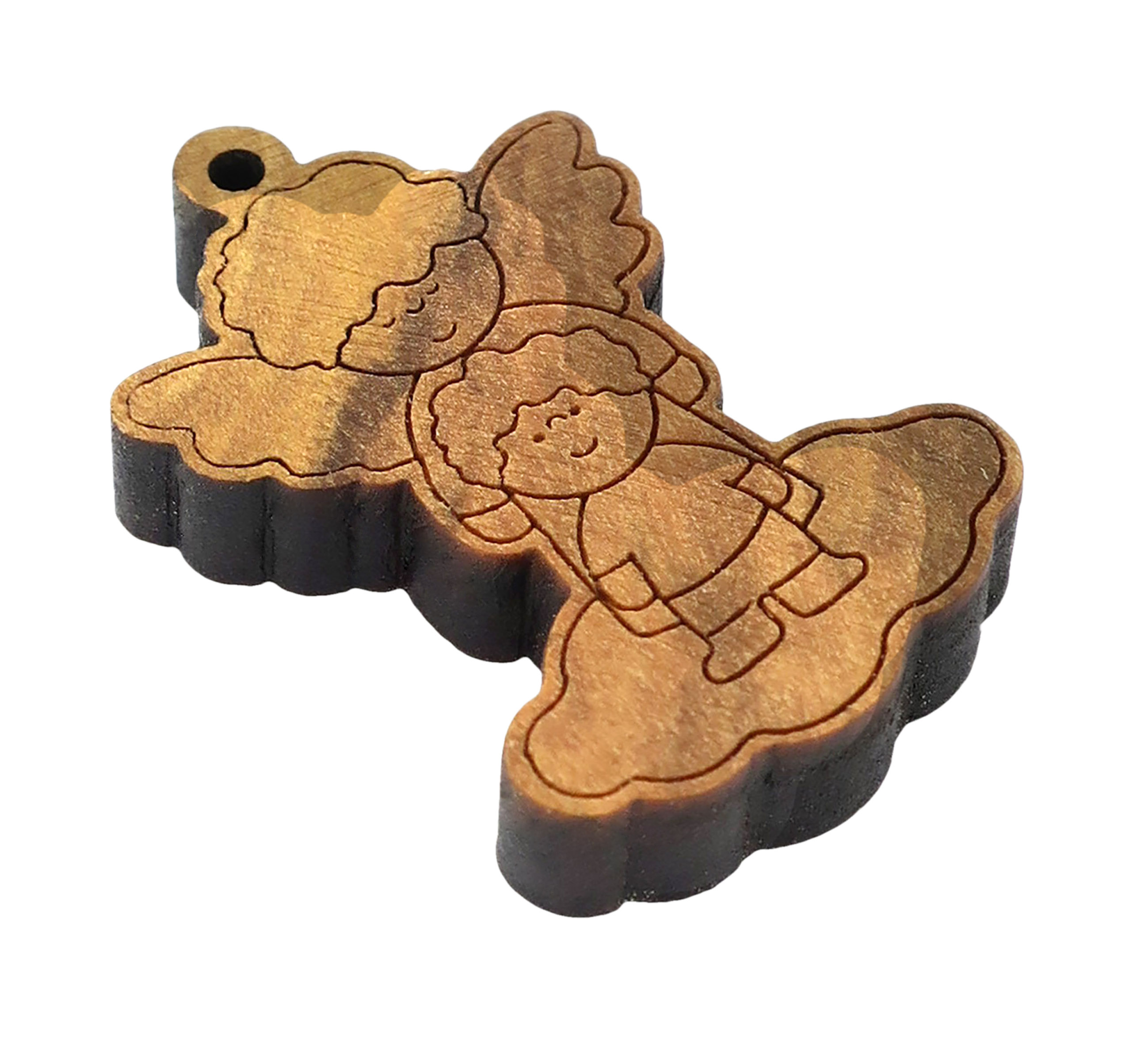Ciondolo in legno d'ulivo sagomato raffigurante l'Angelo Custode con il bambino.