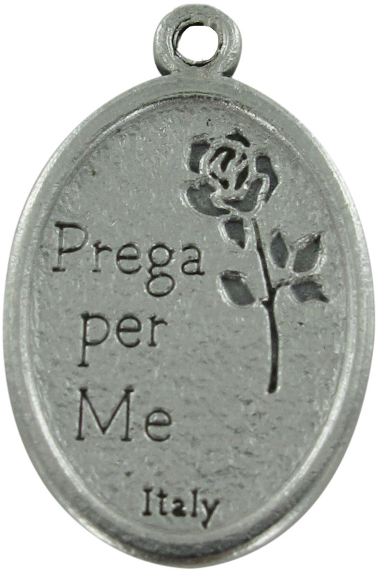 Lo sfondo della medaglia smaltato è di color azzurro. Sul retro è scritto "Prega per me".