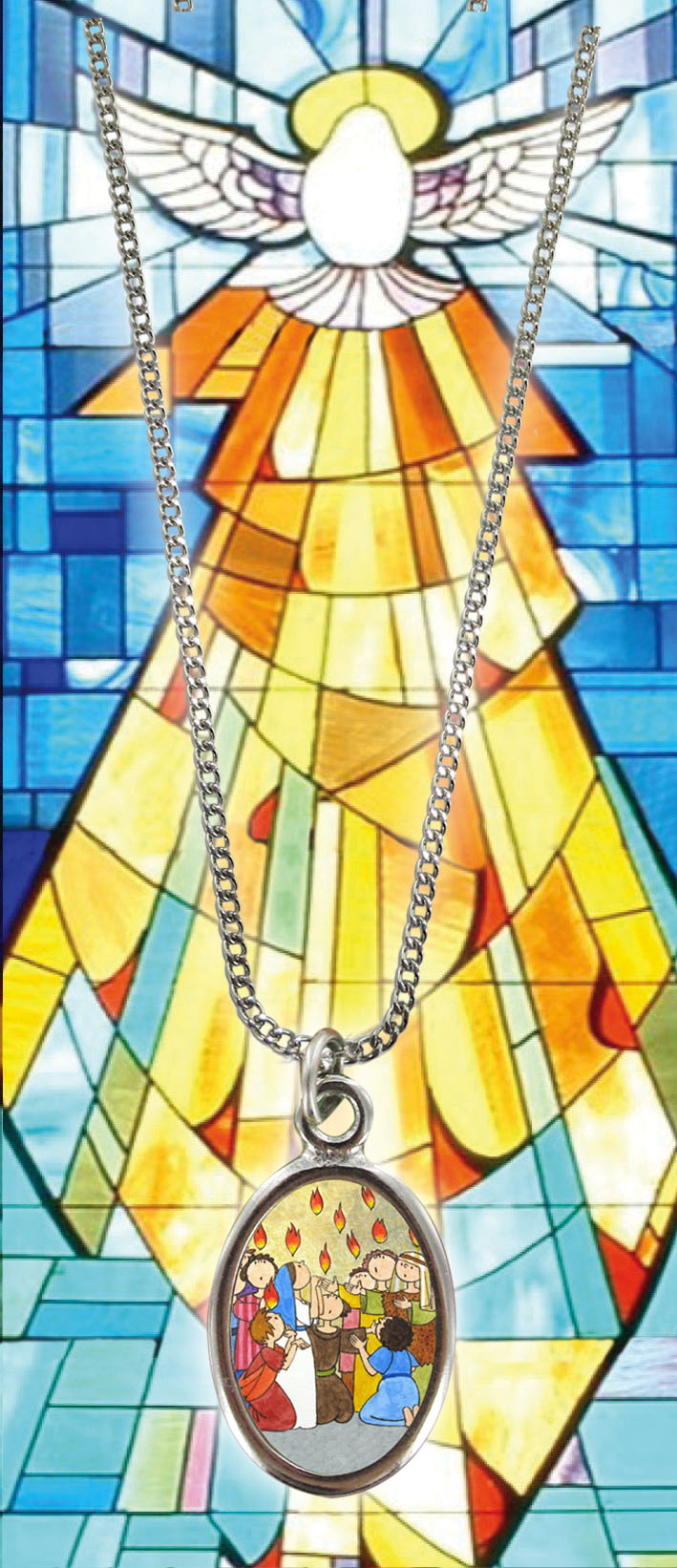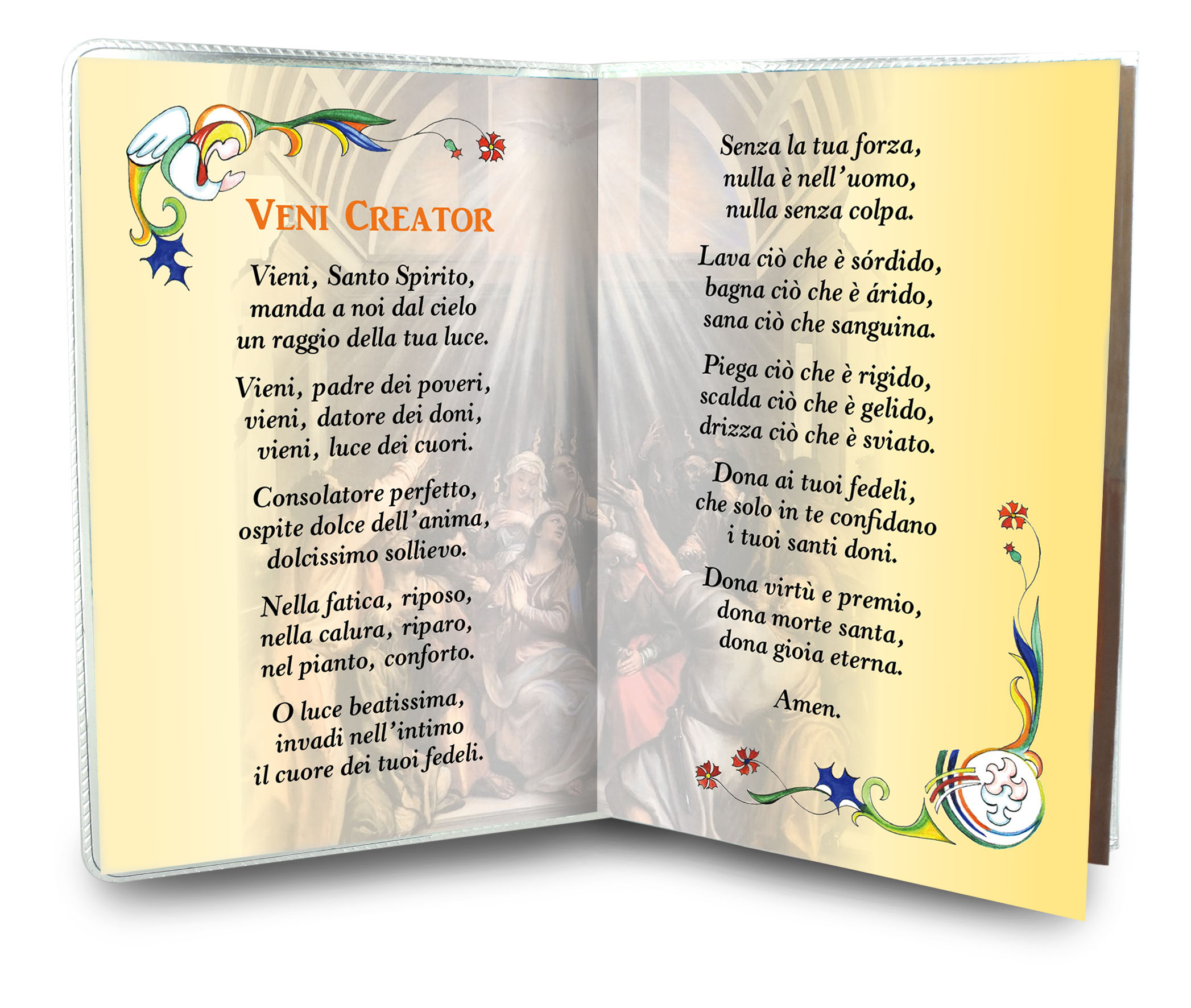 Il libretto ricordo, adatto a cresimandi di lingua italiana, si presenta rivestito da una copertina in plastica trasparente, dotata anche di scomparto in cui è contenuto una catenina con medaglia pendente colorata. Il ciondolo resinato raffigura dei cresimandi che ricevono lo Spirito Santo sotto forma di fiammelle. In copertina viene rappresentata la colomba dello Spirito Santo, da cui discendono i famosi 7 doni (Sapienza, Intelletto, Consiglio, Fortezza, Scienza, Pietà, Timore di Dio), scritti in color oro. Il libretto, al suo interno, spiega il significato del Sacramento della Cresima e riporta la preghiera "Veni Creator".
