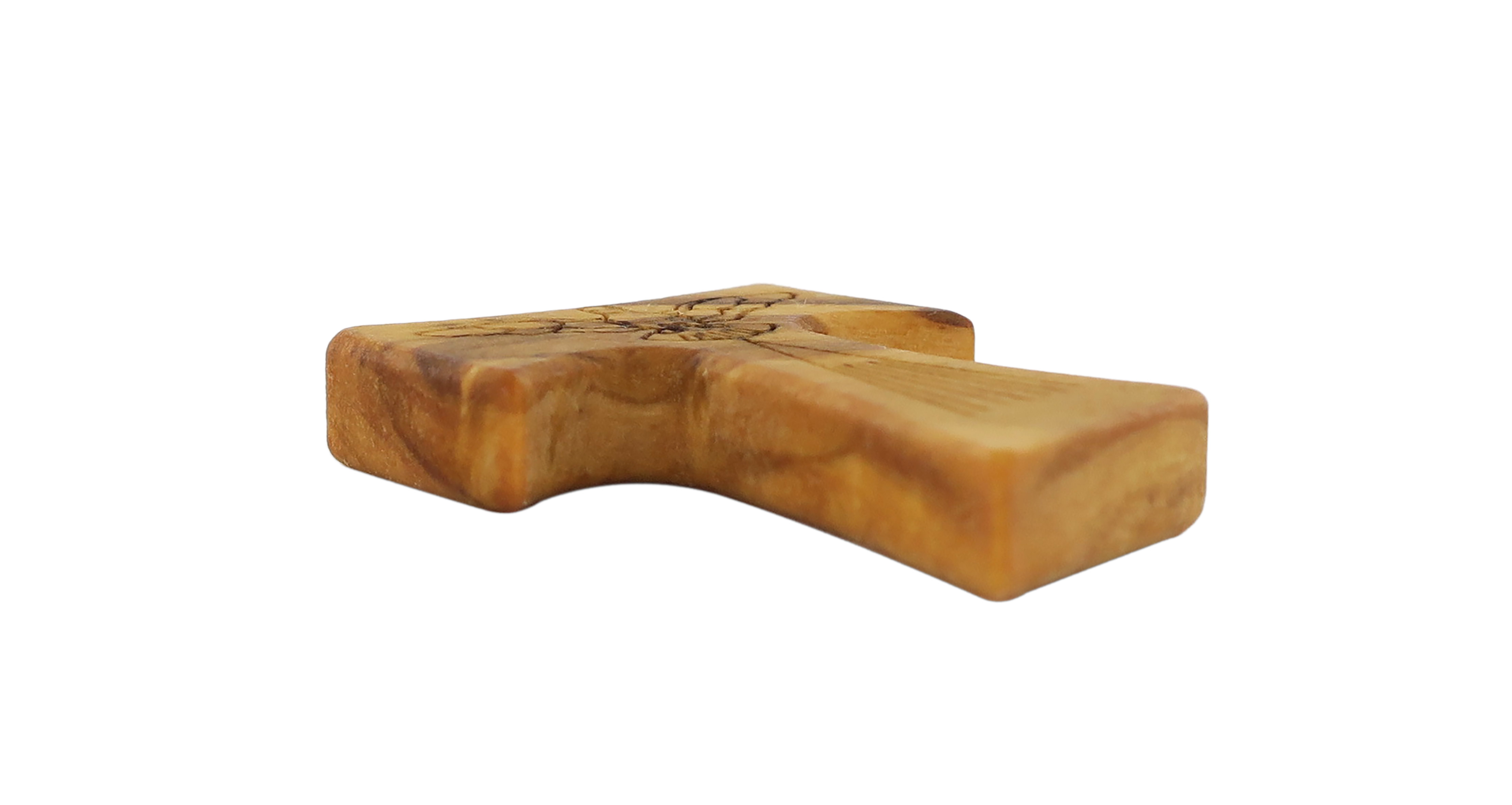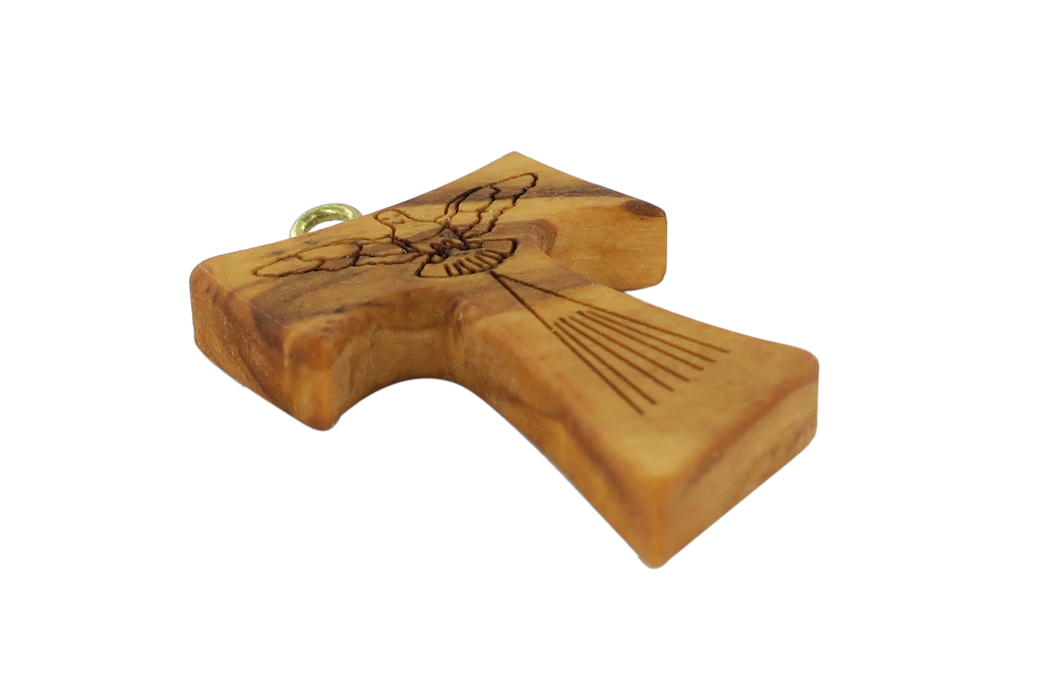 Croce Tau di San Francesco d'Assisi in legno d'ulivo con raffigurato il simbolo dello Spirito Santo.
