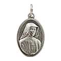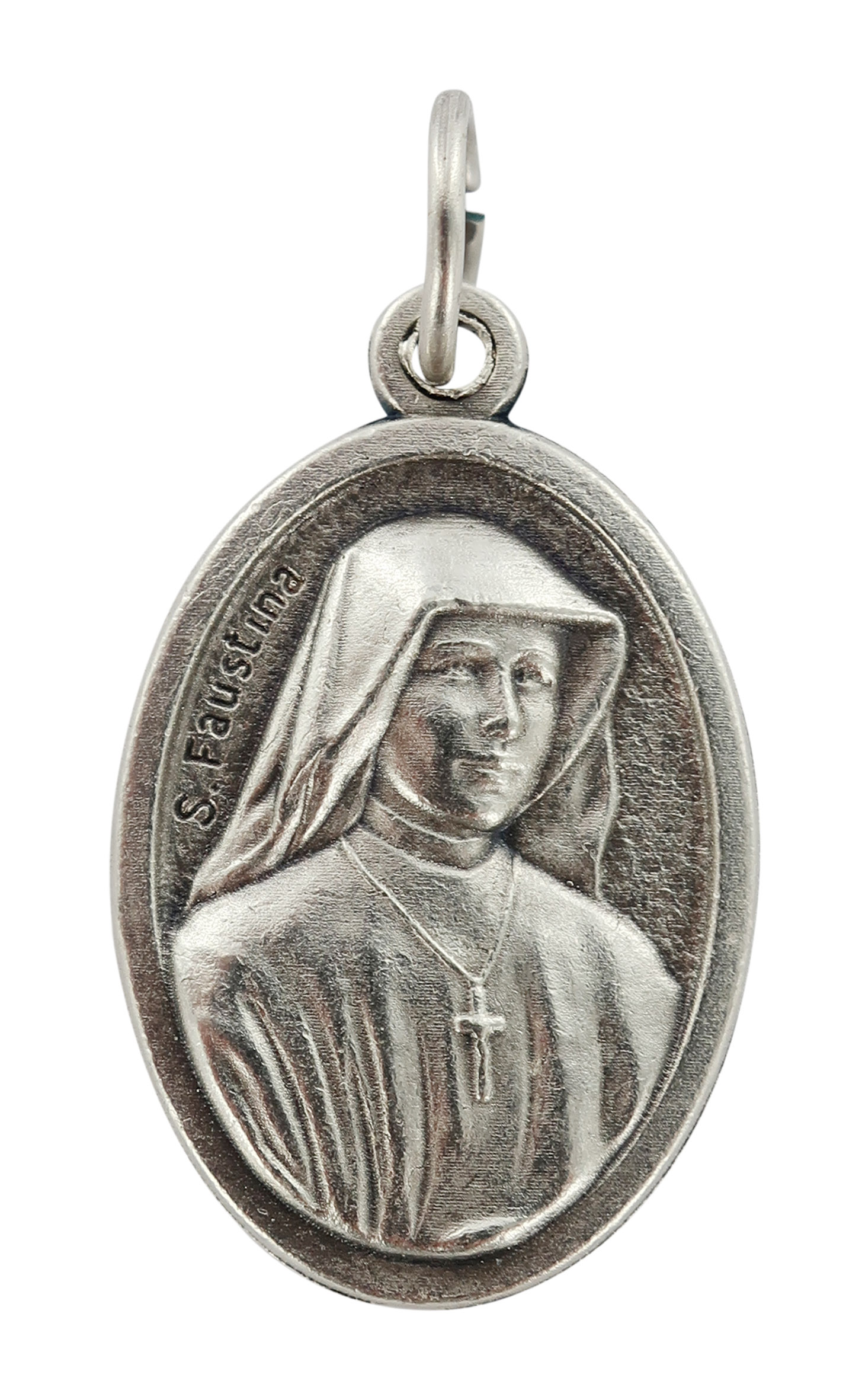 Medaglia ovale in metallo ossidato raffigurante su una faccia Gesù Misericordioso e sull'altra S. Faustina, di misura 2,5 x 1,5 cm.
