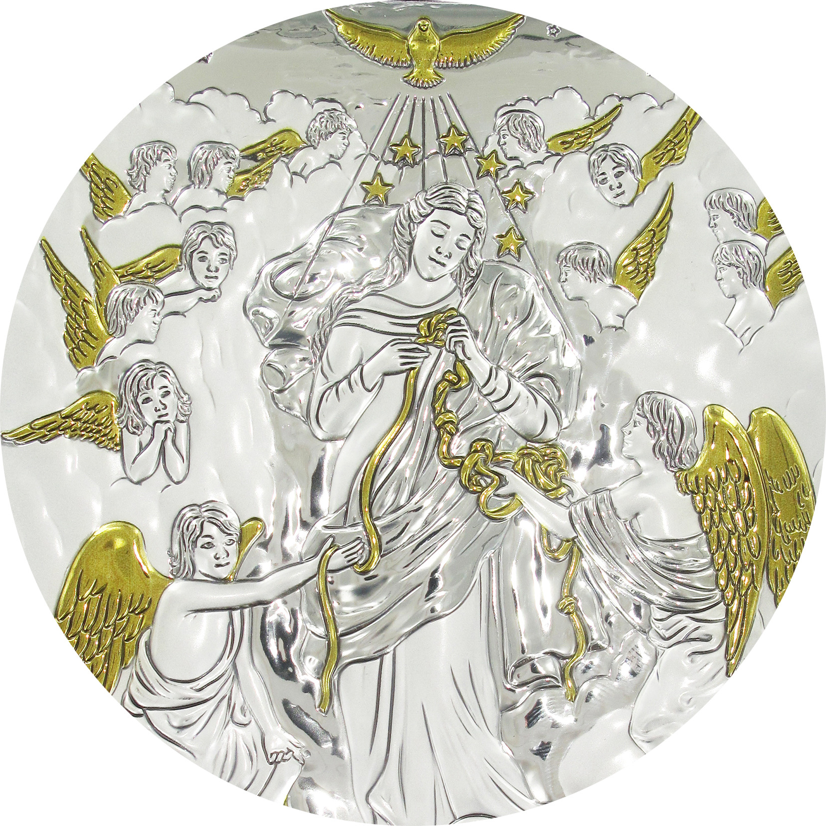 Bassorilievo con argento 999, di forma rettangolare, e dettagli in color oro. La lamina di metallo prezioso è applicata su una lastra di metallo comune fissata ad un supporto in legno. Il quadro rappresenta la Madonna che scioglie i nodi. La Vergine è intenta a sbrigliare una corda mentre schiaccia una serpe col piede e divide la scena con vari angioletti. Figura particolarmente cara a Papa Francesco, che vide a Ingolstadt e ne diffuse la devozione a partire da Buenos Aires, indossa vesti ricchissime di pieghe. In tale rappresentazione, i nodi simboleggiano le problematiche della vita da risolvere anche con il supporto della fede. Risaltano molto bene i dettagli in color oro: la colomba dello Spirito Santo, le stelle intorno al capo della donna che formano un'aureola, la corda nelle sue mani, le ali degli angioletti che la accompagnano e il borgo in lontananza.