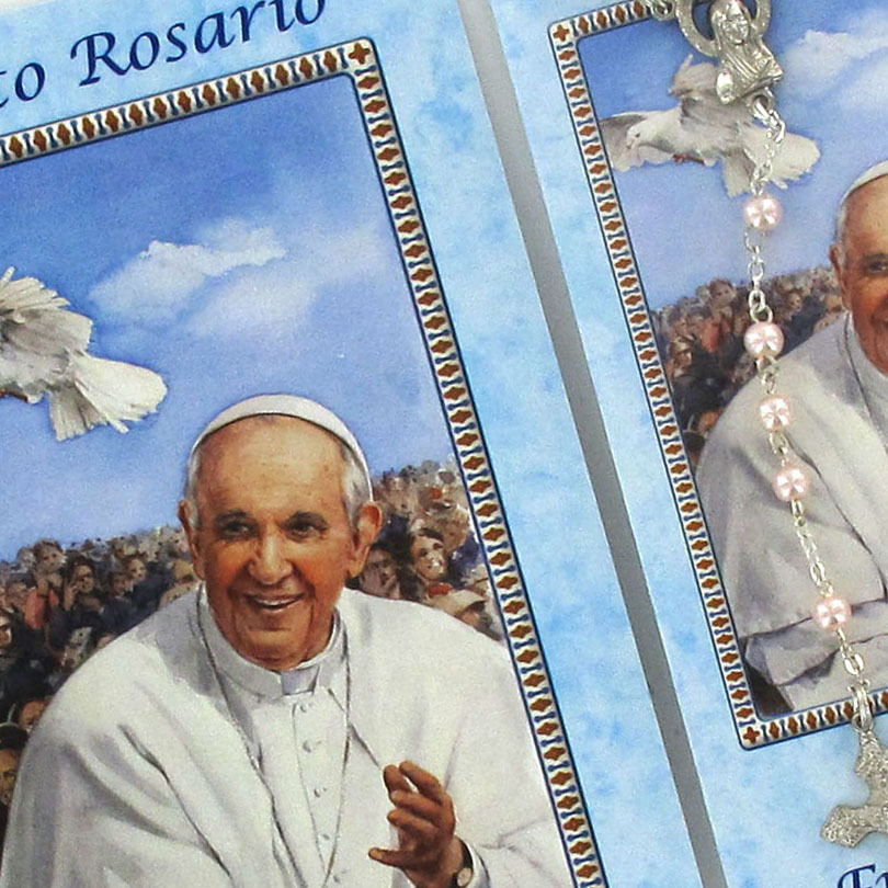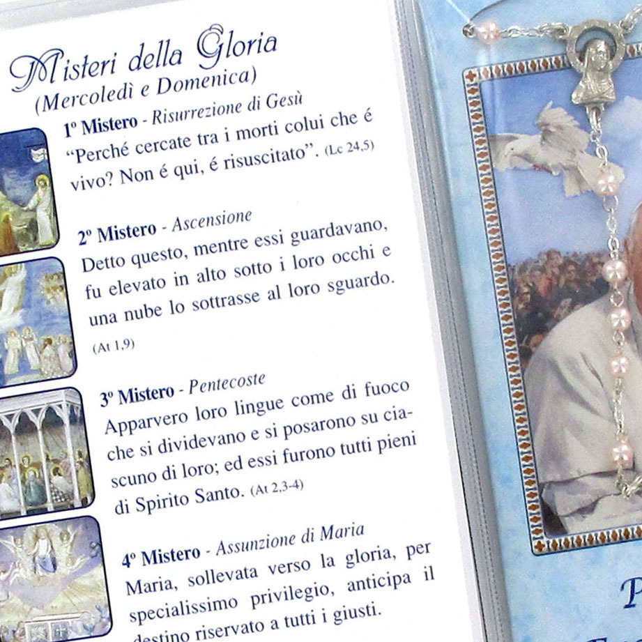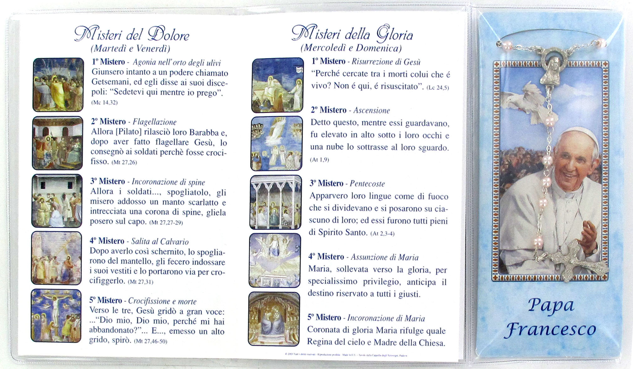 Il libretto, composto da 8 pagine, si presenta con una copertina in plastica trasparente e nell'interno vi è un piccolo rosario con i grani tipo perlina del diamero di mm 4.