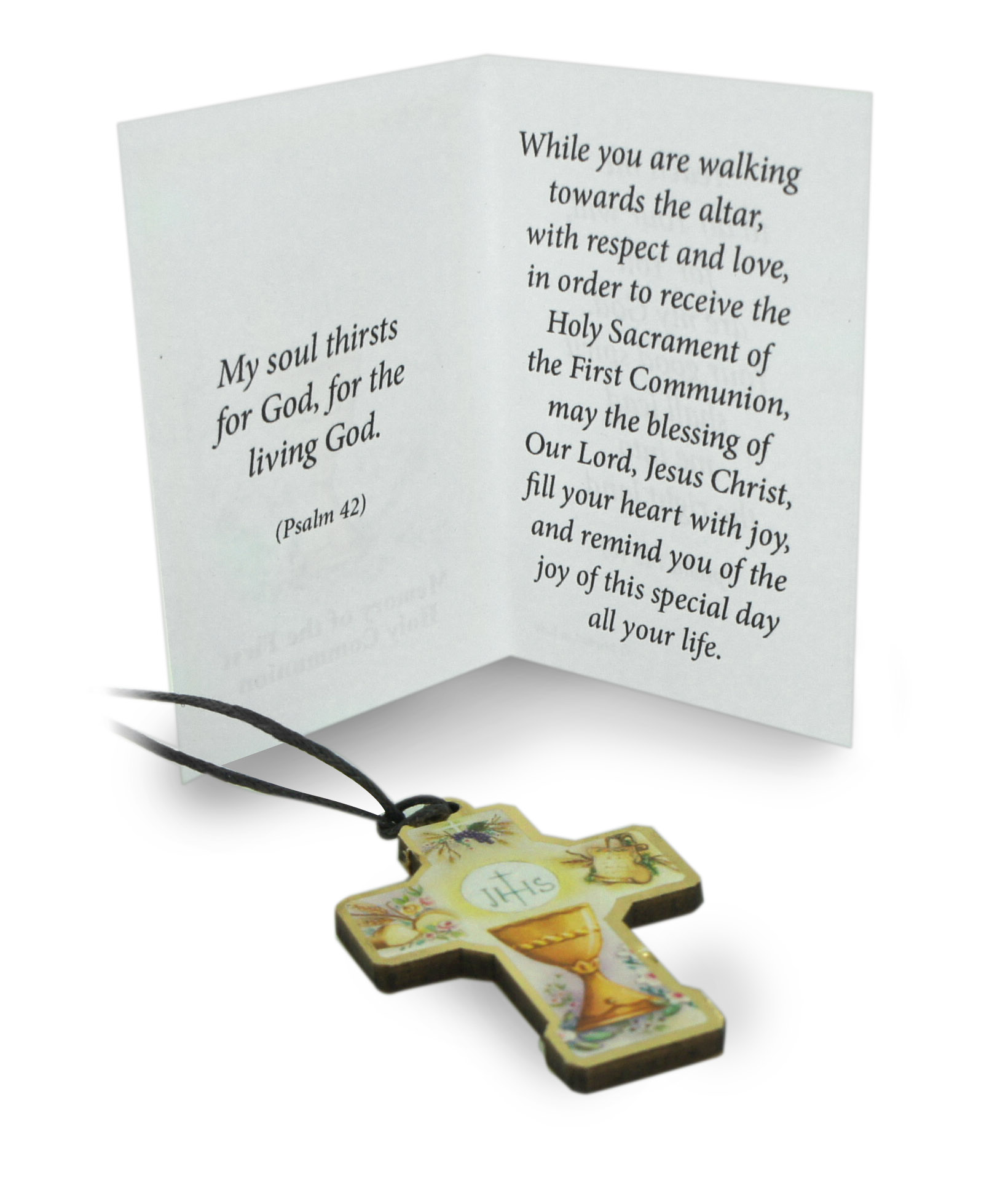 Croce in legno mdf raffigurante i simboli della Prima Comunione con cartoncino che ricorda questo sacramento.