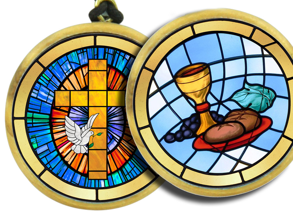 Il ciondolo è costituito da un medaglione tondo in ulivo con da un lato i simboli della Comunione serigrafati e dall'altro quelli della Cresima.