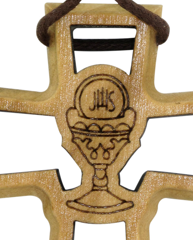 Bomboniera comunione: Croce in legno d'ulivo traforata con calice - 4,7 cm