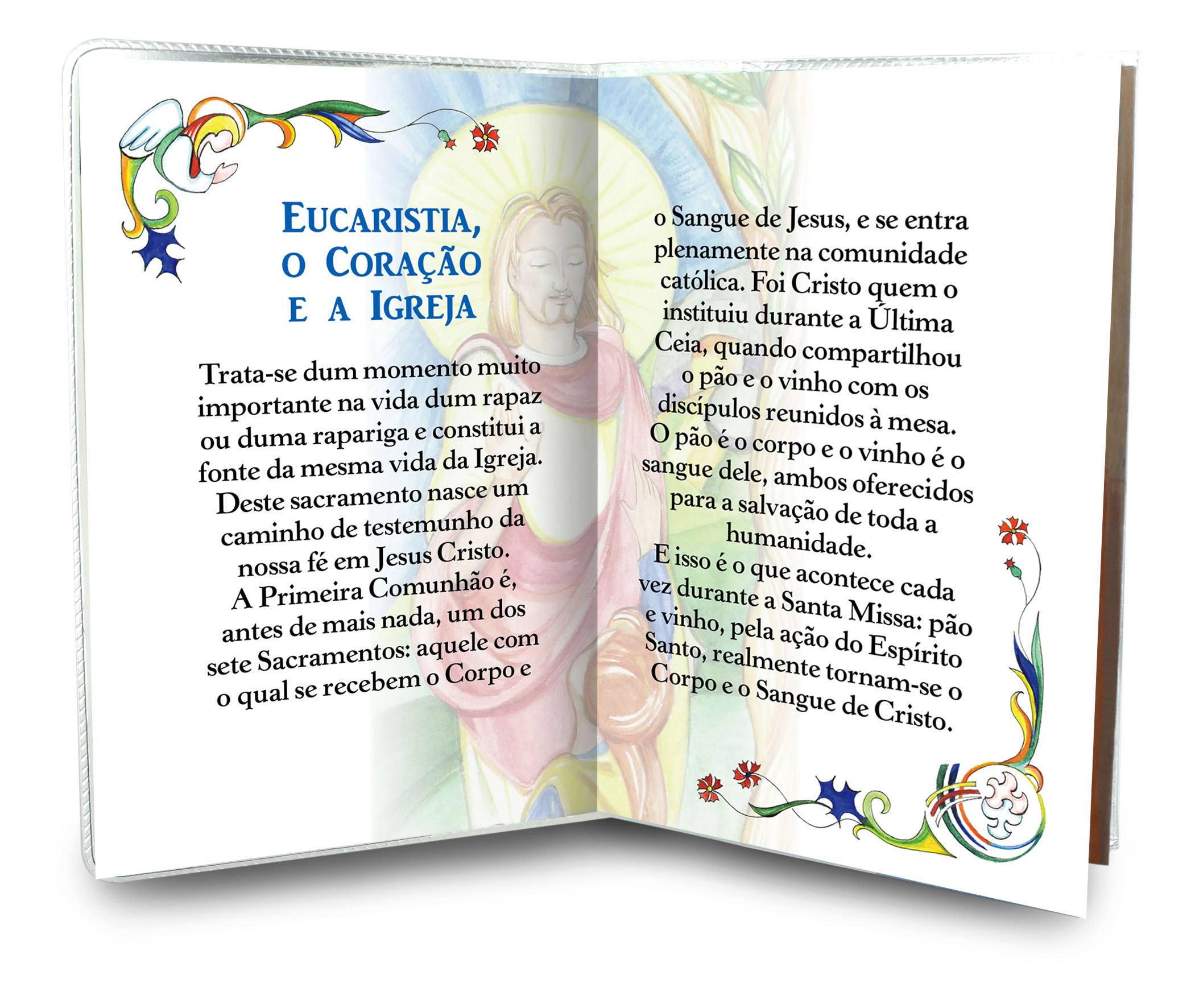 Il libretto è destinato a comunicandi di lingua portoghese e si presenta rivestito da una copertina in plastica trasparente, dotata anche di scomparto in cui è contenuta una catenina a perline (diametro di 2 mm). La collanina ha una medaglietta dell'eucaristia, che raffigura la scena in cui Gesù è a tavola coi discepoli con pane e vino. Nell'interno del libretto vi sono delle pagine in cui si spiega il significato della Prima Comunione. Vi è pubblicata anche una preghiera. Sia sul retro, sia nella sezione dove c'è la medaglia, è pubblicato il Padre Nostro. La catenina ha una circonferenza di 58 cm e non può essere slacciata: va infilata dalla testa.