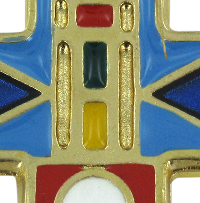 Pendente Croce di misura 3,5 x 2,5 con cordoncino imitazione cauciù nero. La croce è in metallo dorato ed ha motivi geometrici smaltati in colore blu di varie tonalità.