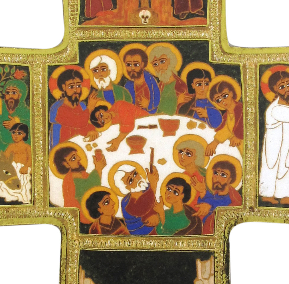 Croce realizzata in mdf raffigurante al centro l'ultima cena con cordinoncino per poter essere appesa alla parete.