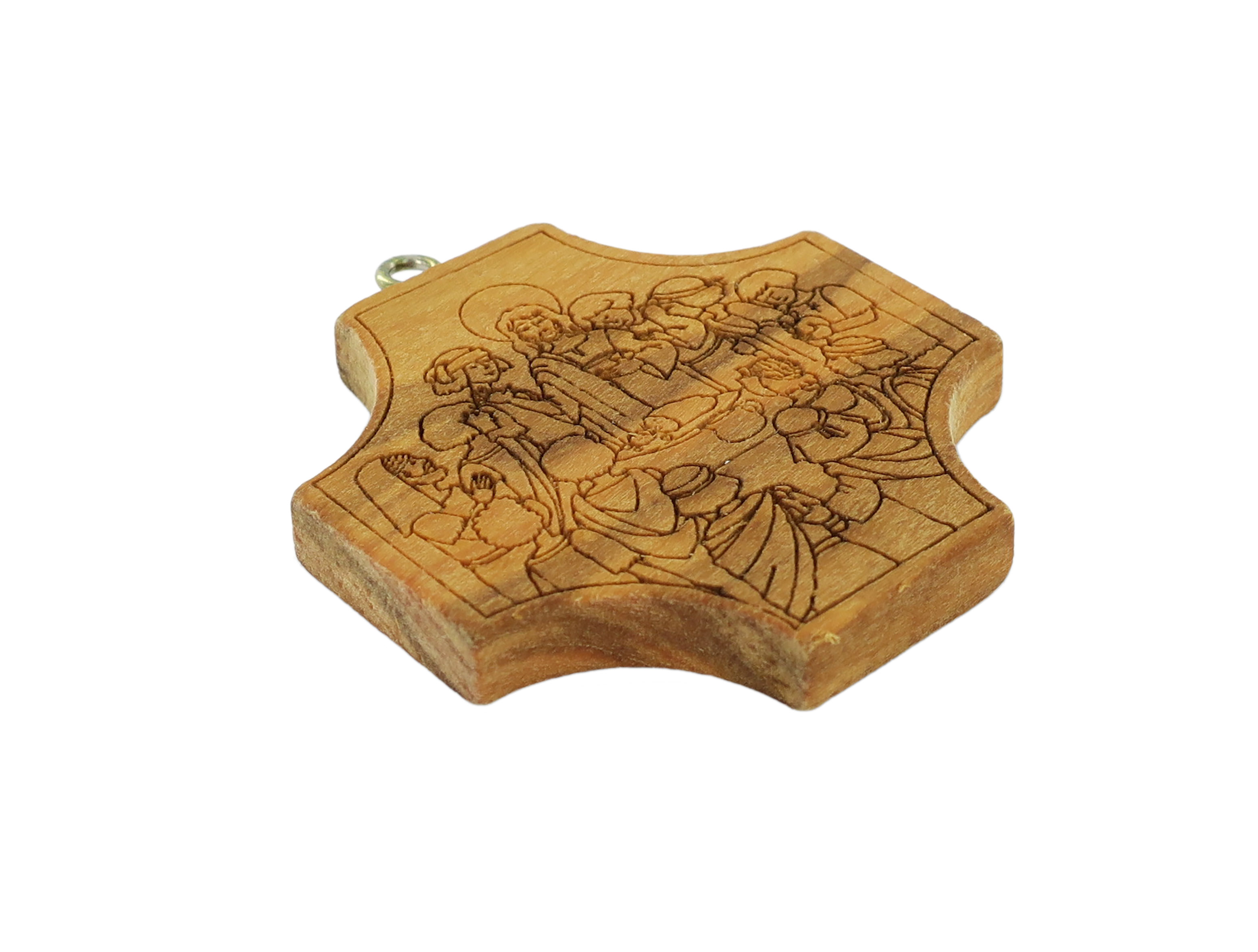 Croce in ulivo con raffigurata l'Ultima Cena di cm 5 x 5. Viene consegnata con il suo cordino.