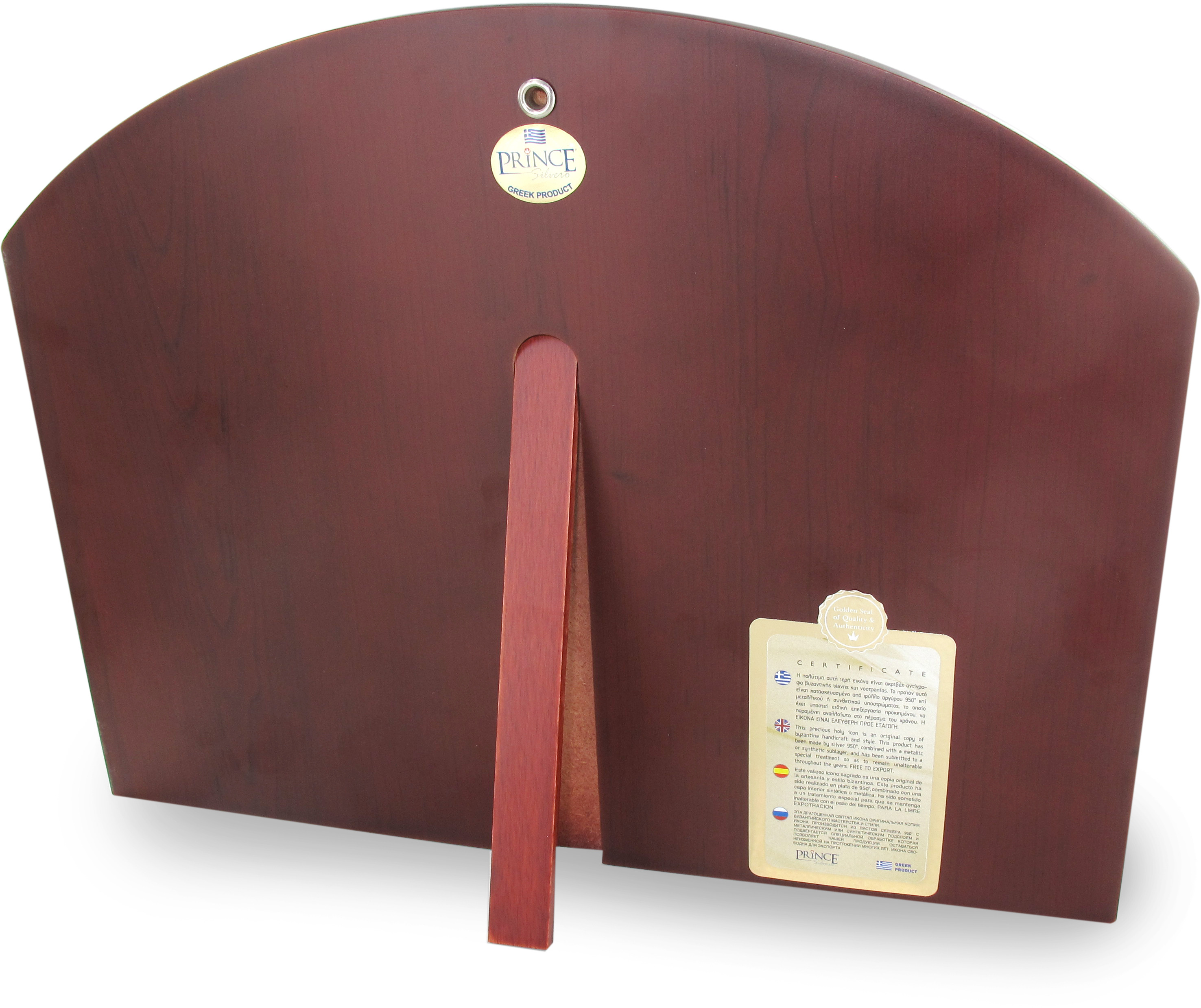 L'icona è inserita in un quadro ad arco di legno color mogano, sul retro vi è la possibilità che l'icona oltre che ad essere appesa al muro, possa essere appoggiata su di un piano.