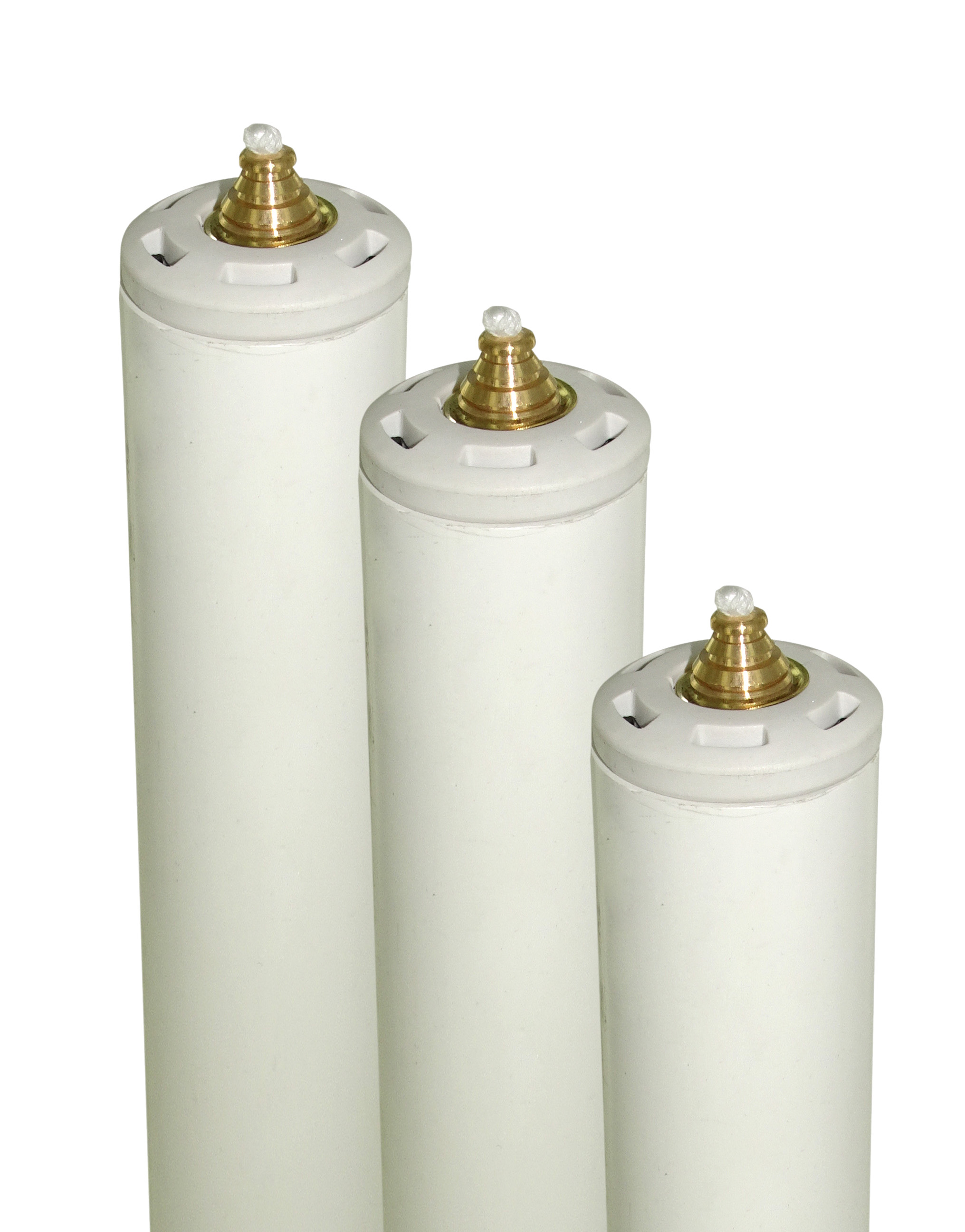 Finta candela a cera liquida realizzata in PVC. Dimensioni: 4 cm di diametro e 60 cm d'altezza. La candela è completa di cartuccia con stoppino e gigler. Sulla cartuccia interna sono indicati i livelli con la relativa durata. Questo prodotto è disponibile anche in altre misure (la candela è sempre di diametro 4 cm):