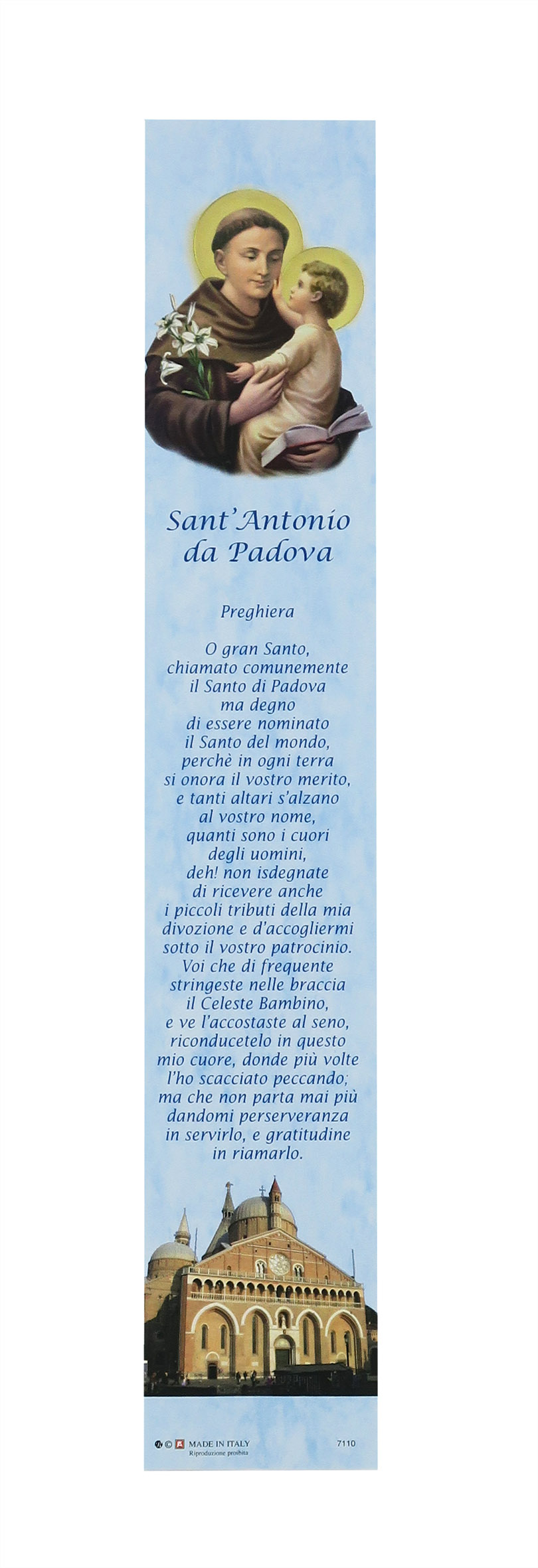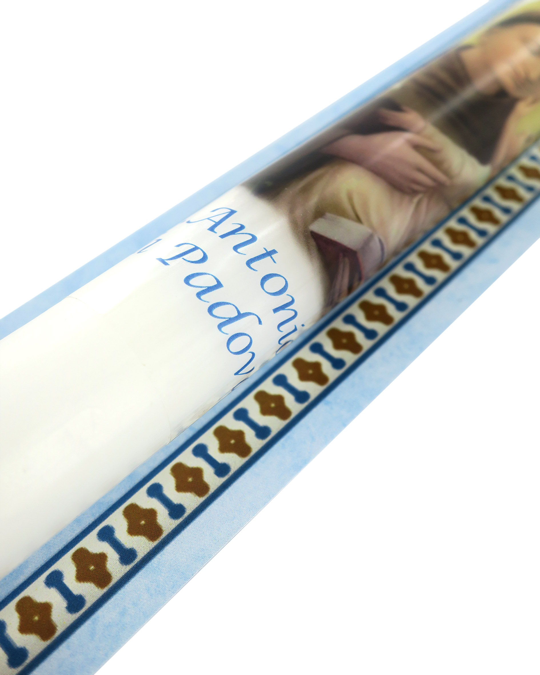Candela bianca fatta a mano in Italia con l'immagine di Sant'Antonio da Padova. È contenuta in un blister che contiene anche l'immagine del Santo e una preghiera a lui dedicata. Sant'Antonio da Padova, noto anche come Sant'Antonio da Lisbona, era un sacerdote dell'Ordine Francescano, predicatore e teologo portoghese, dichiarato santo e "dottore della Chiesa". L'iconografia cristiana attribuisce a S. Antonio alcuni simboli, come la Bibbia e un bastone con dei gigli. È spesso rafigurato con Gesù Bambino tra le braccia. Lo si celebra il 13 giugno.