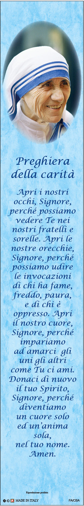 Candela in vera cera in blister con l'immagine di Santa Madre Teresa di Calcutta di cm 4,5x25,5 e cartoncino con stampata la preghiera della carità.