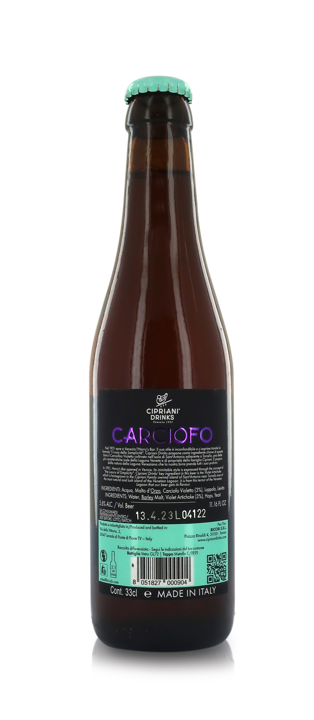 Birra italiana aromatizzata al carciofo veneto violetto dell'isola di Torcello. Il carciofo violetto è un ingrediente unico al mondo, cresce solo nella laguna di Venezia. Cipriani ha sempre valorizzato le materie prime del territorio italiano. Ecco dunque una birra al carciofo, ambrata e dal sapore intenso. Abbinamenti: cibi amidacei come cereali, riso e patate, per un equilibrio perfetto.