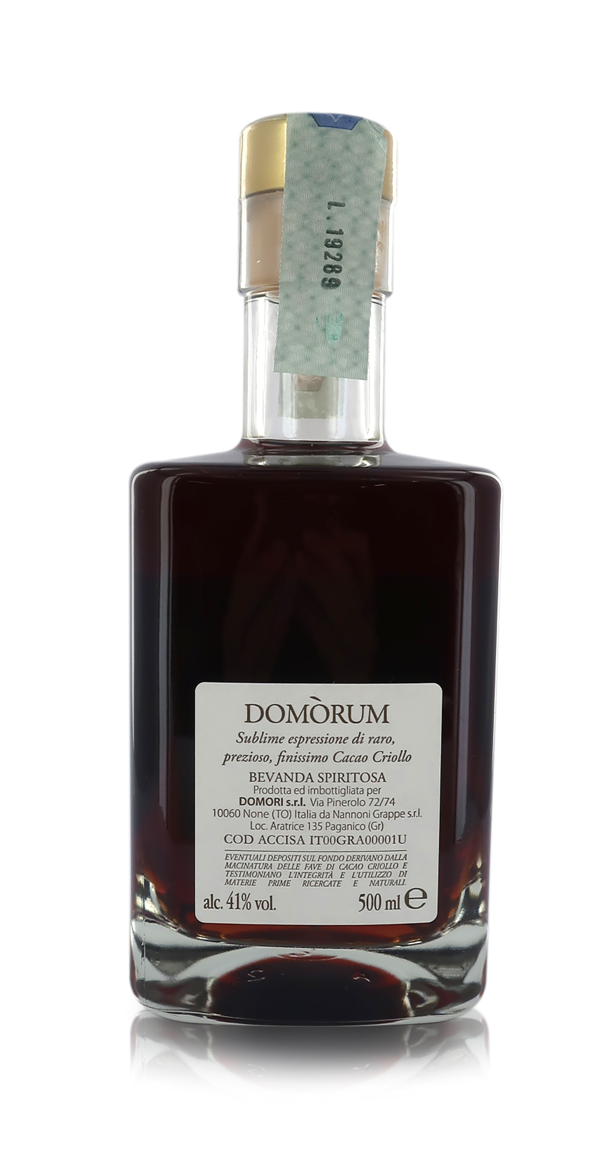Domorum nasce dalla sapiente infusione del Criollo, cacao dalla spiccata aromaticità, cremosità e rotondità. È una bevanda d’acquavite, ideale per accompagnare sessioni di degustazione del pregiato cioccolato Domori. Particolarmente consigliata in abbinamento alle fave di cacao. Bevanda alcolica in bottiglia da 500 ml ottenuta per infusione del cacao Criollo in alcool e brandy invecchiato almeno 5 anni, con successiva diluizione. In elegante confezione con bottiglia di vetro da 50 cl, questo liquore al cacao Criollo di Domori è una perfetta idea regalo per la Festa del Papà o per altre festività quali Pasqua o Natale. Gradazione alcolica: 41%. Conservare in luogo fresco, asciutto e al riparo dalla luce.